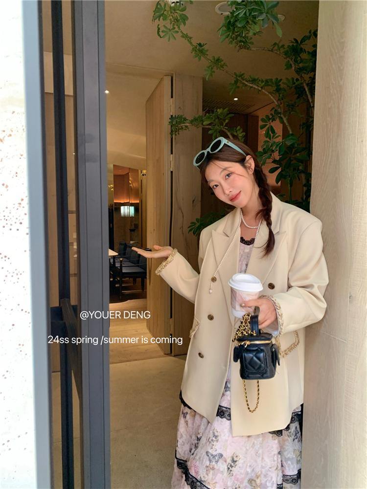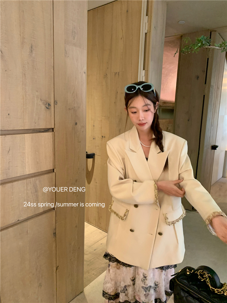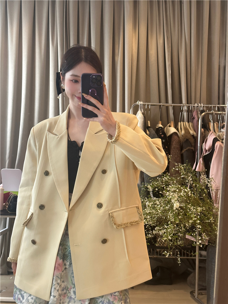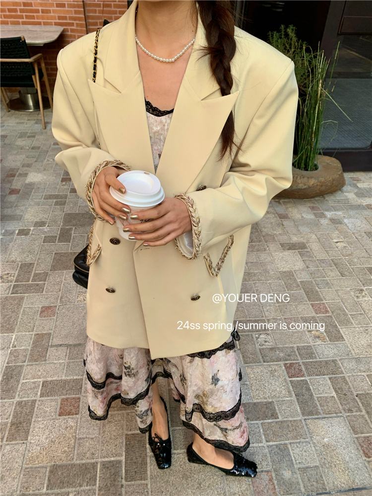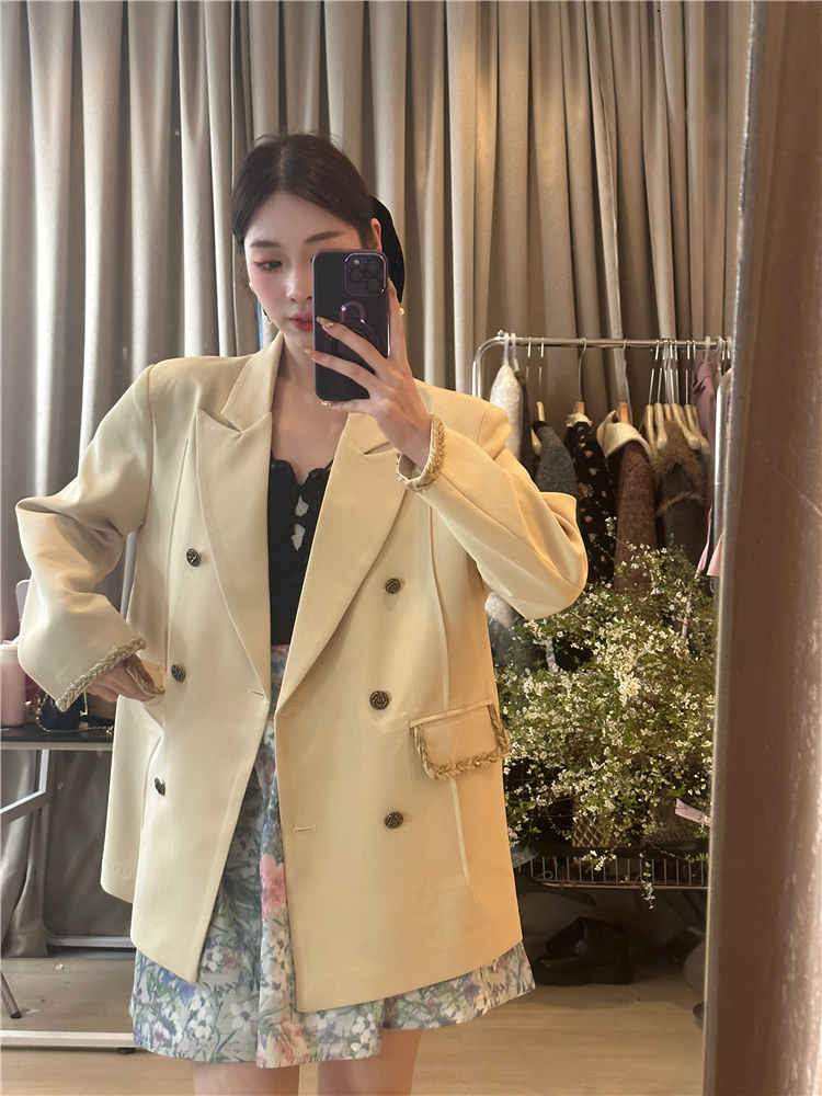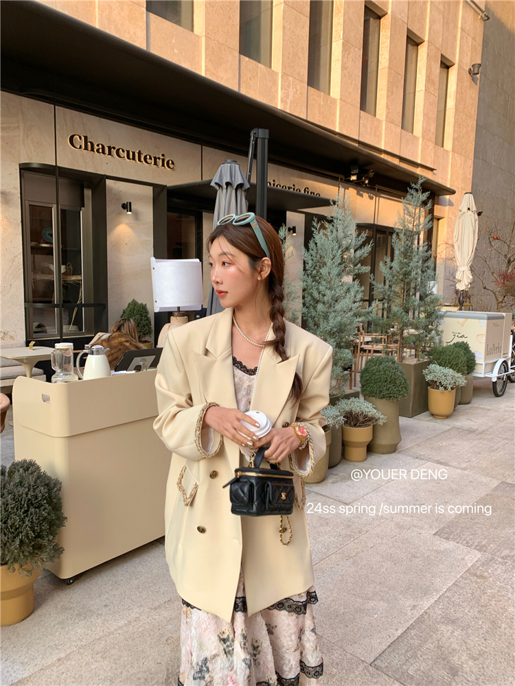*o-ha-you*【FLKDYA901】春季復古法式織帶雙排扣米黃色西裝外套輪廓西服上衣