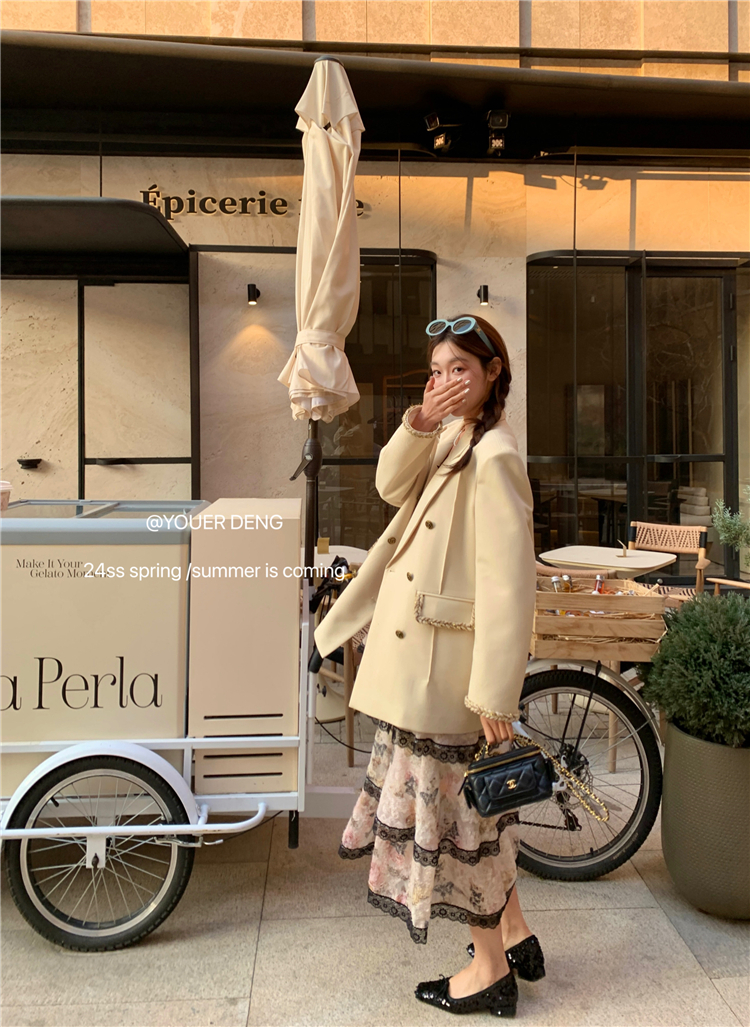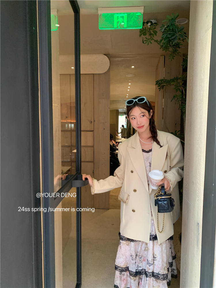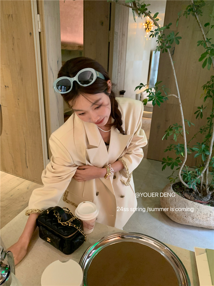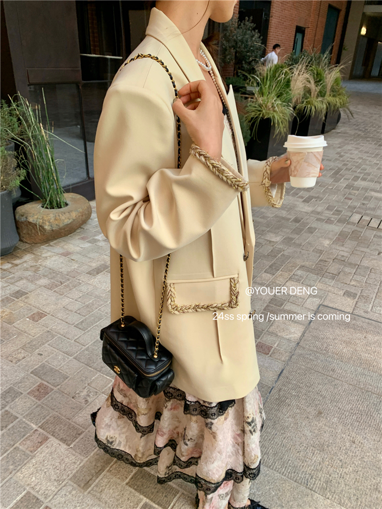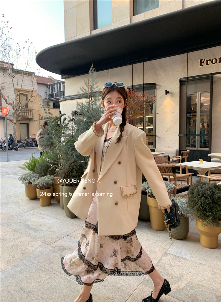 *o-ha-you*【FLKDYA901】春季復古法式織帶雙排扣米黃色西裝外套輪廓西服上衣