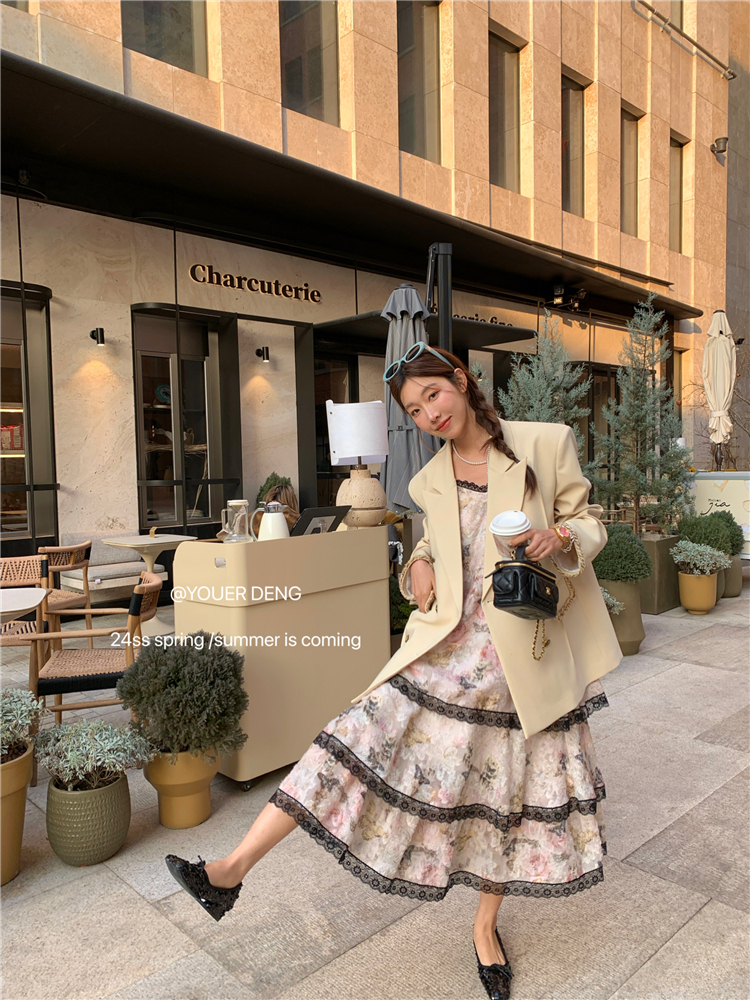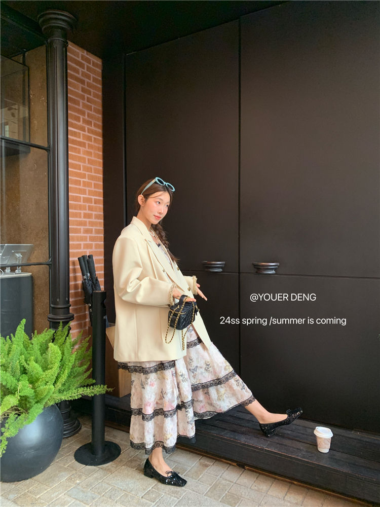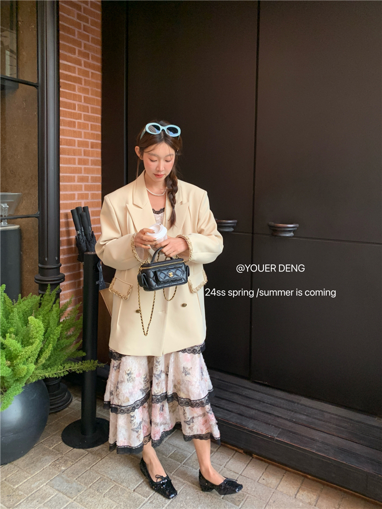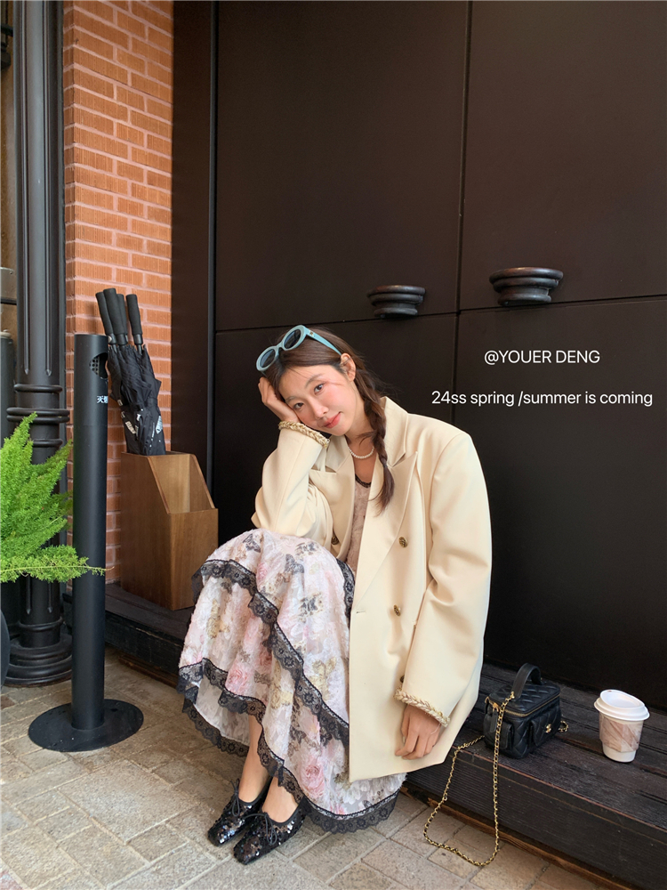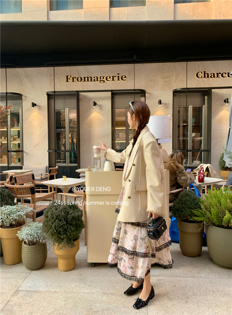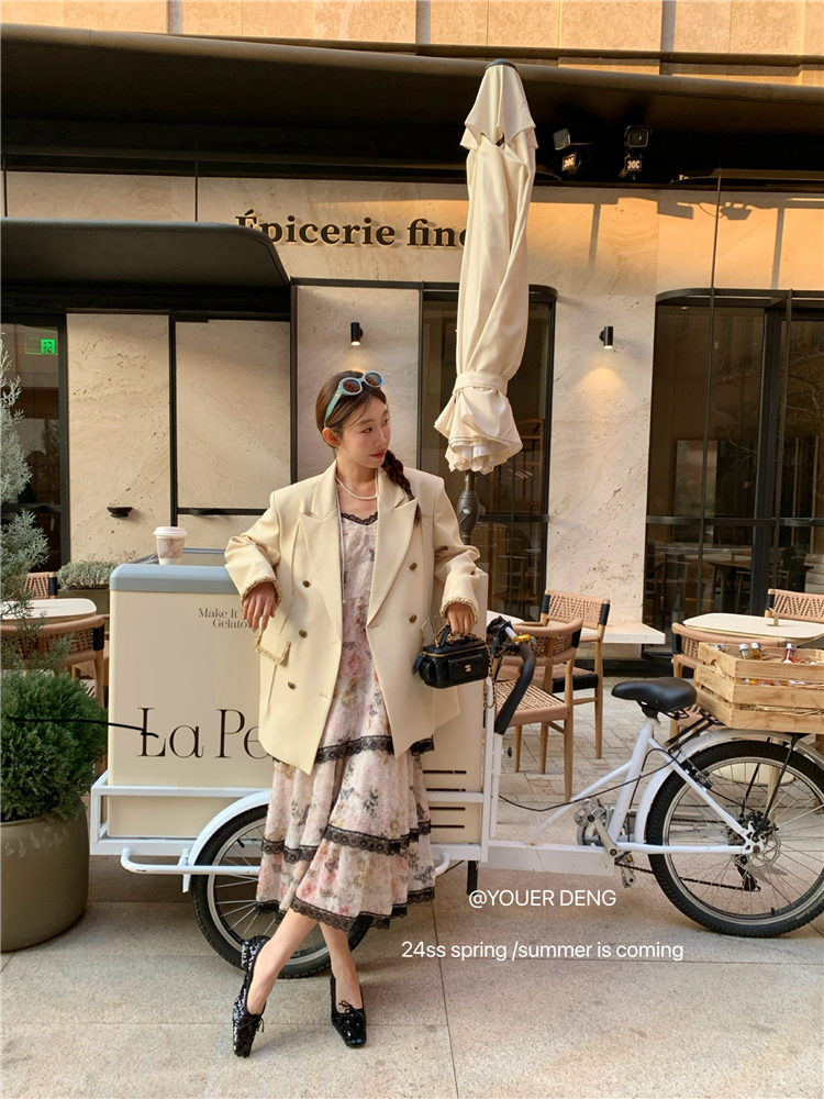 *o-ha-you*【FLKDYA901】春季復古法式織帶雙排扣米黃色西裝外套輪廓西服上衣