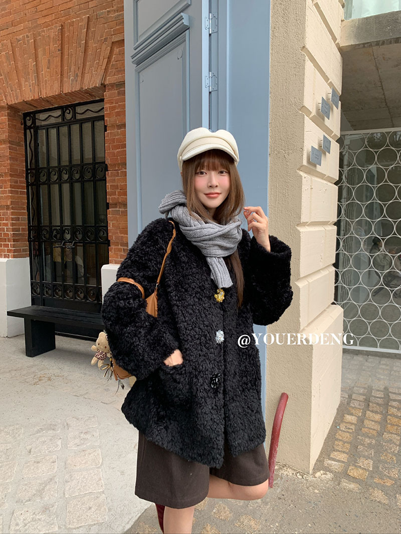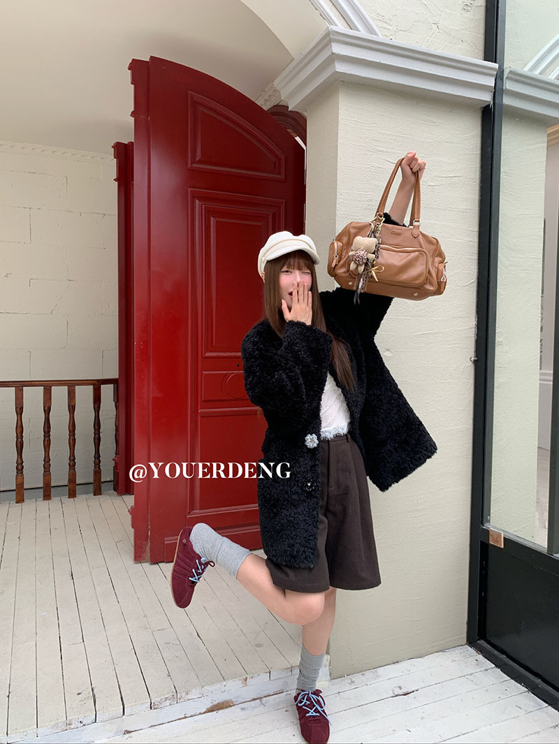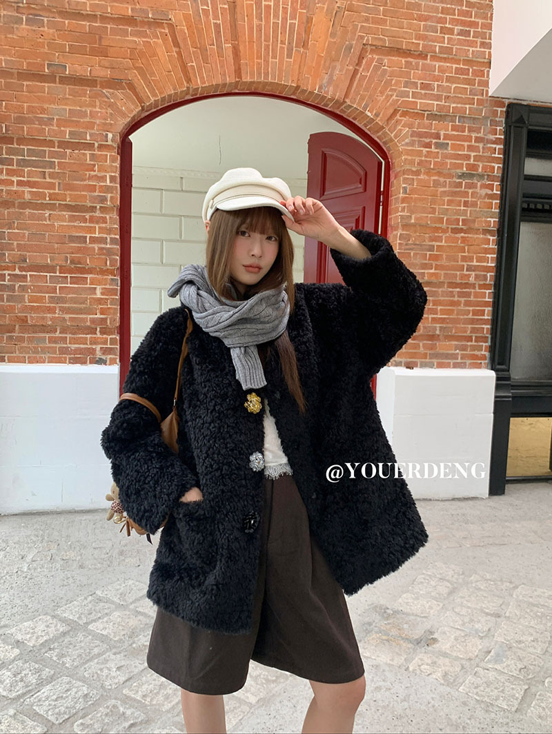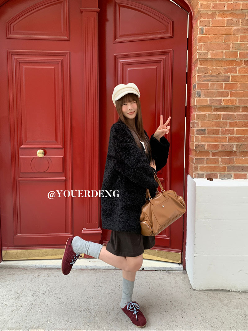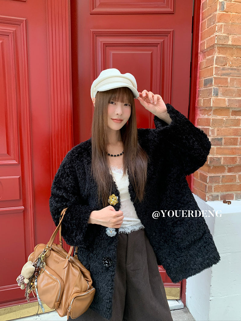 *o-ha-you*【FLKDYB100】黑色幽默毛絨外套加厚毛絨上衣暗黑網紅寬鬆大尺碼女裝冬季