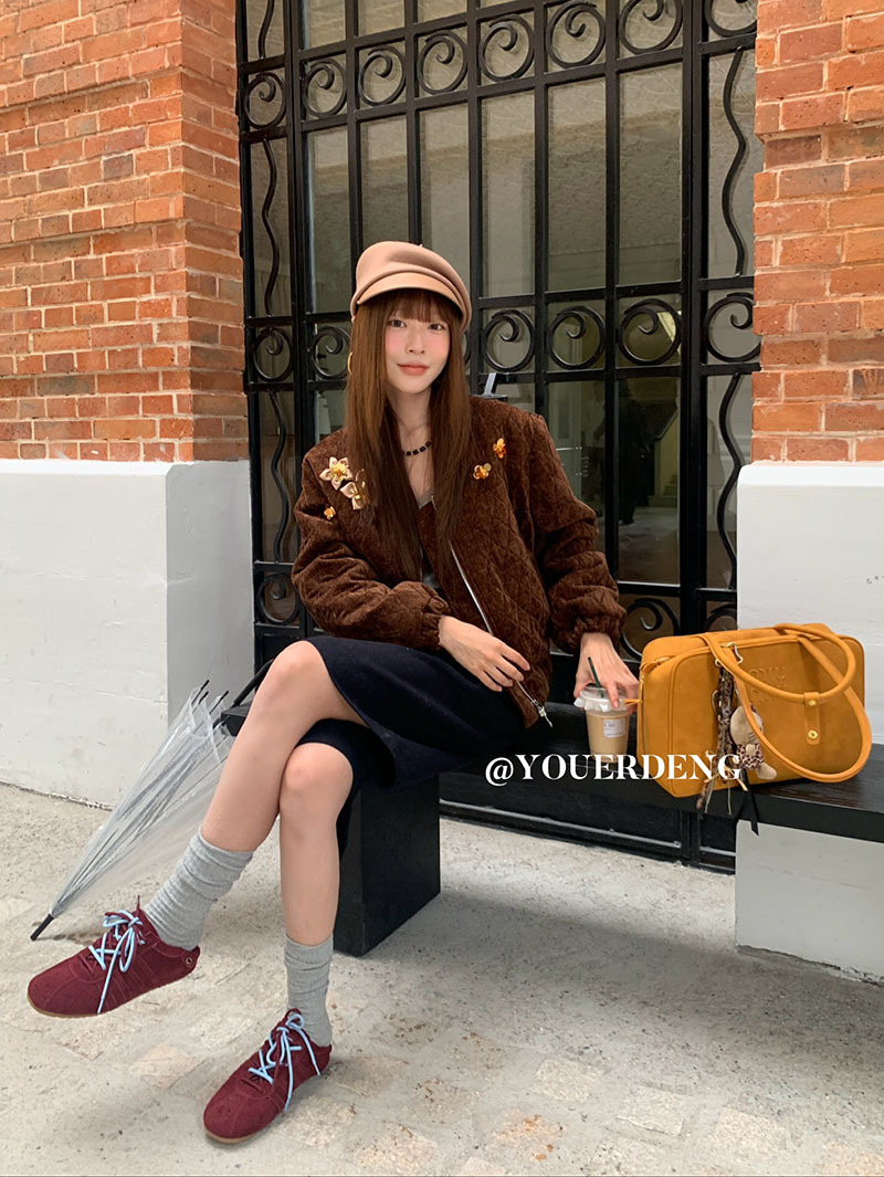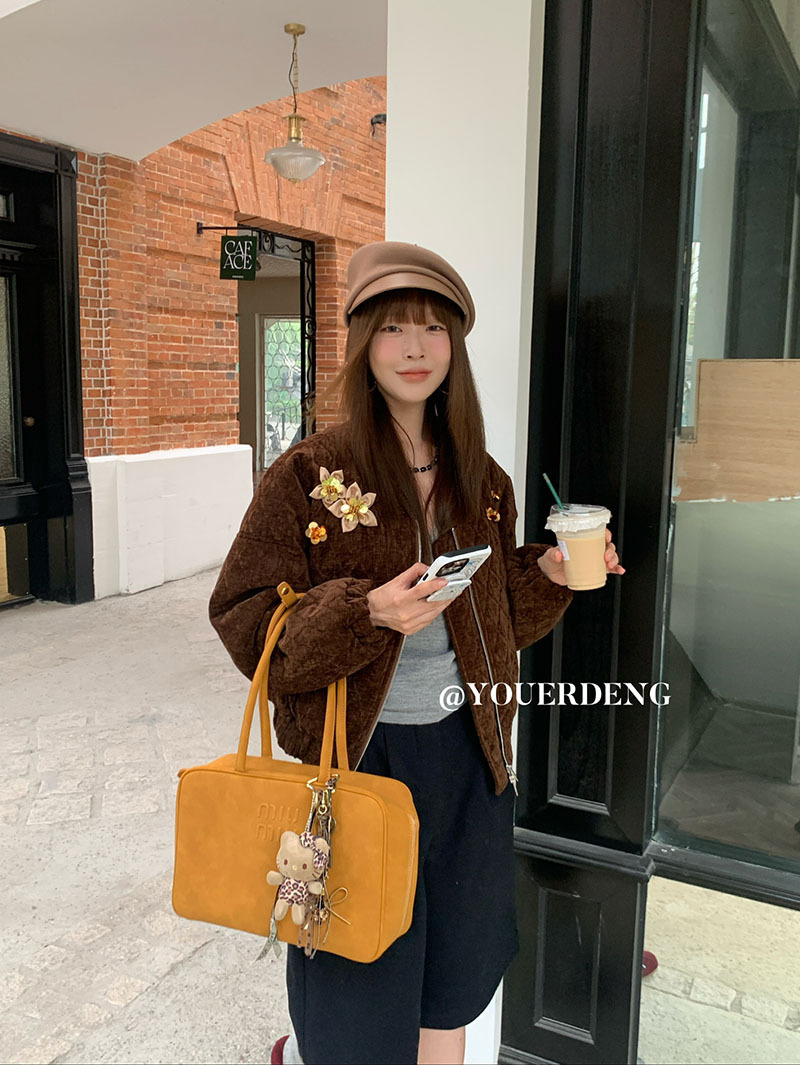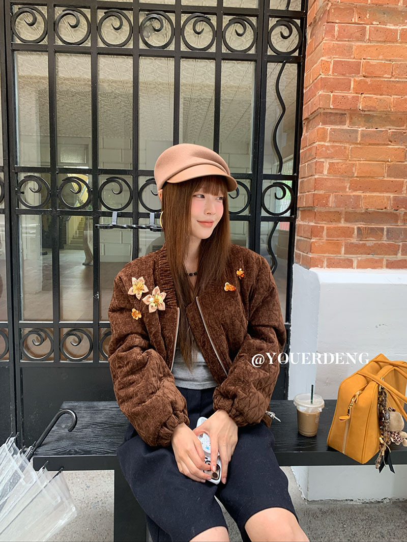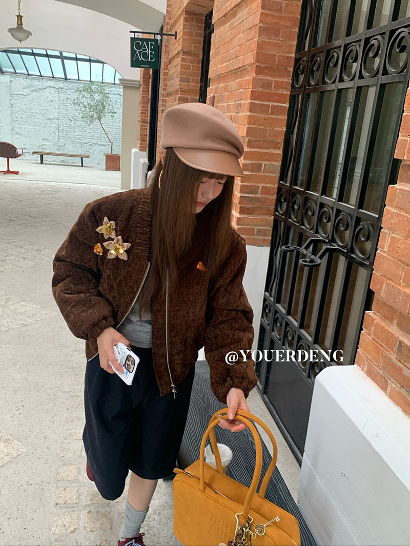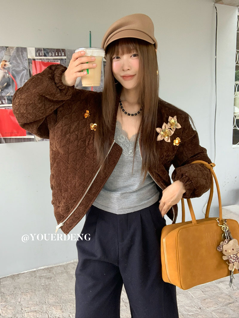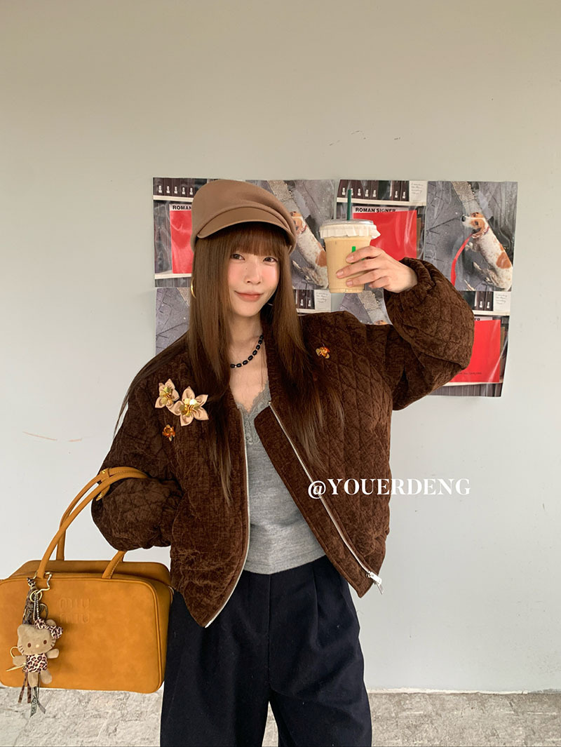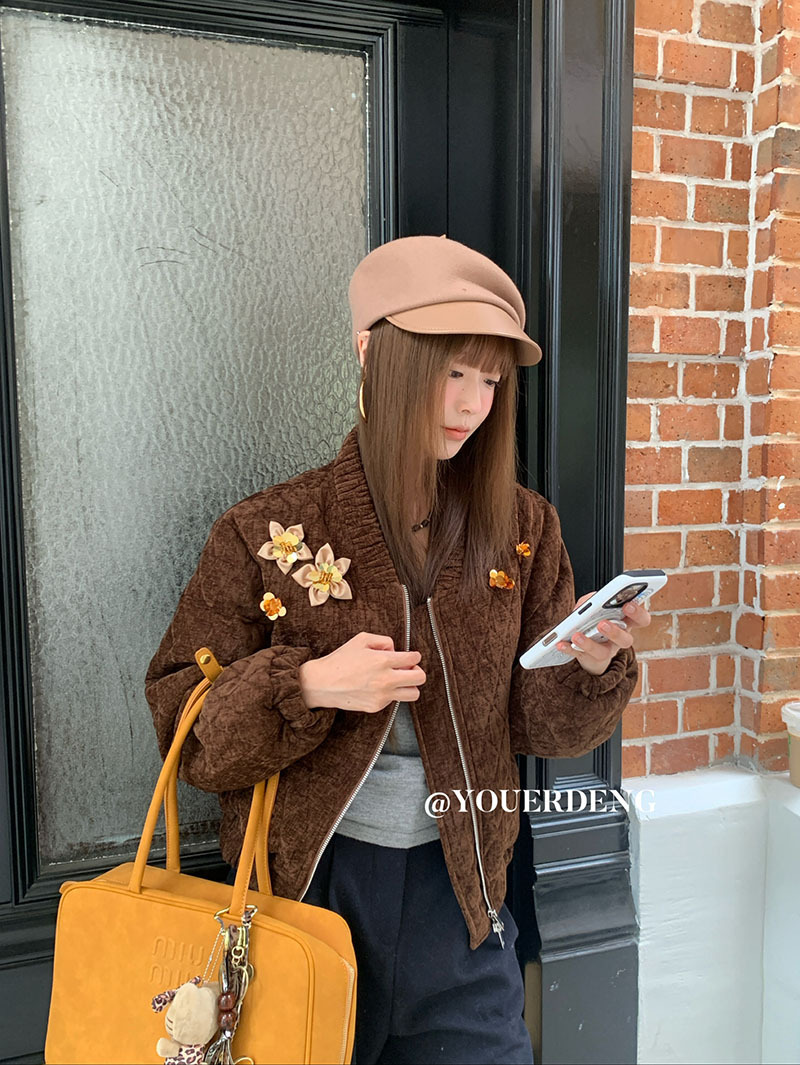 *o-ha-you*【FLKDYB203】冬設計感立體花朵菱格紋羽絨棒球服拉鍊外套保暖焦糖可可夾克飛行服