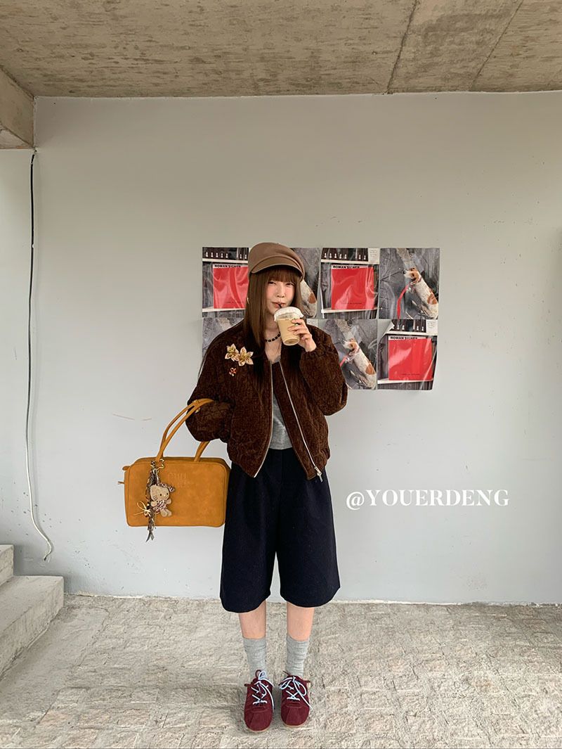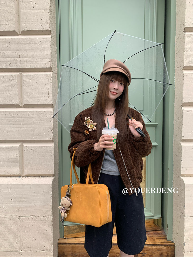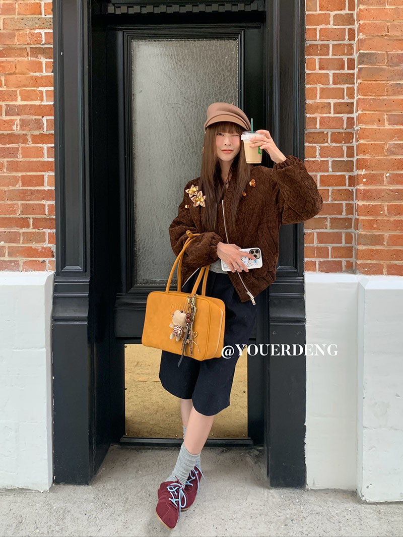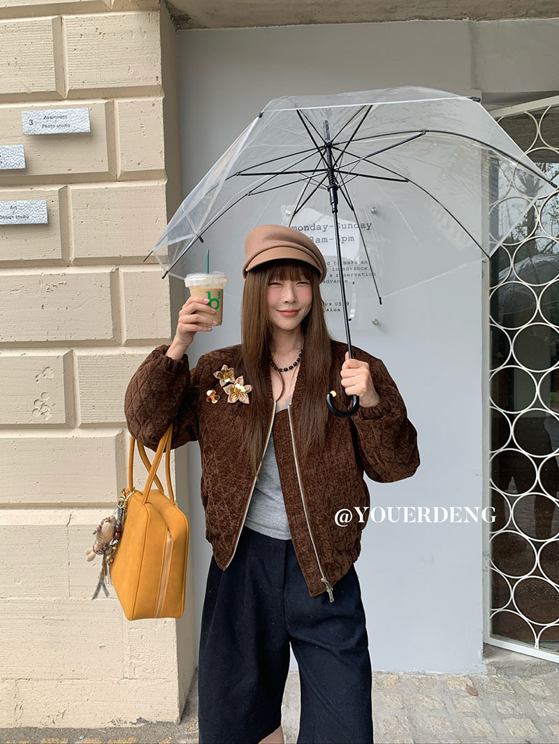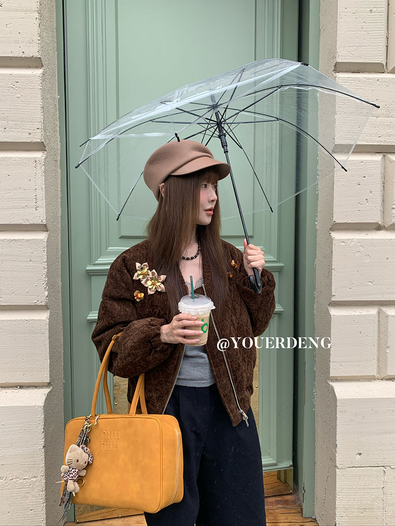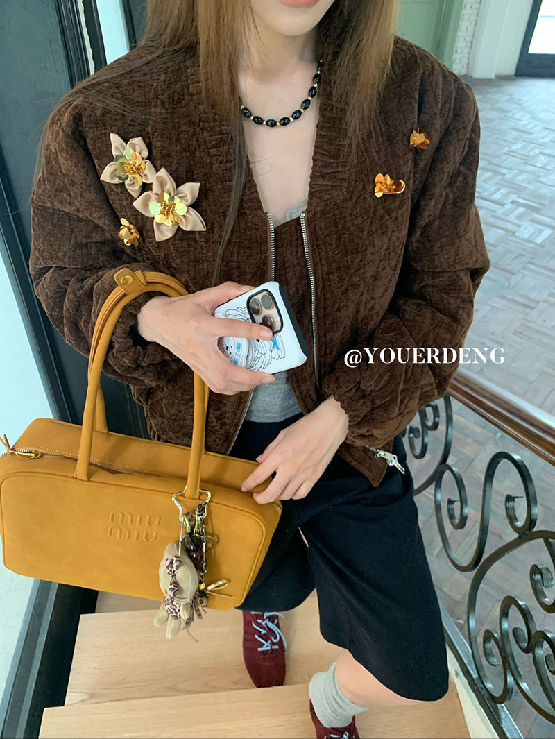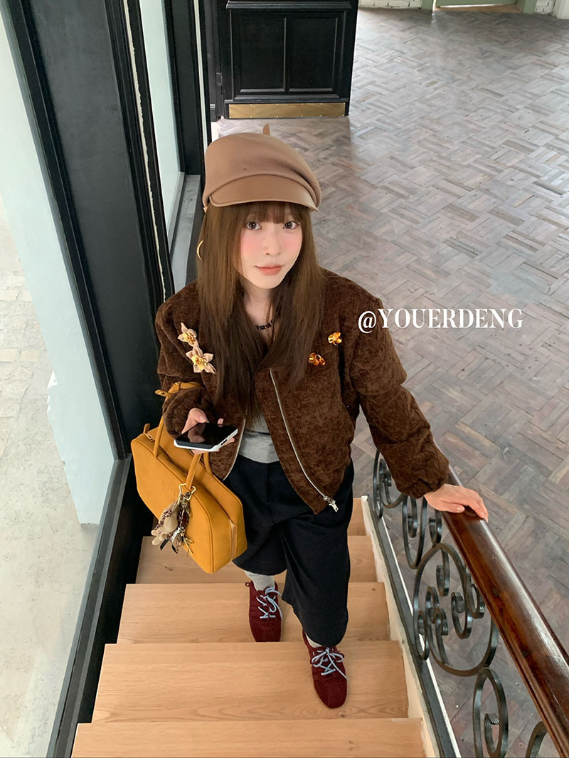 *o-ha-you*【FLKDYB203】冬設計感立體花朵菱格紋羽絨棒球服拉鍊外套保暖焦糖可可夾克飛行服