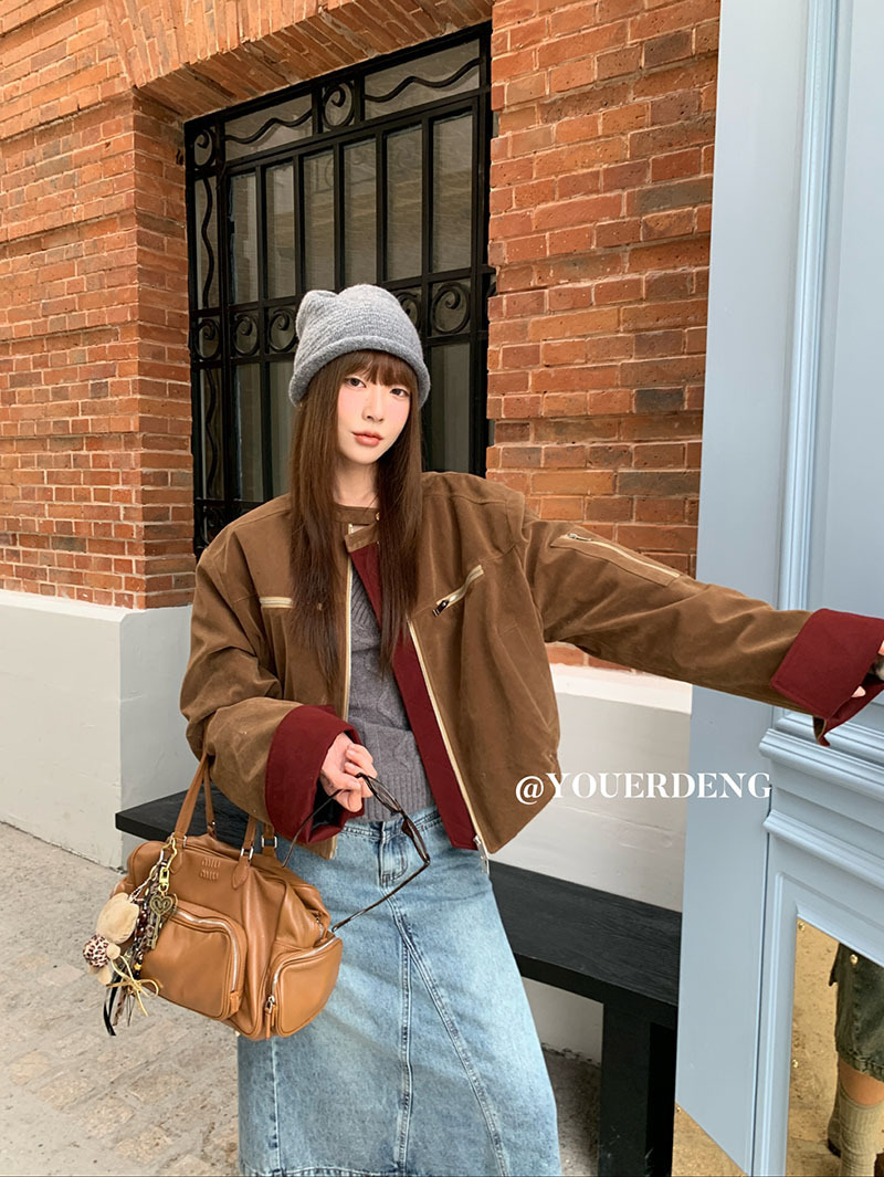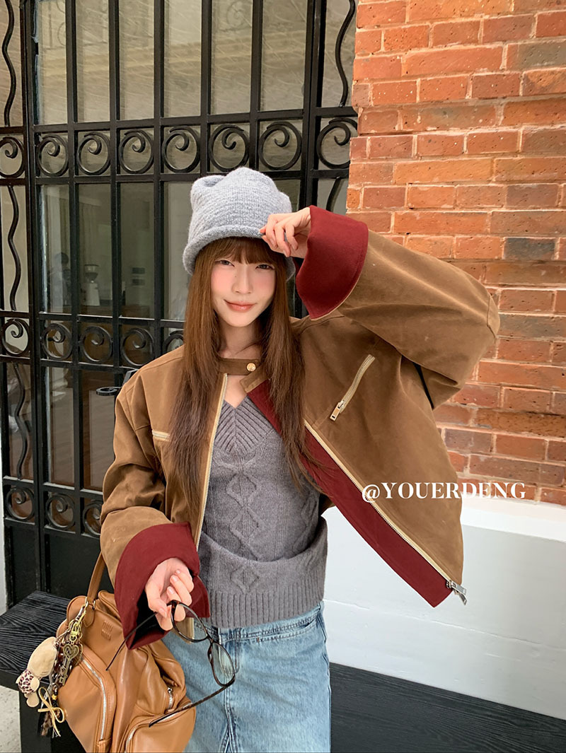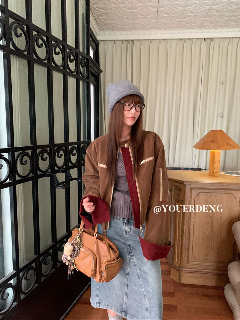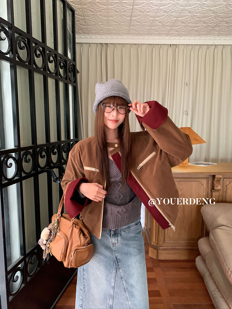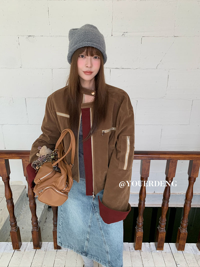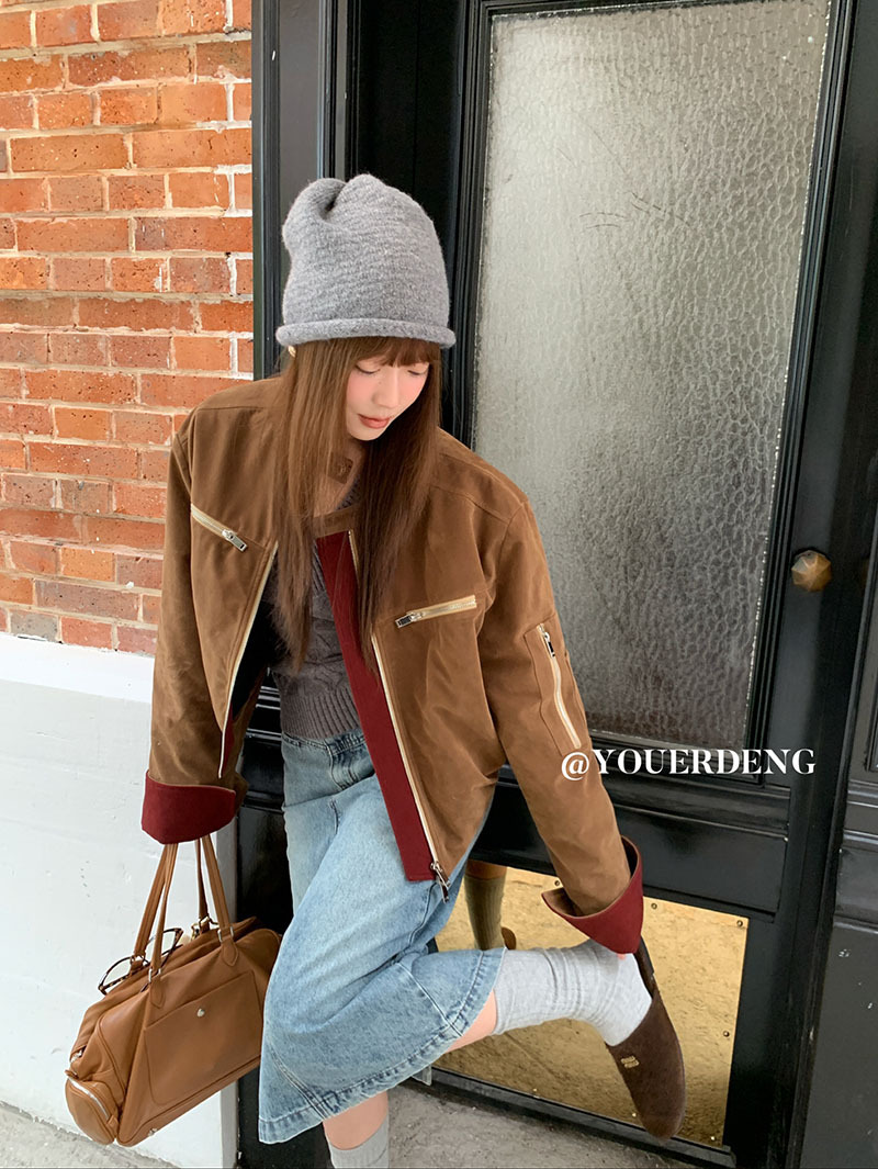 *o-ha-you*【FLKDYB205】摩登教主外套保暖街頭上衣加厚機車夾克飛行服潮冬季新款立領拼接咖色羽絨拉鍊棒球服外套