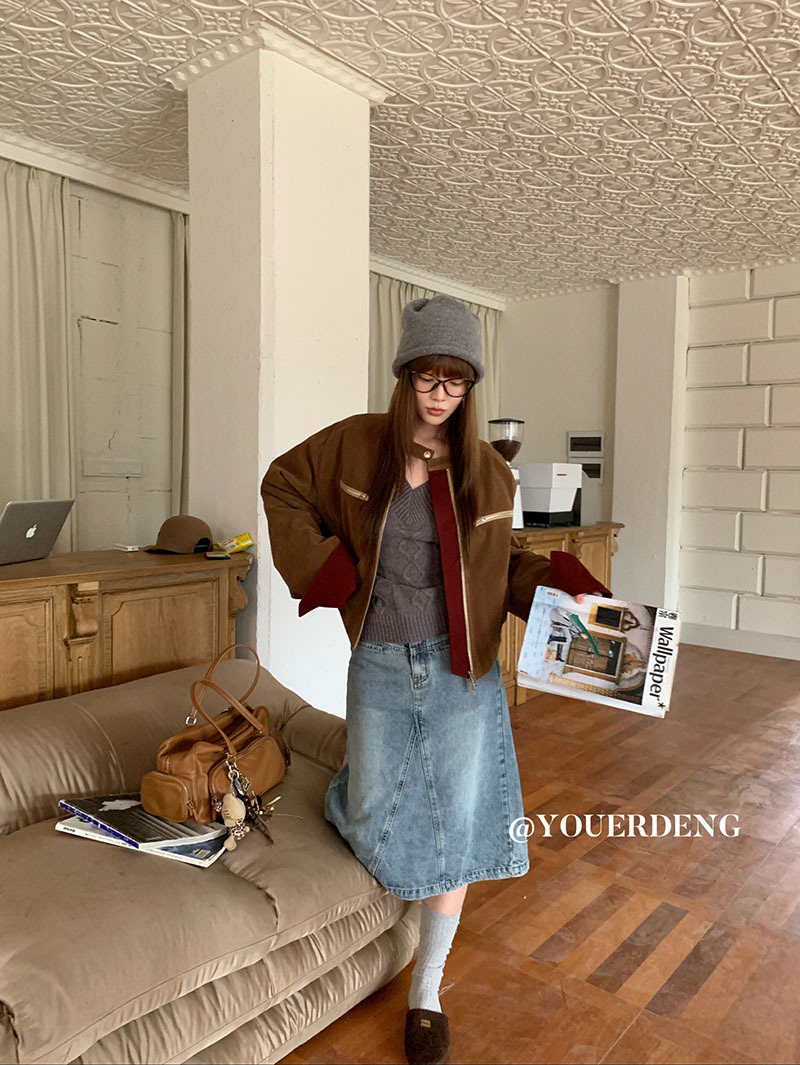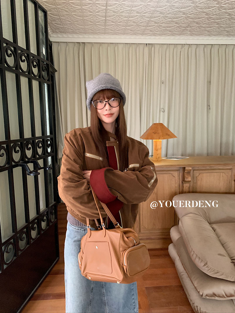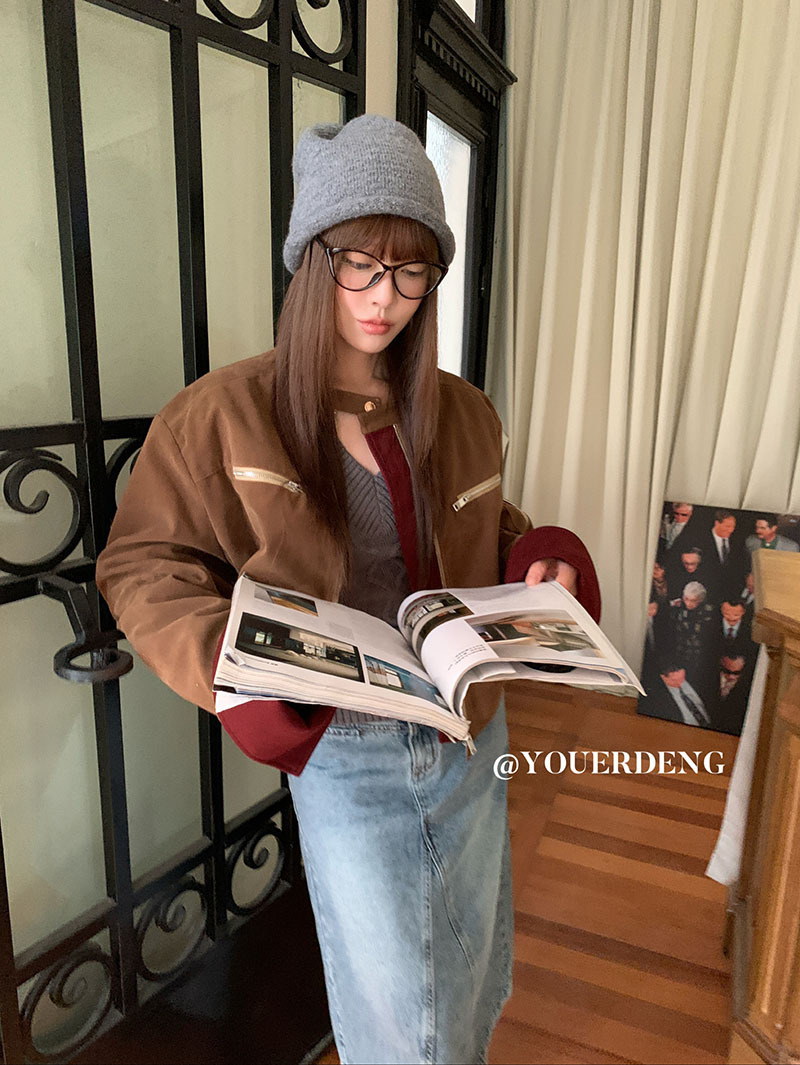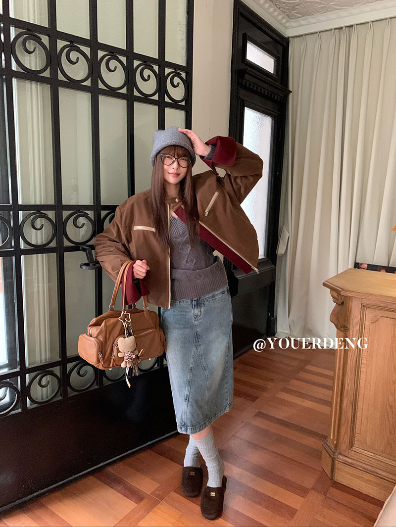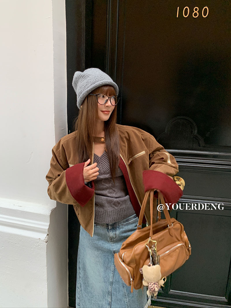 *o-ha-you*【FLKDYB205】摩登教主外套保暖街頭上衣加厚機車夾克飛行服潮冬季新款立領拼接咖色羽絨拉鍊棒球服外套
