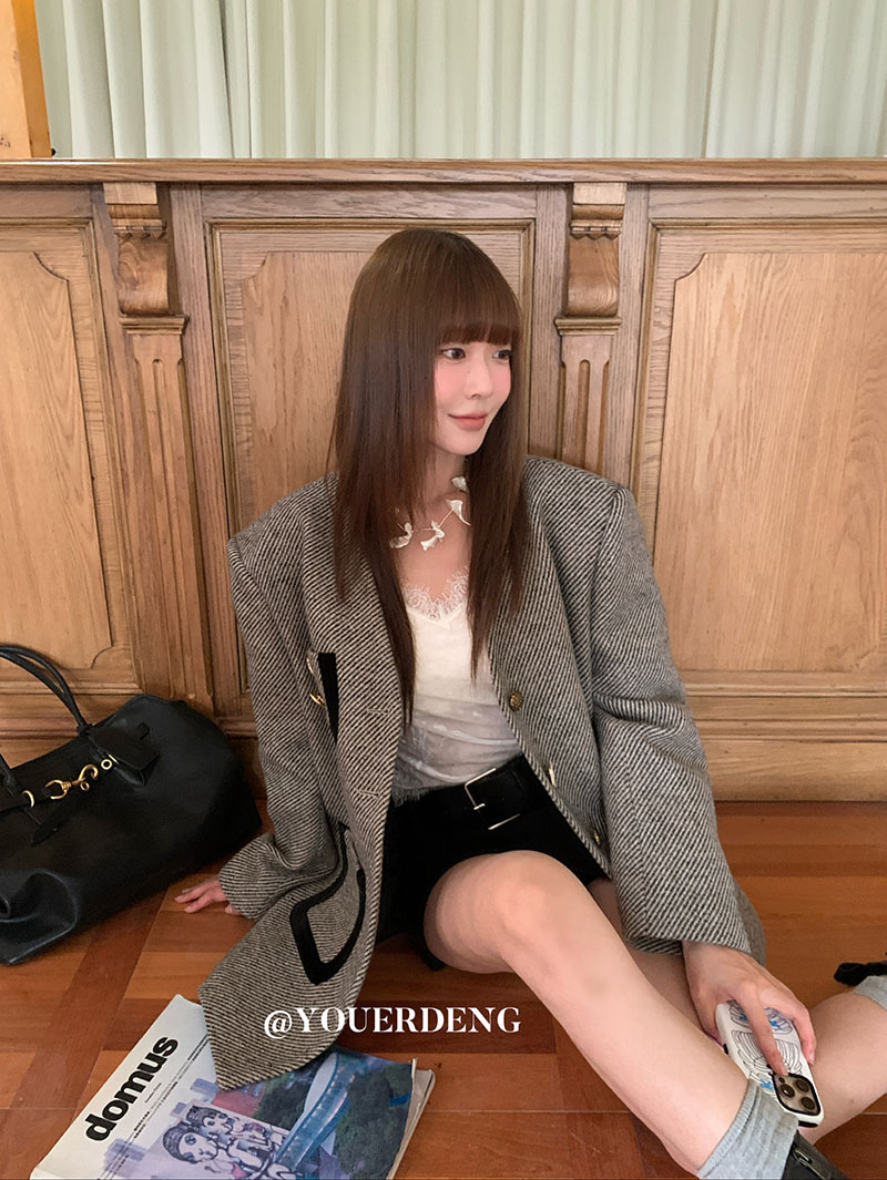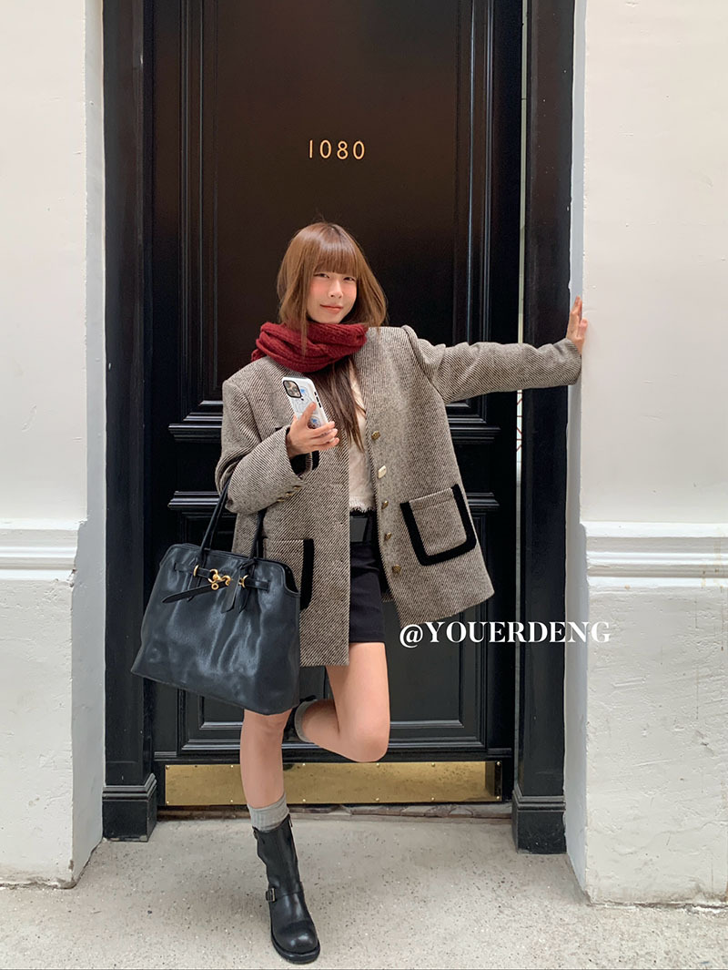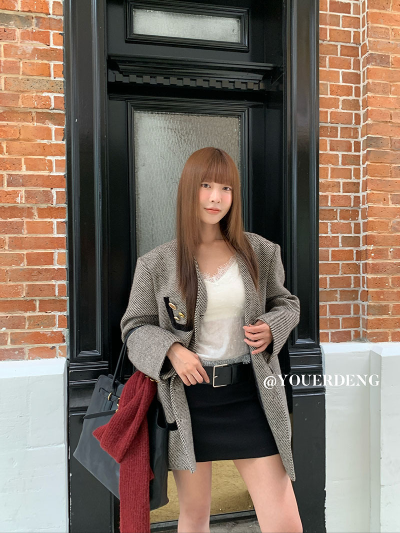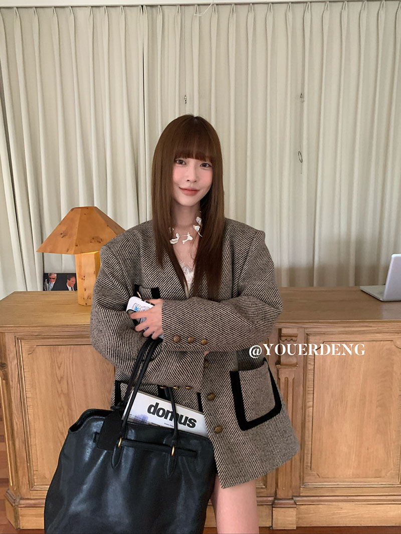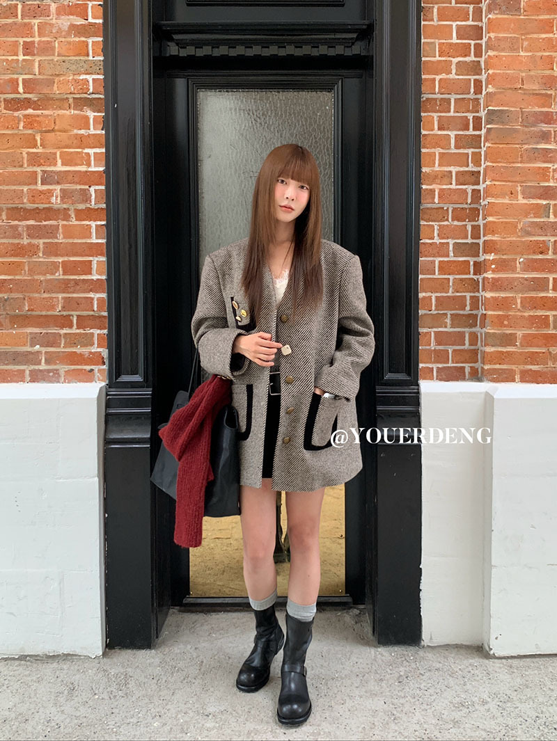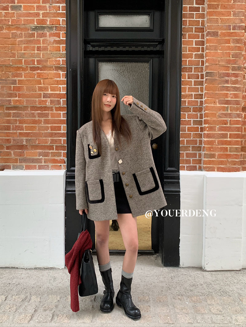 *o-ha-you*【FLKDYB207】V領工裝多口袋金屬扣毛呢廓形西裝外套冬小眾設計感寬鬆大衣邊城往事羊毛呢加厚千鳥格寬鬆優雅