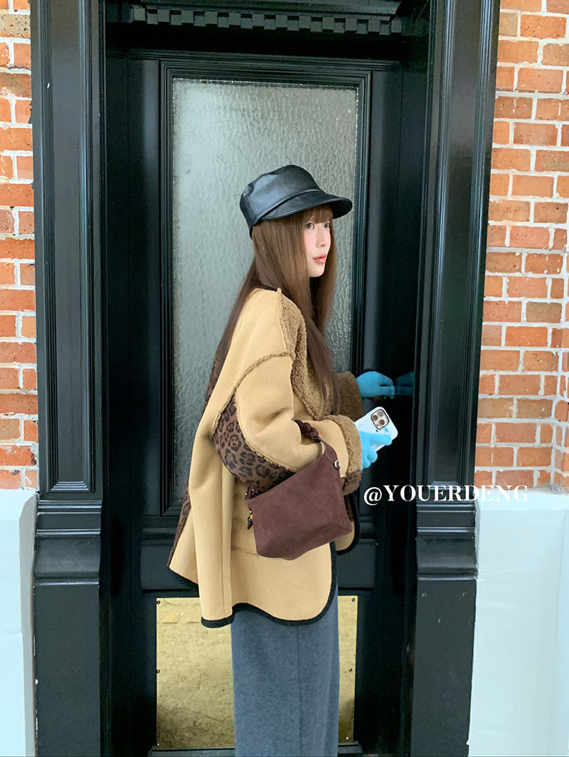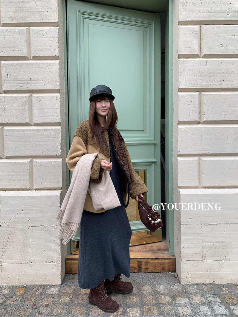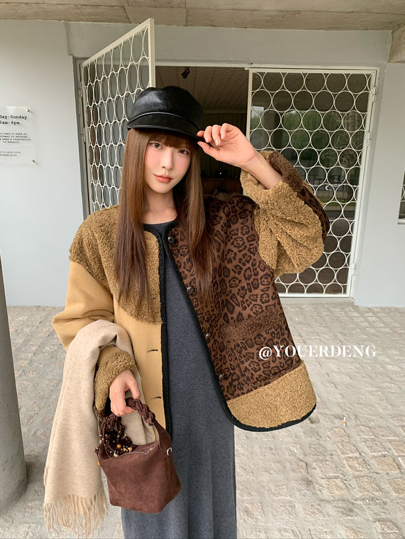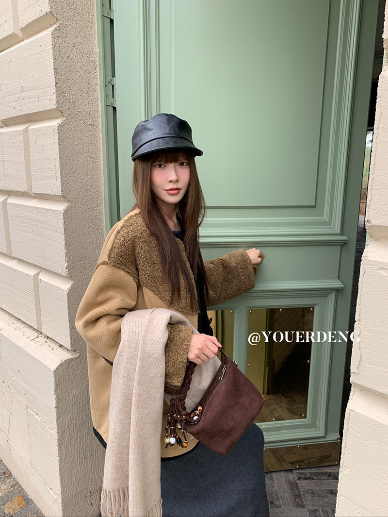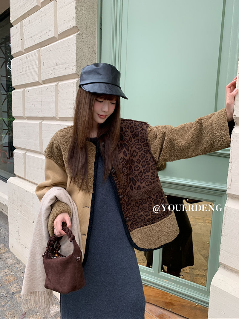 *o-ha-you*【FLKDYB309】冬日摩洛哥外套拼接撞色復古咖色毛呢上衣街頭厚實擋風