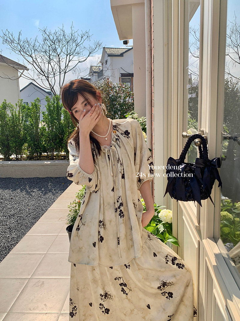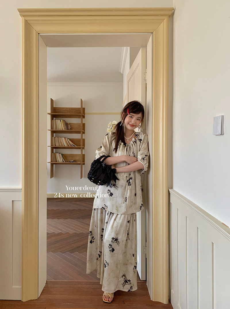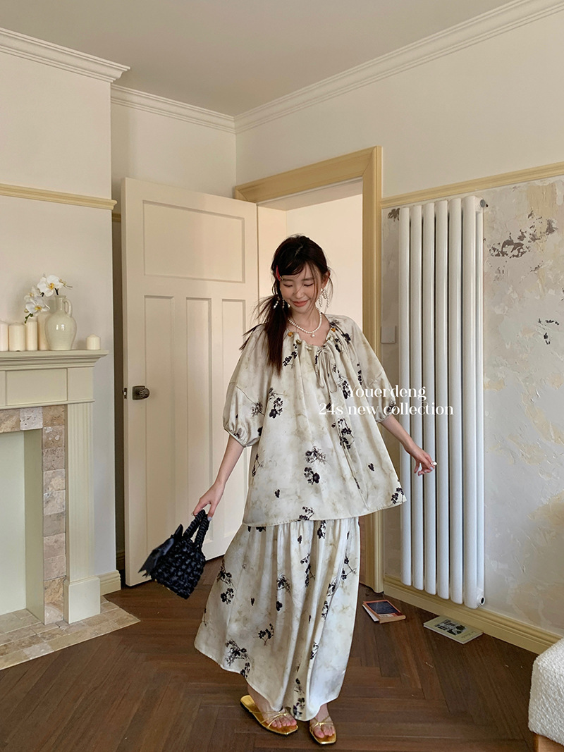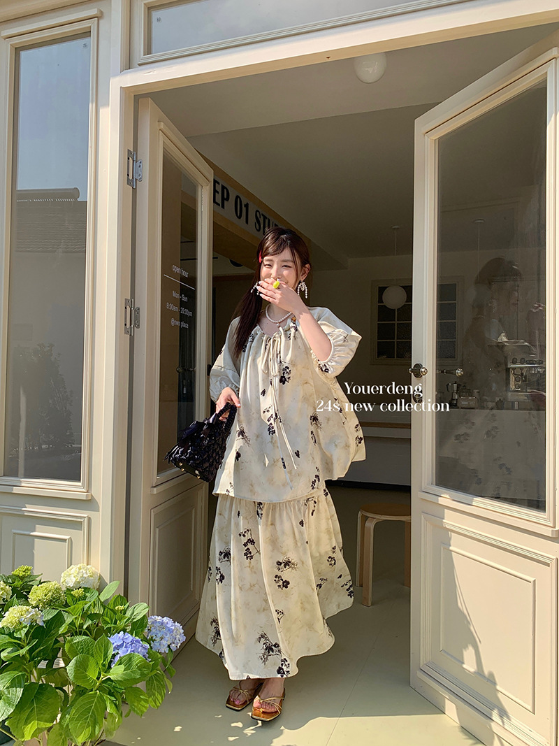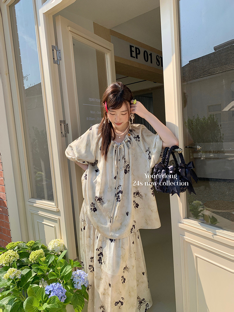 *o-ha-you*【FLKDYS107】復古新中式水墨印花中袖襯衫鬆緊腰大擺長裙國風兩件套裝