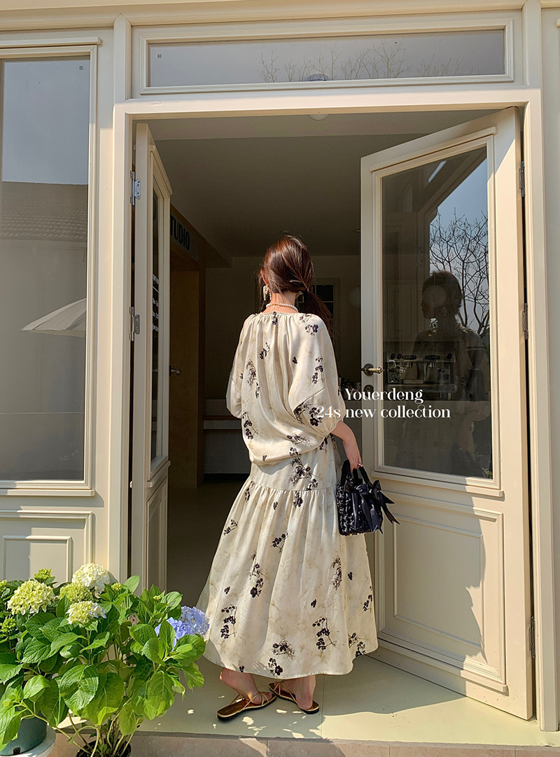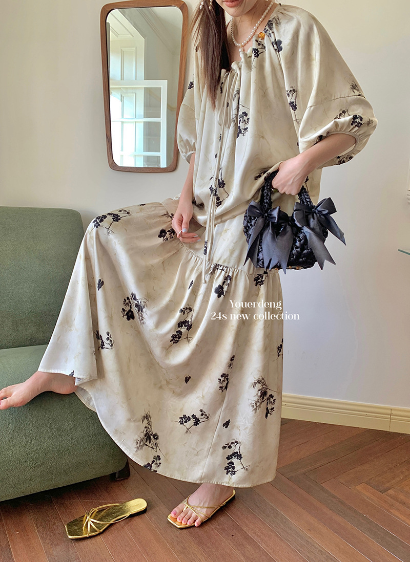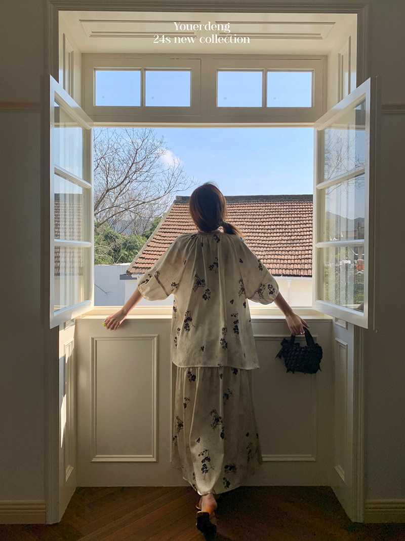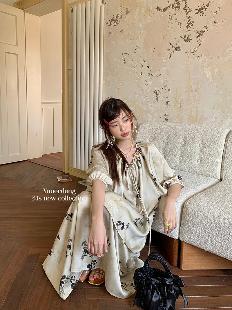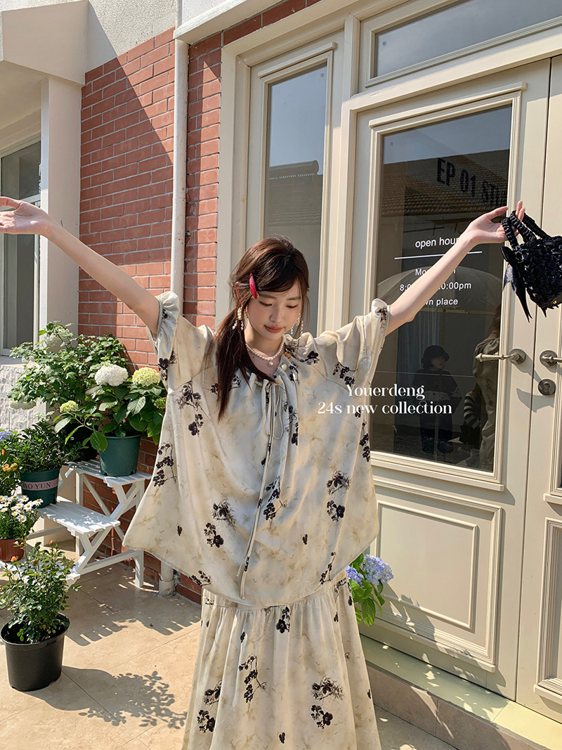 *o-ha-you*【FLKDYS107】復古新中式水墨印花中袖襯衫鬆緊腰大擺長裙國風兩件套裝