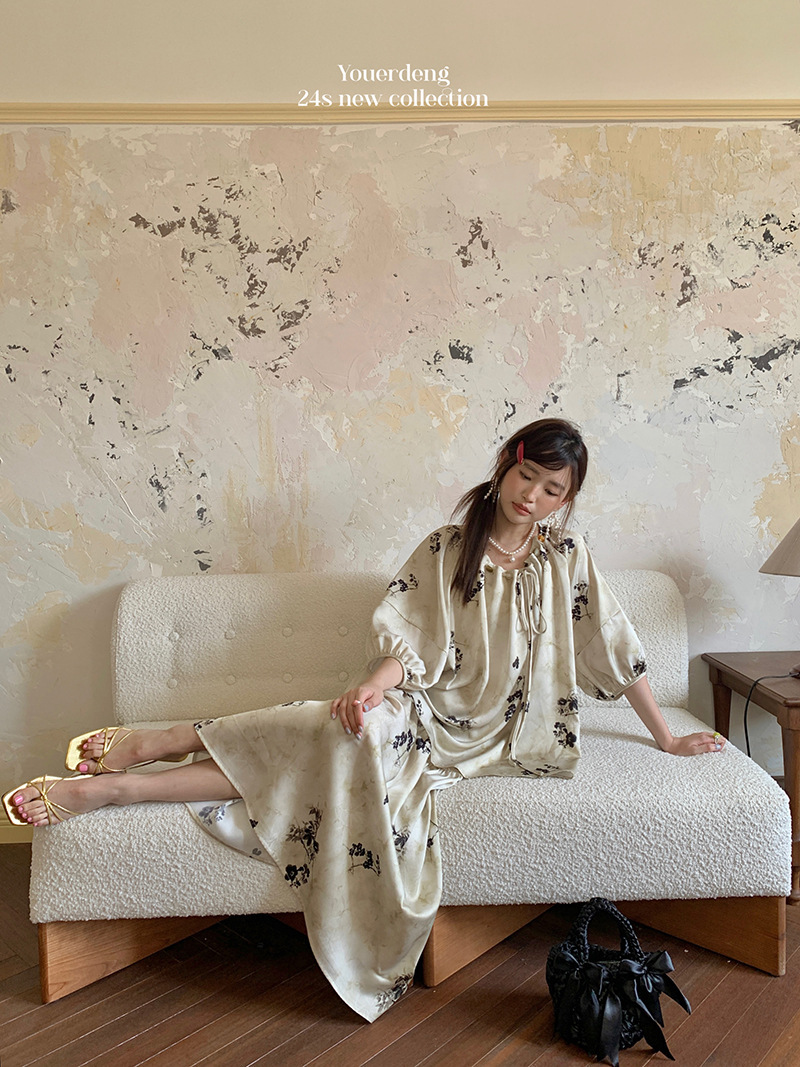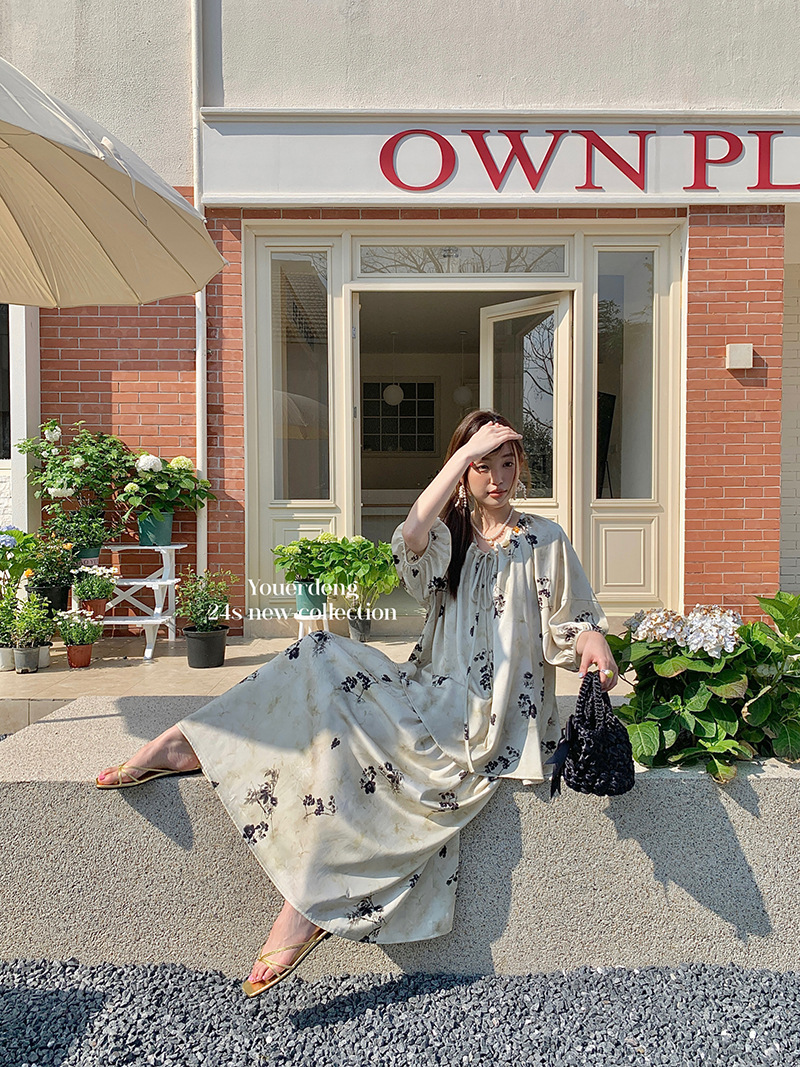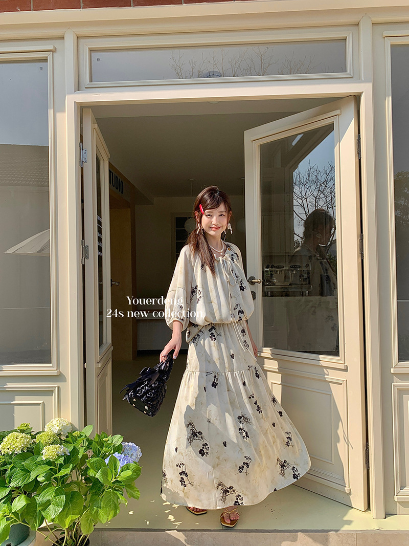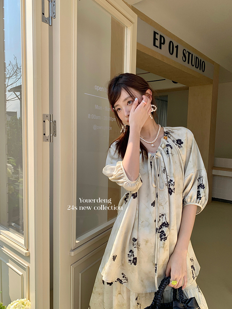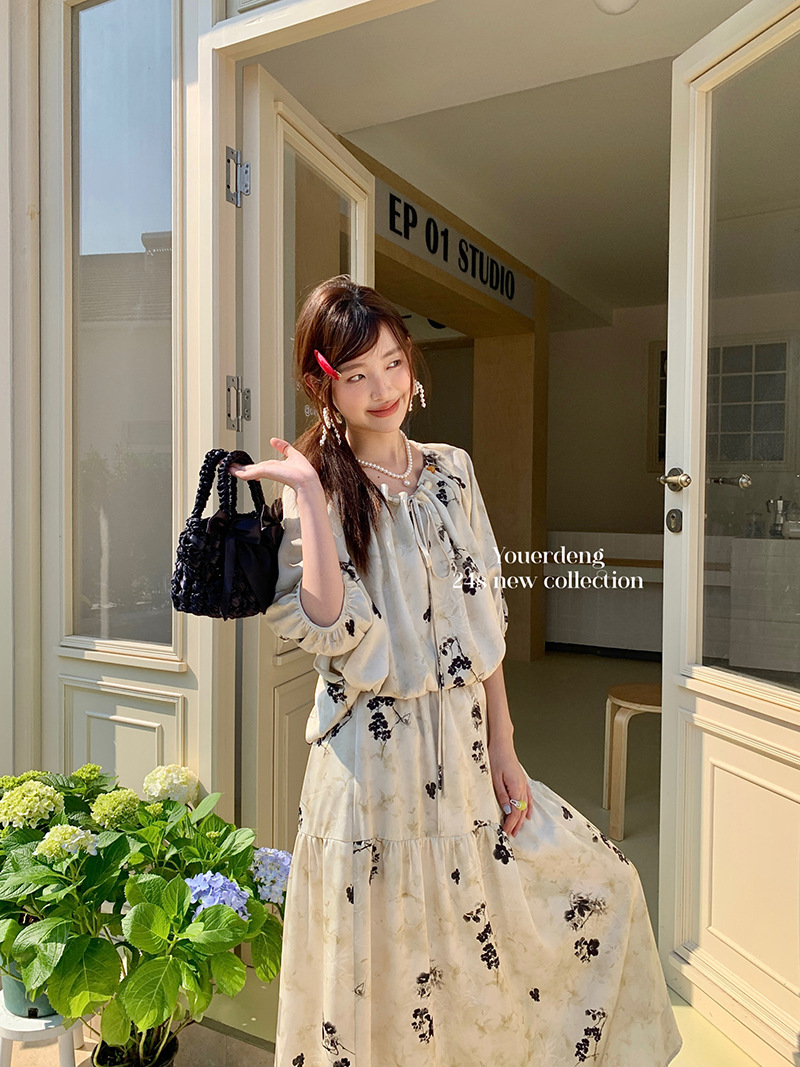*o-ha-you*【FLKDYS107】復古新中式水墨印花中袖襯衫鬆緊腰大擺長裙國風兩件套裝