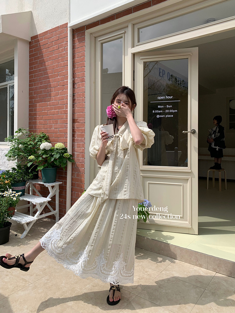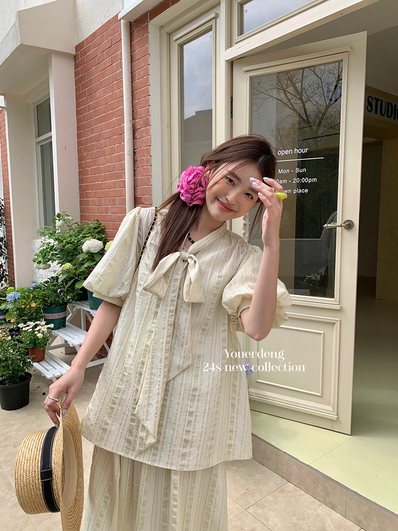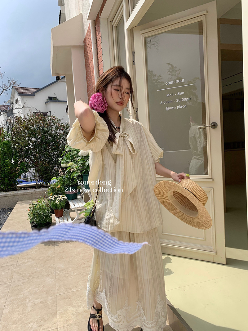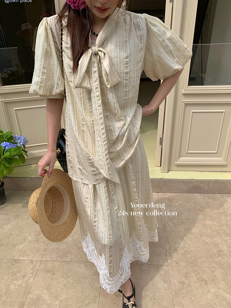 *o-ha-you*【FLKDYS108】復古法式蝴蝶結領泡泡袖直條紋襯衫蕾絲提花長裙兩件套裝