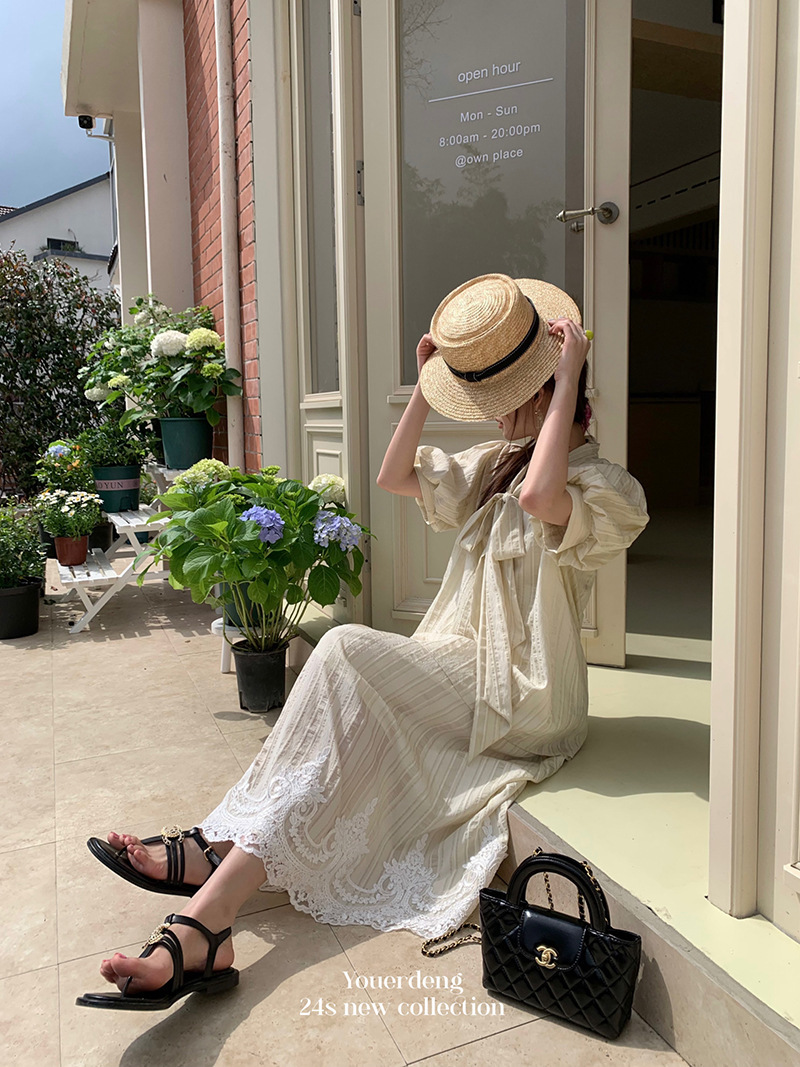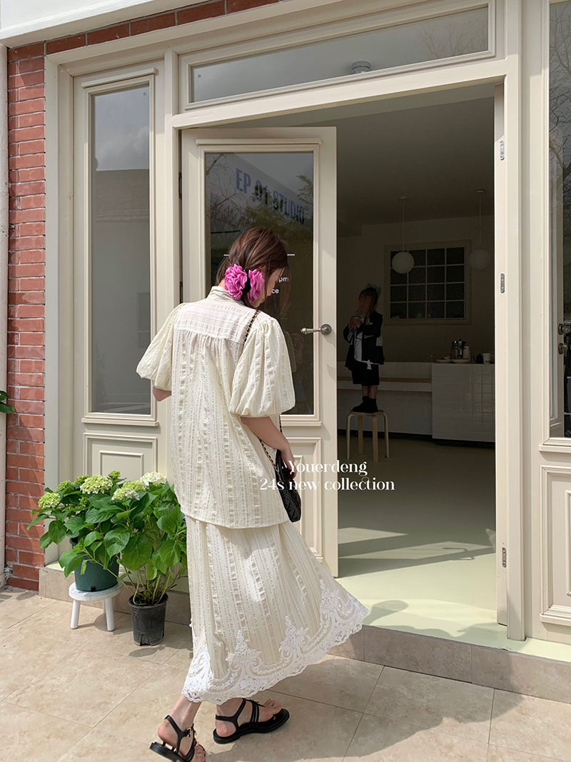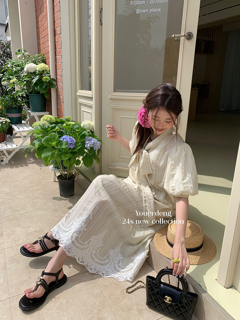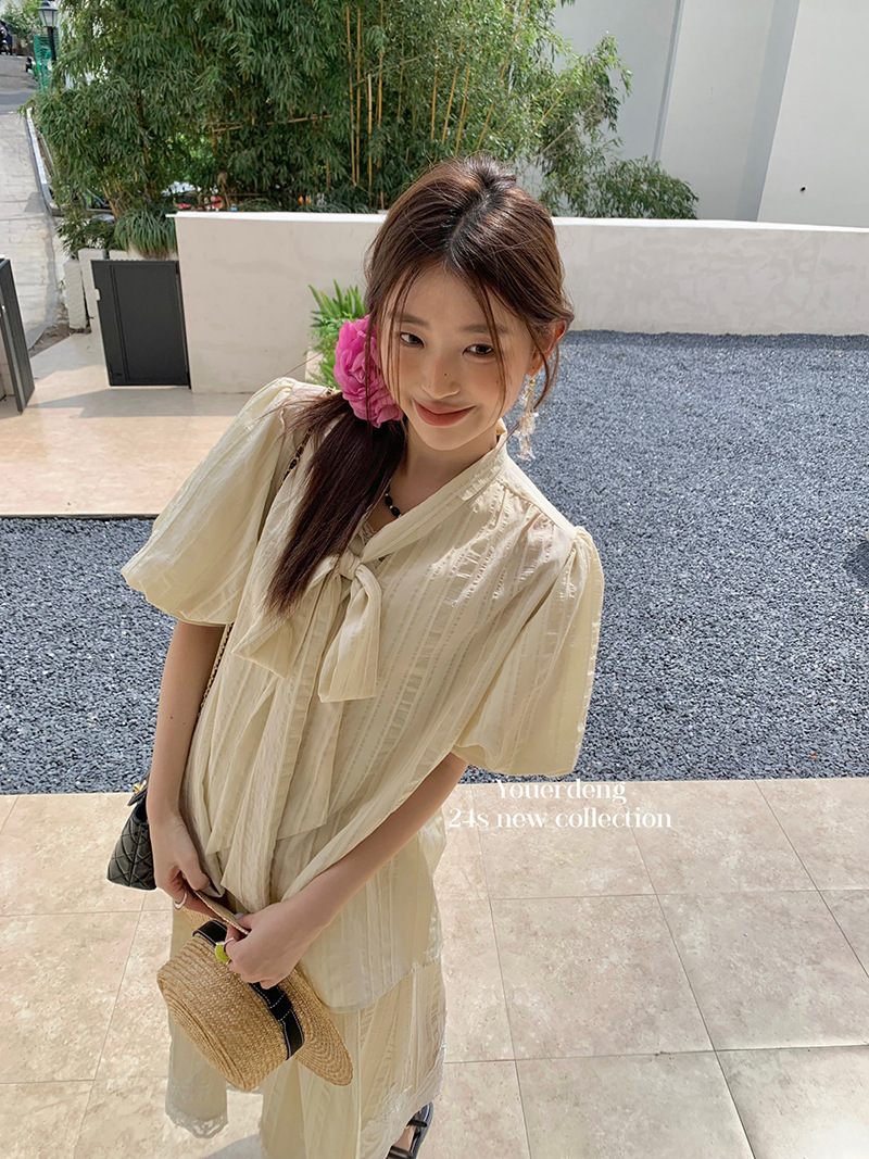 *o-ha-you*【FLKDYS108】復古法式蝴蝶結領泡泡袖直條紋襯衫蕾絲提花長裙兩件套裝