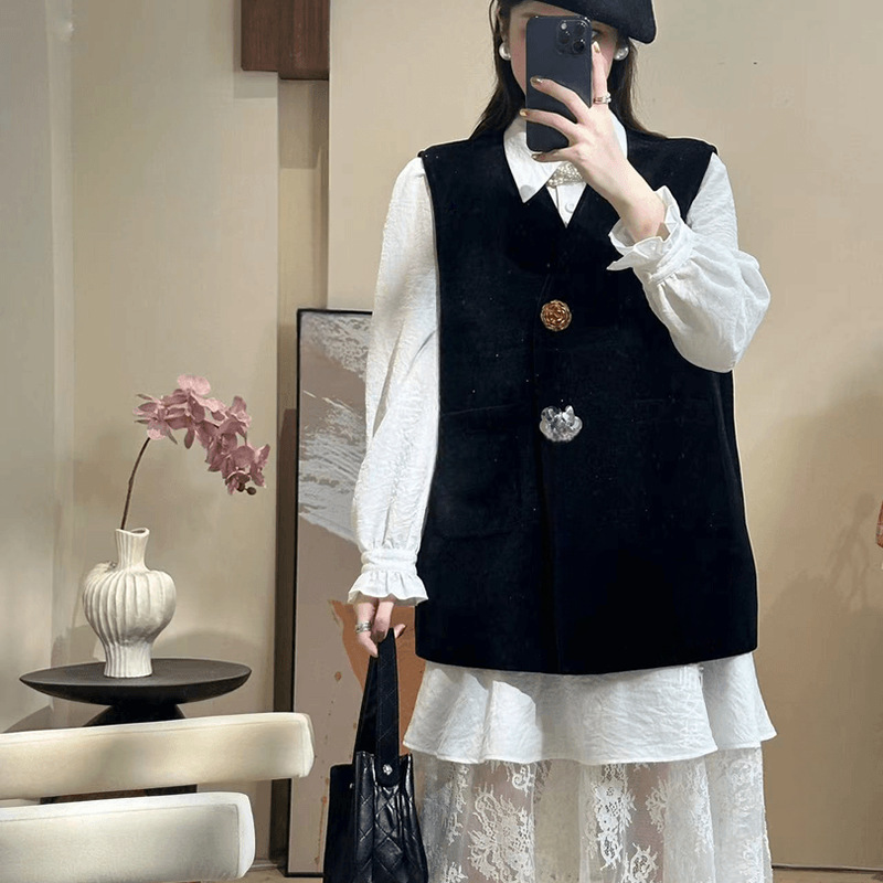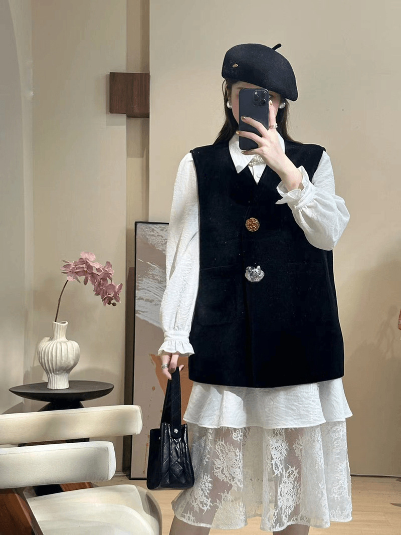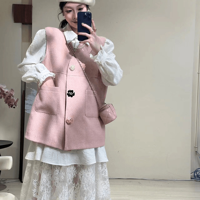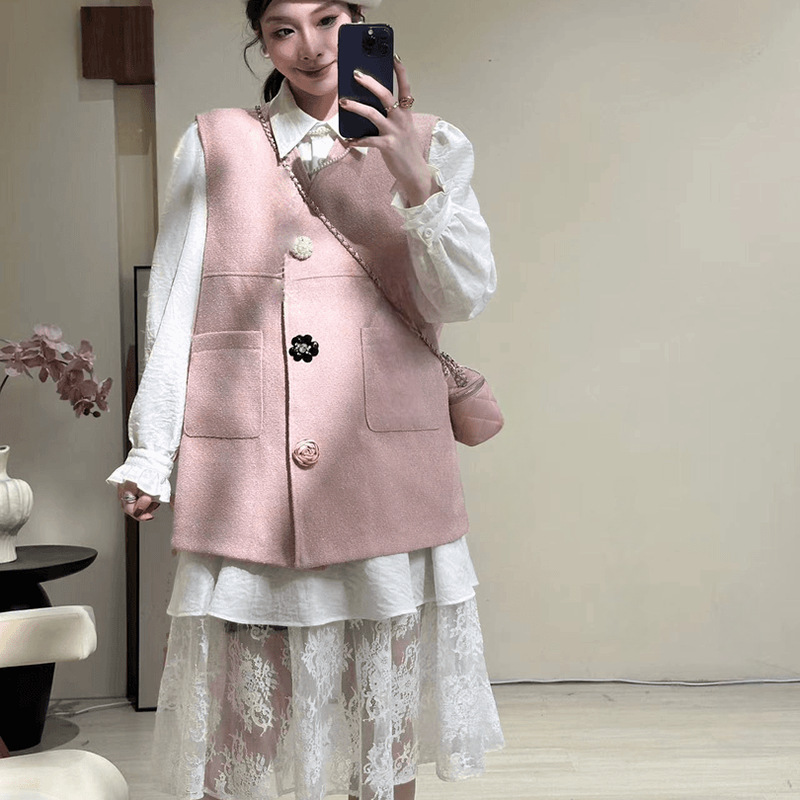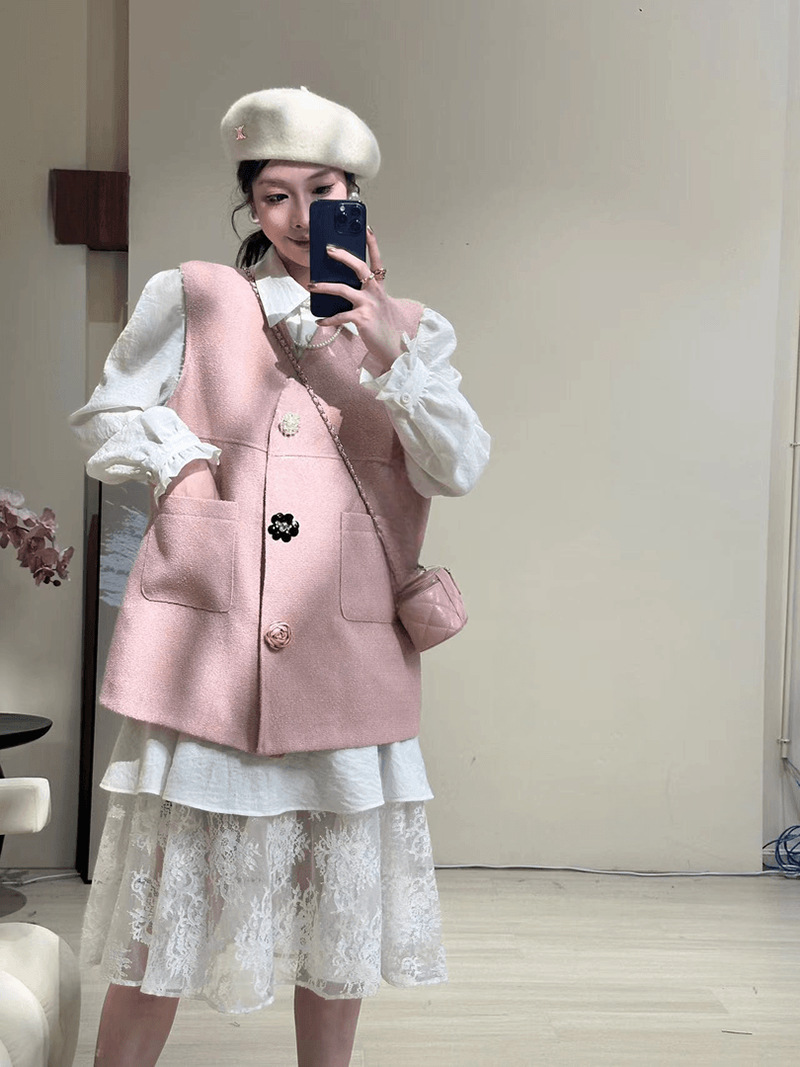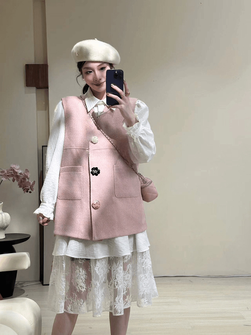*o-ha-you*【FLKDYU1012】粉紅草莓馬甲背心+白色玫瑰襯衣裙套裝小眾設計感秋-2色