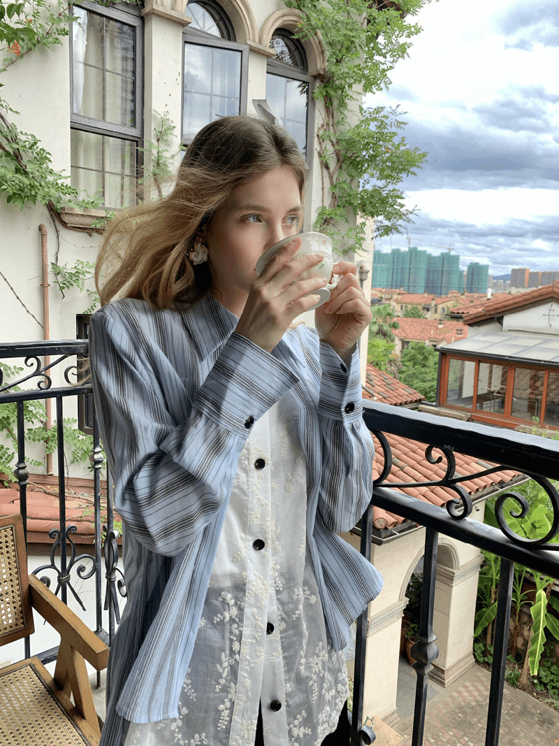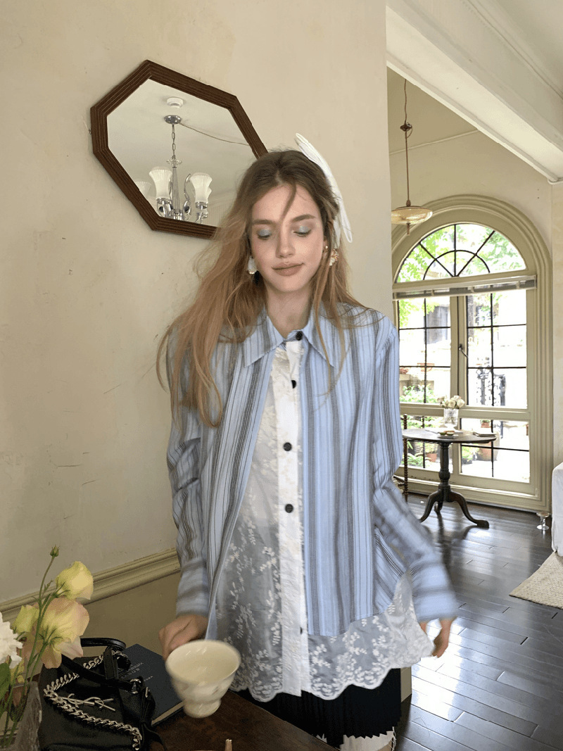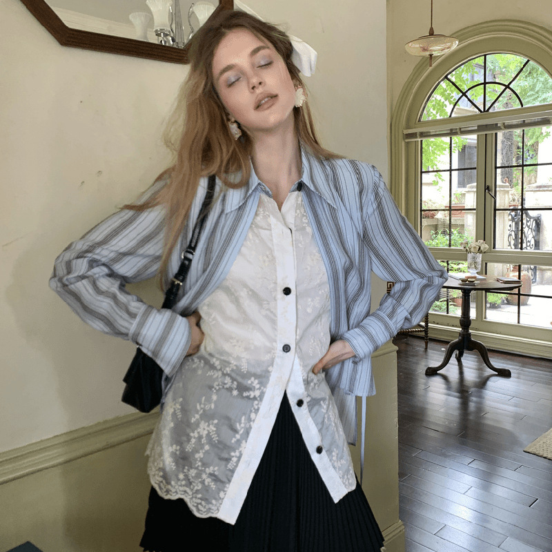 *o-ha-you*【FLKDYU607】藍色小精靈襯衫法式優雅網紅蕾絲拼接條紋上衣小眾秋季潮