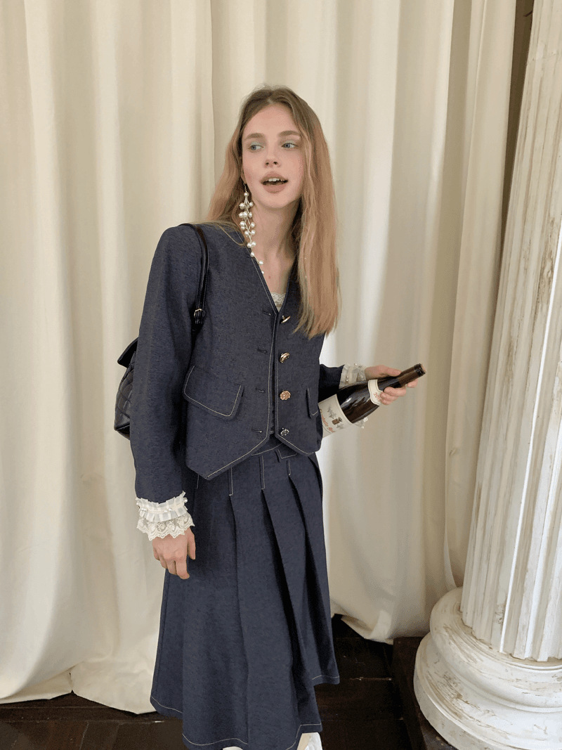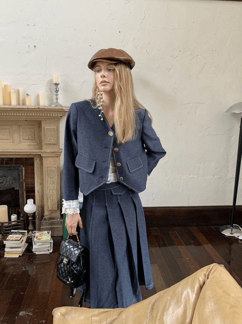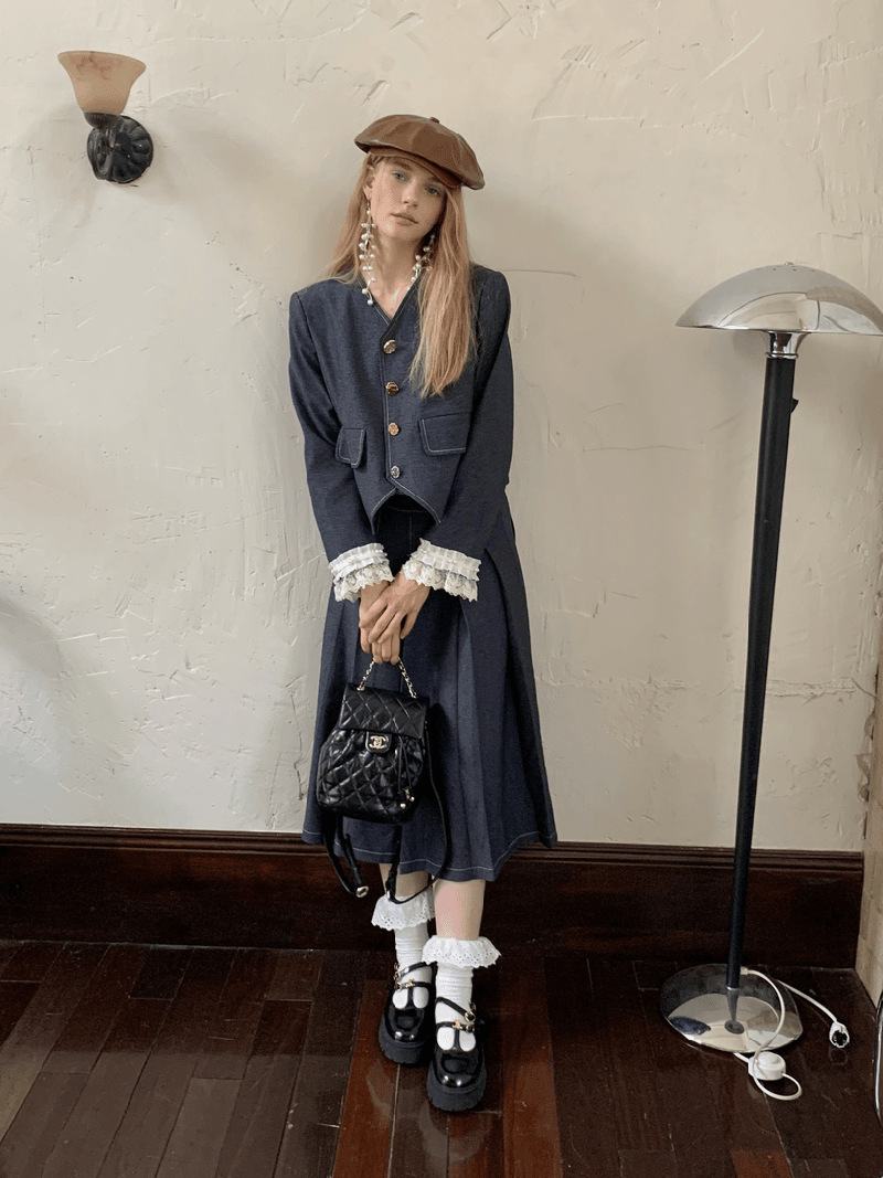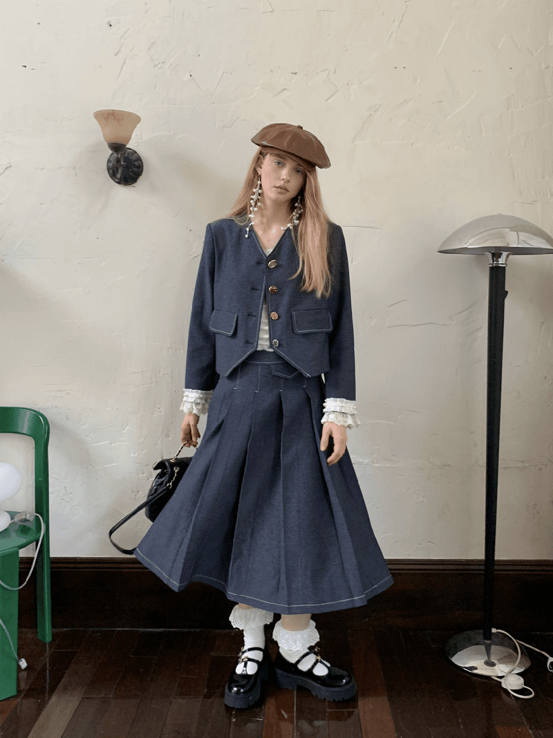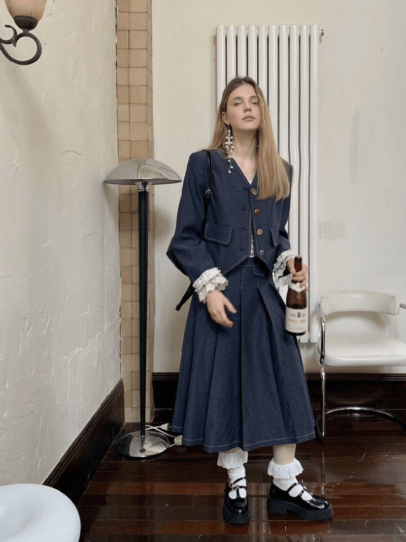 *o-ha-you*【FLKDYU702】藍調時光套裝小眾設計感深藍牛仔外套短款大擺半身裙秋