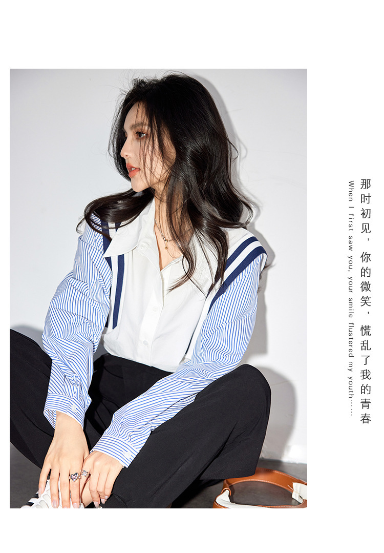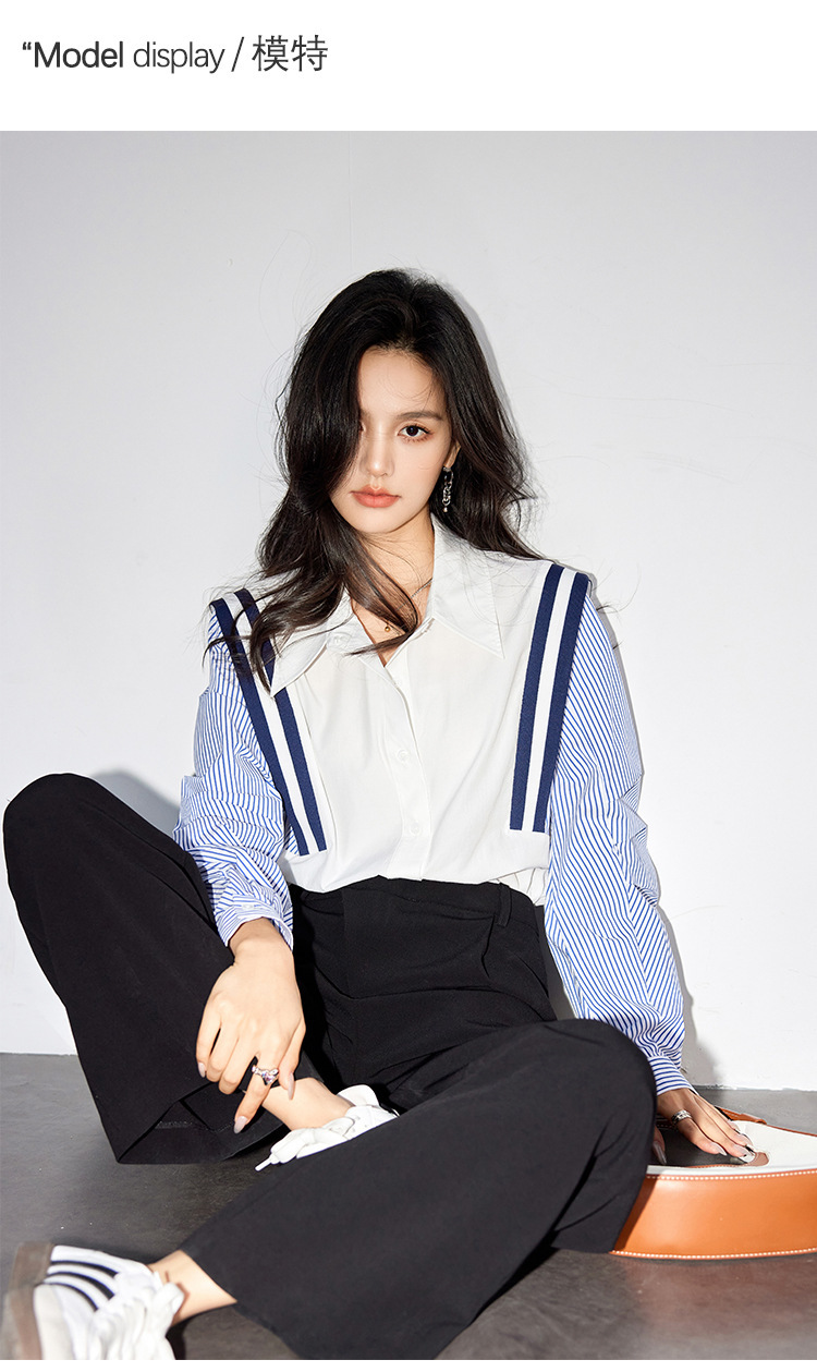 *o-ha-you*【FLKG90038】春季新款法式海軍藍撞色條紋襯衫2024長袖小眾別緻襯衫上衣