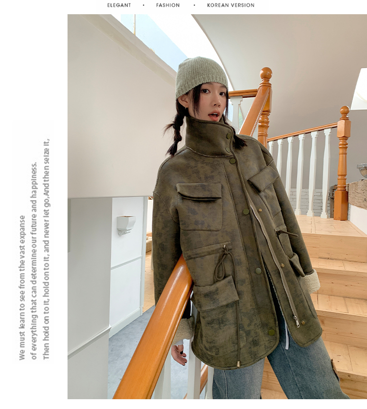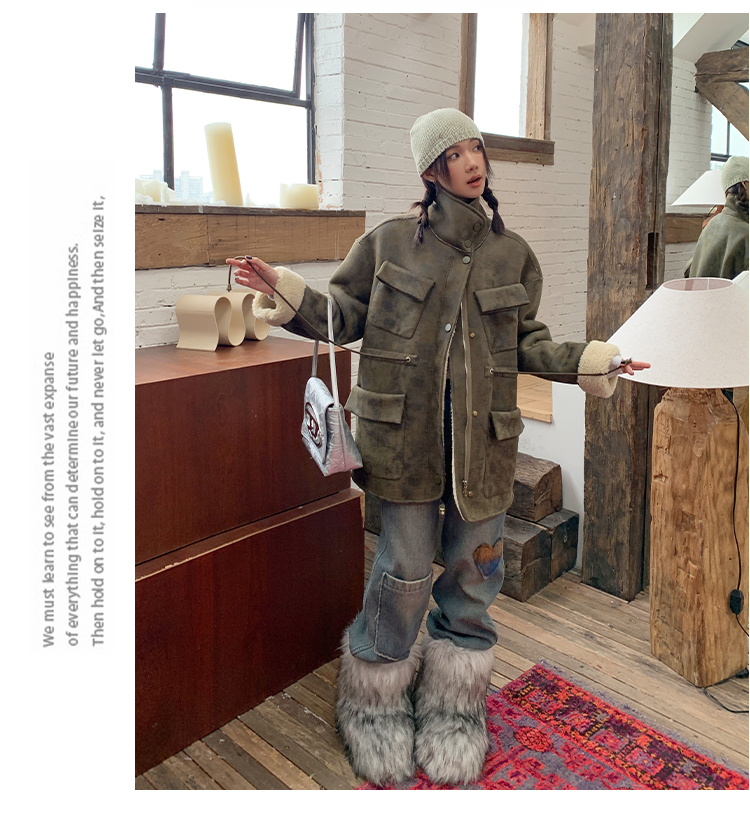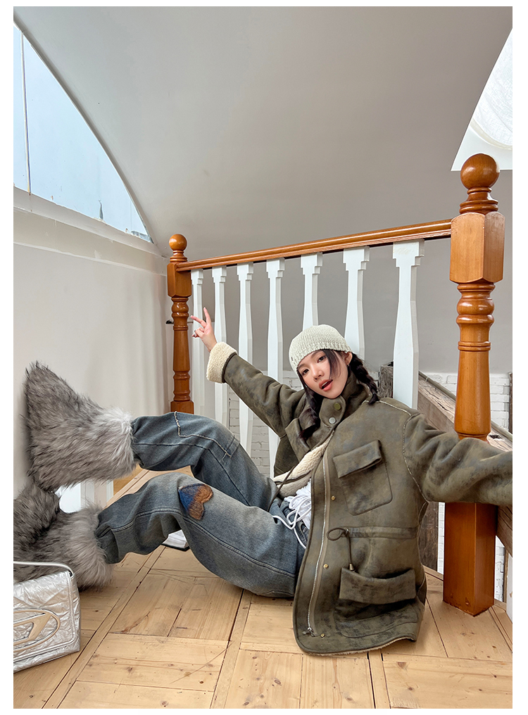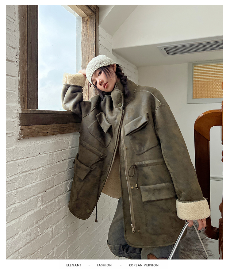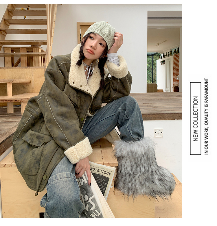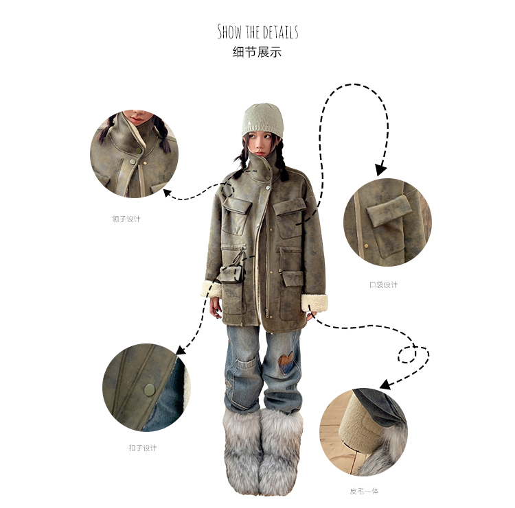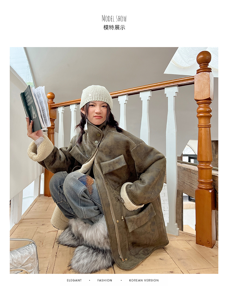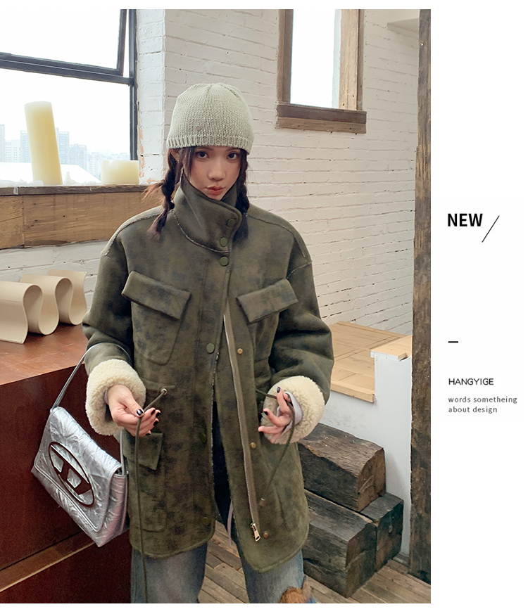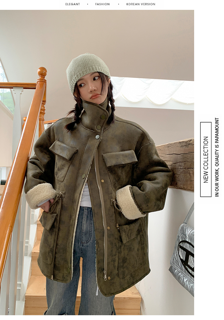 *o-ha-you*【FLKM09030】復古飛行員風軍綠色皮毛一體外套冬仿羊羔毛皮草大衣