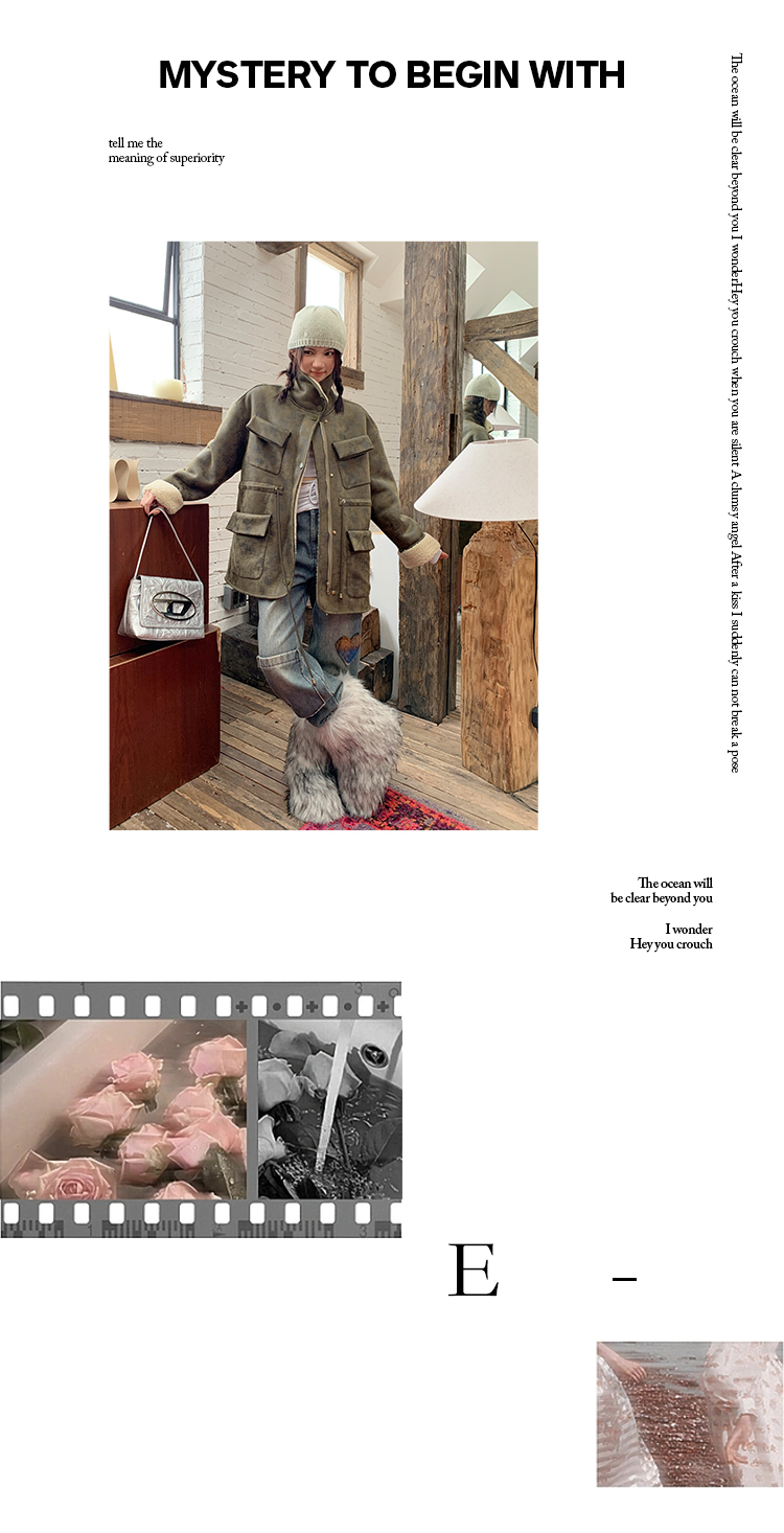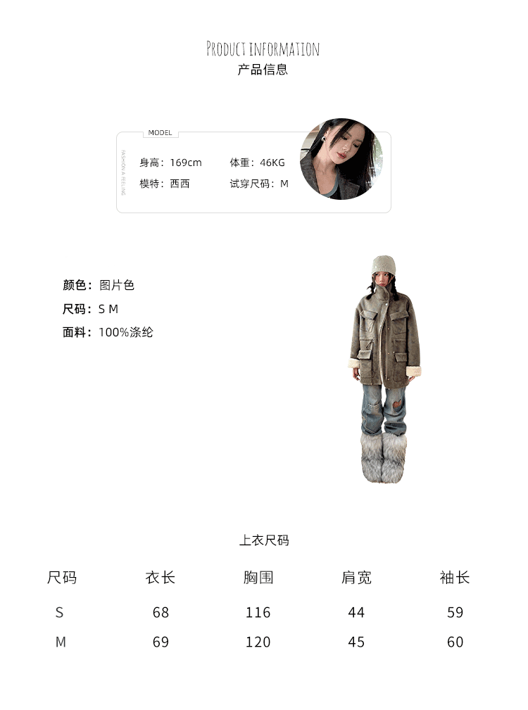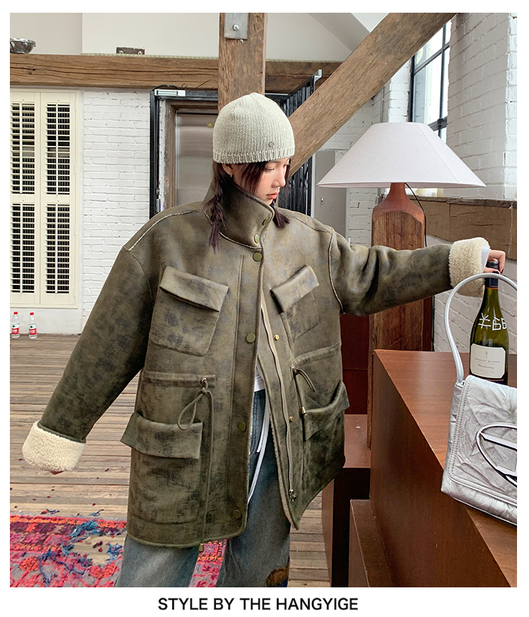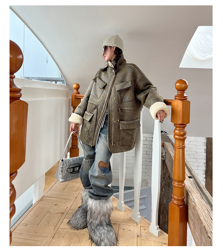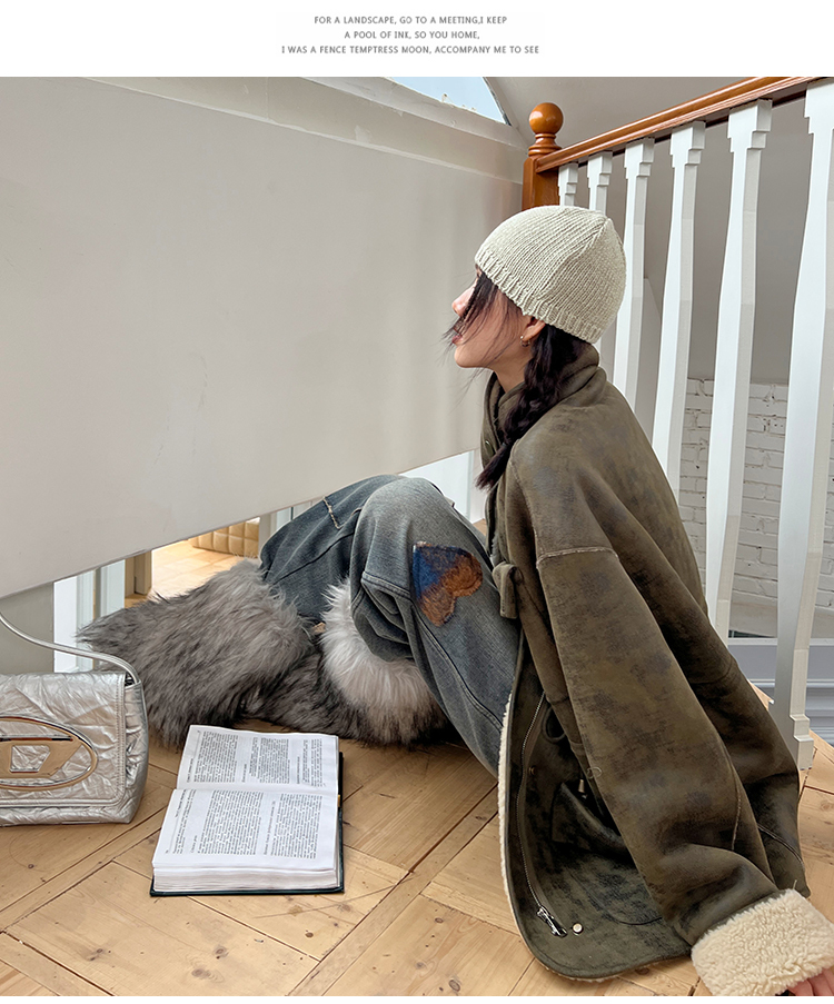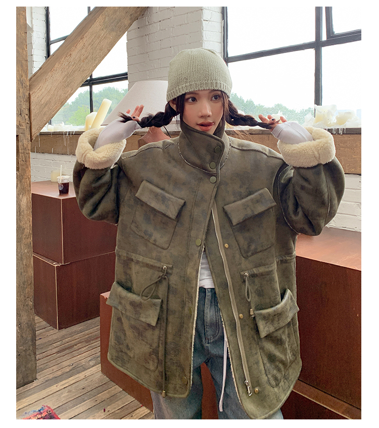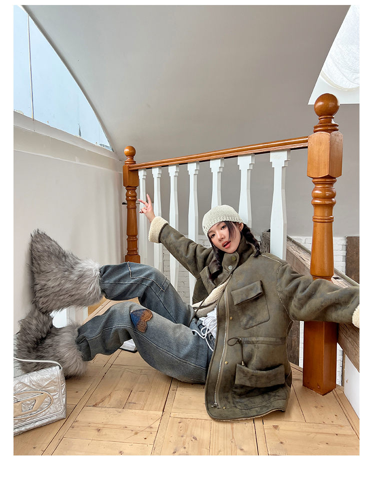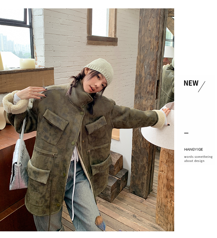 *o-ha-you*【FLKM09030】復古飛行員風軍綠色皮毛一體外套冬仿羊羔毛皮草大衣