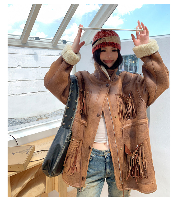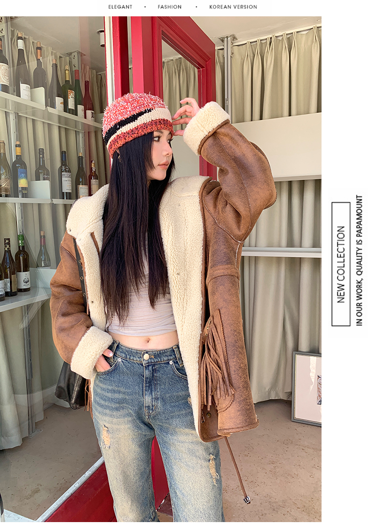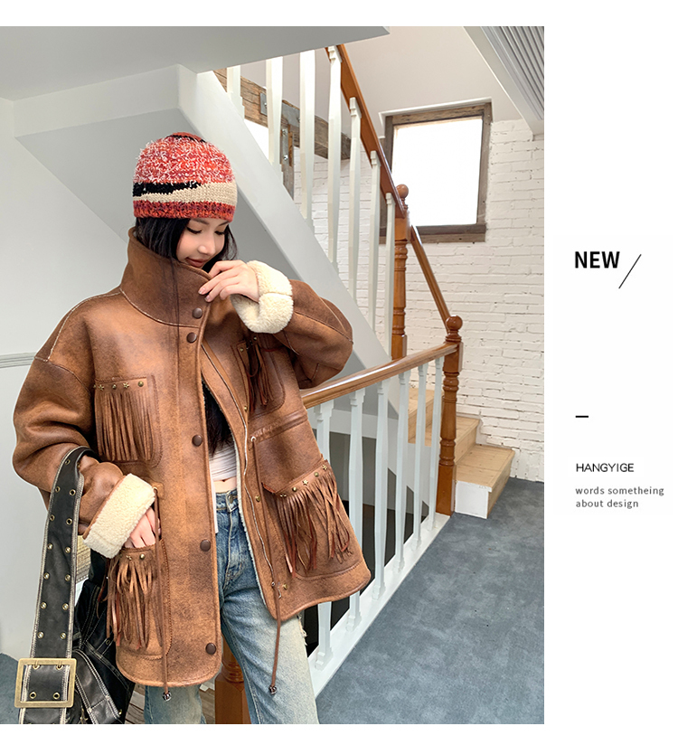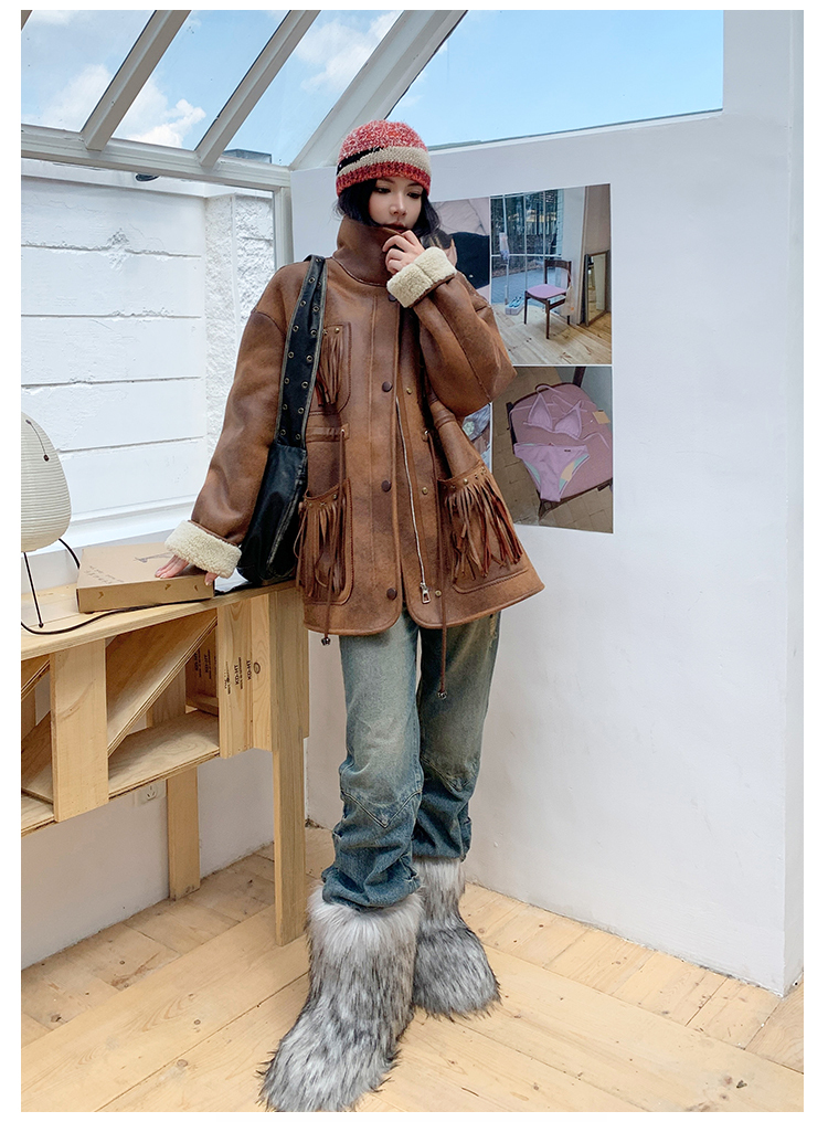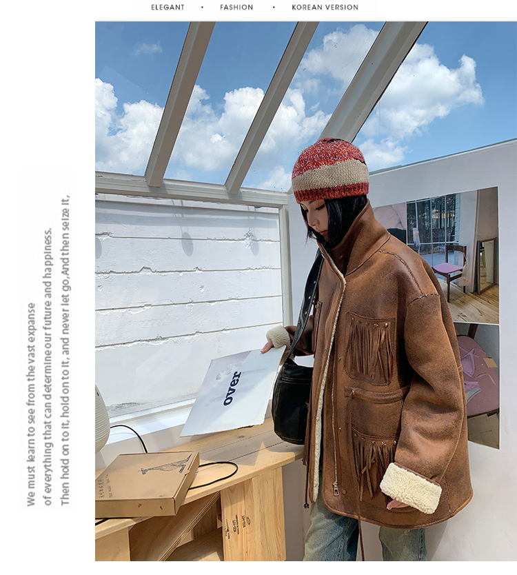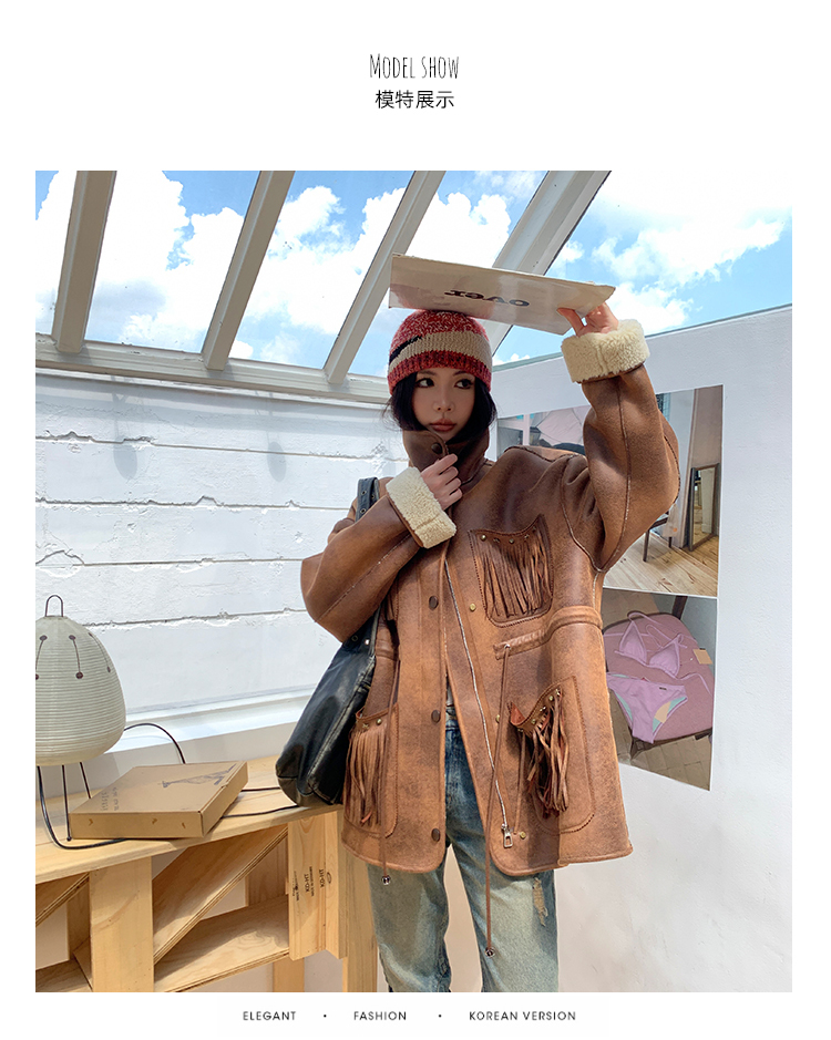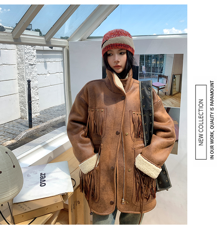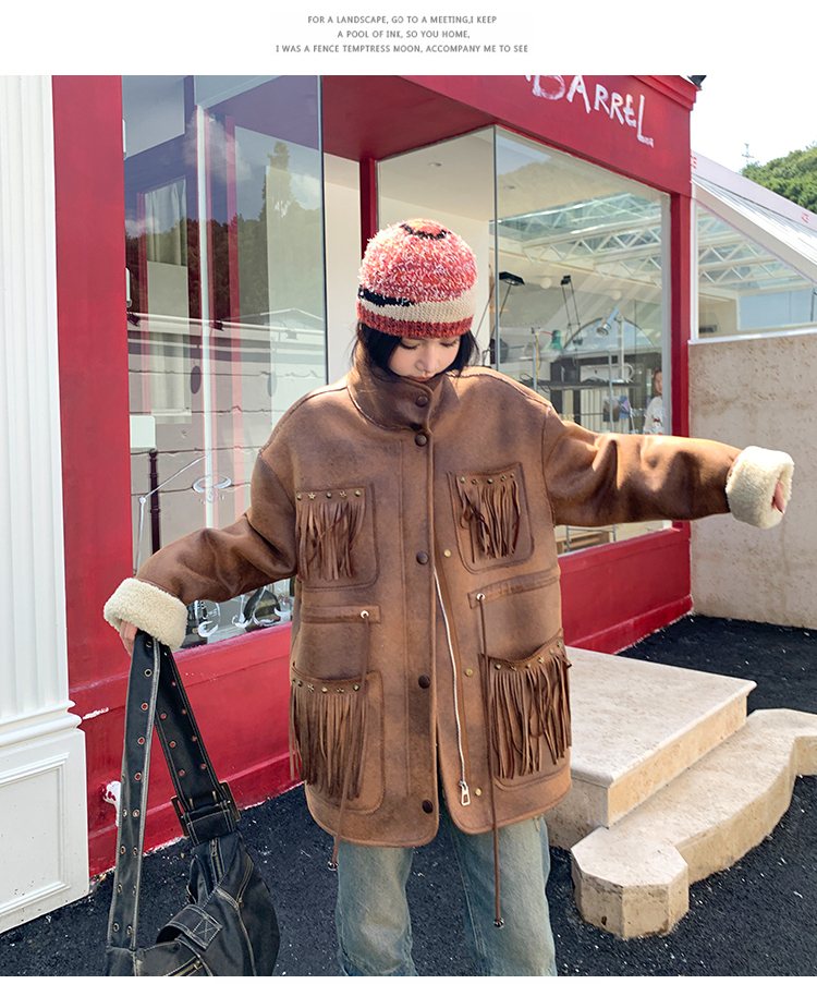 *o-ha-you*【FLKM09038】流蘇工藝棕色仿皮毛一體外套冬流蘇立領皮草大衣