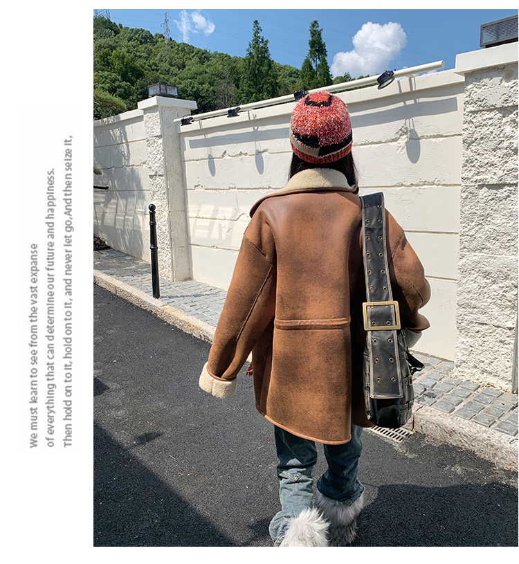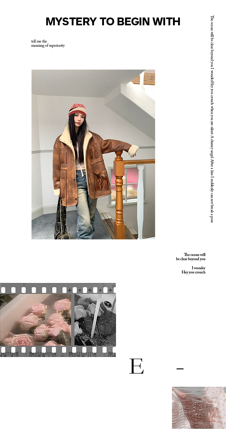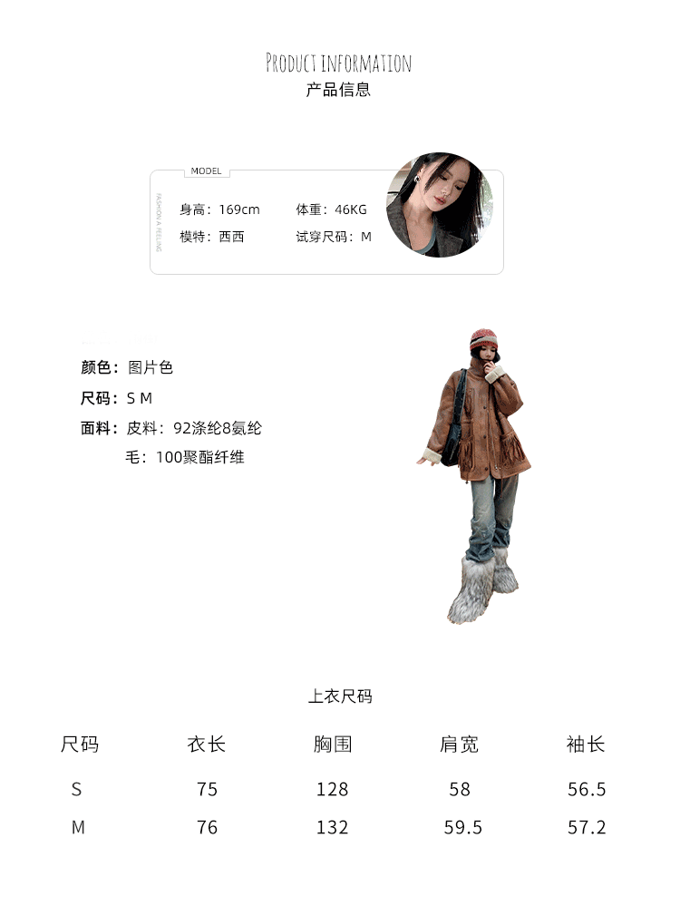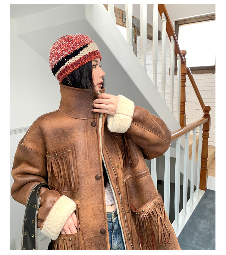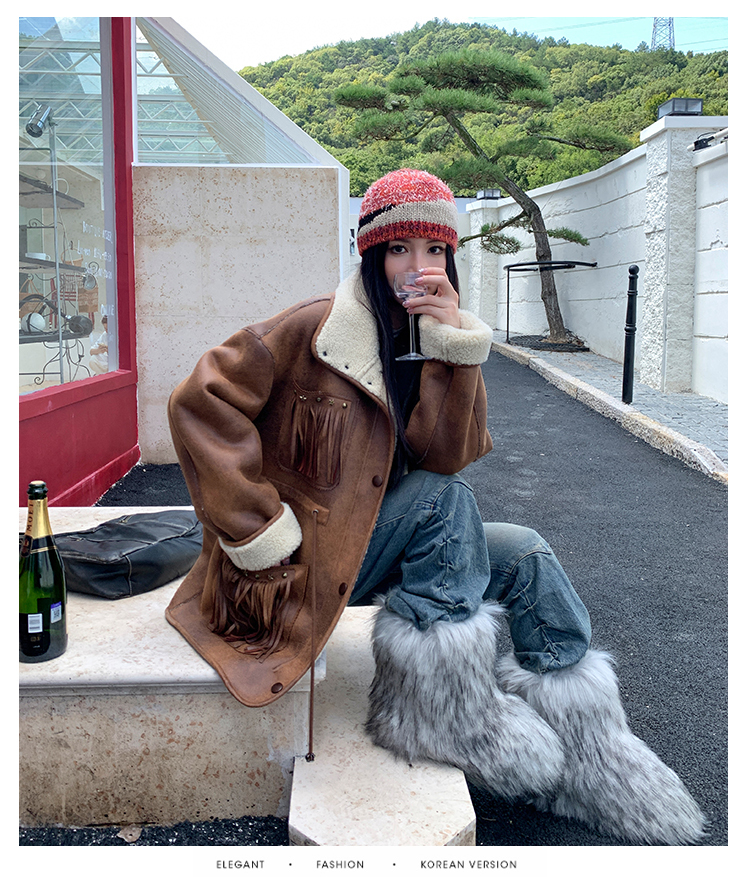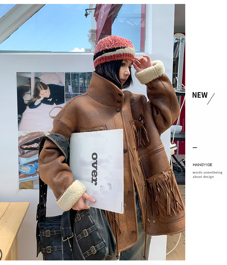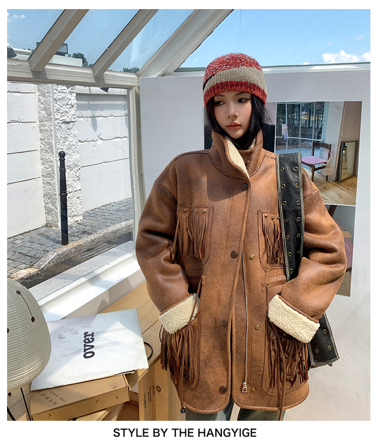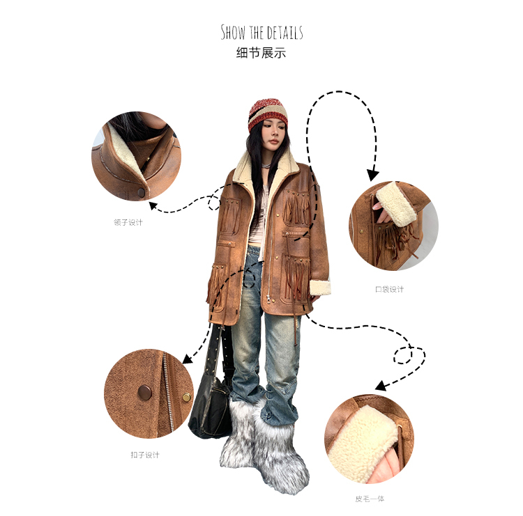 *o-ha-you*【FLKM09038】流蘇工藝棕色仿皮毛一體外套冬流蘇立領皮草大衣