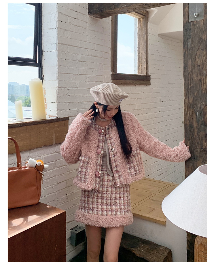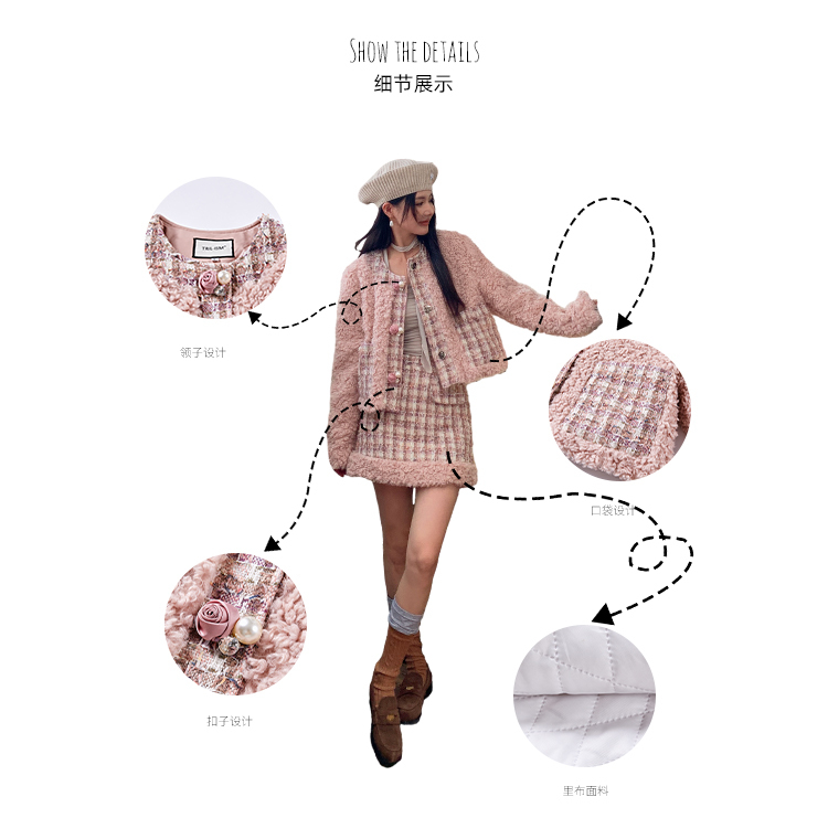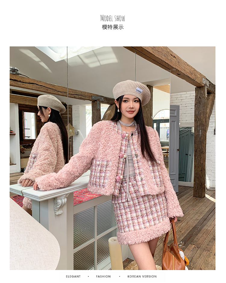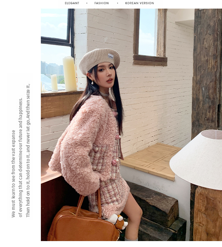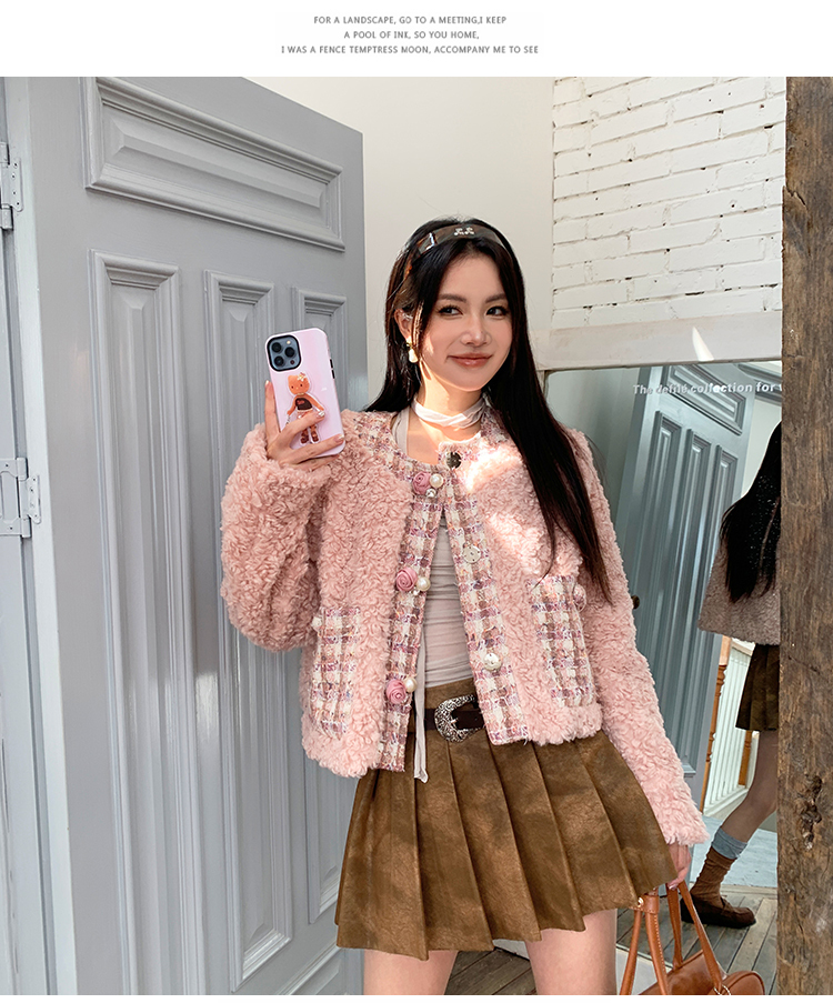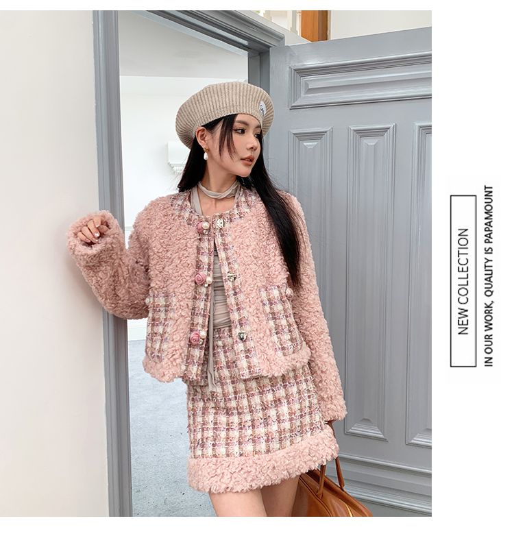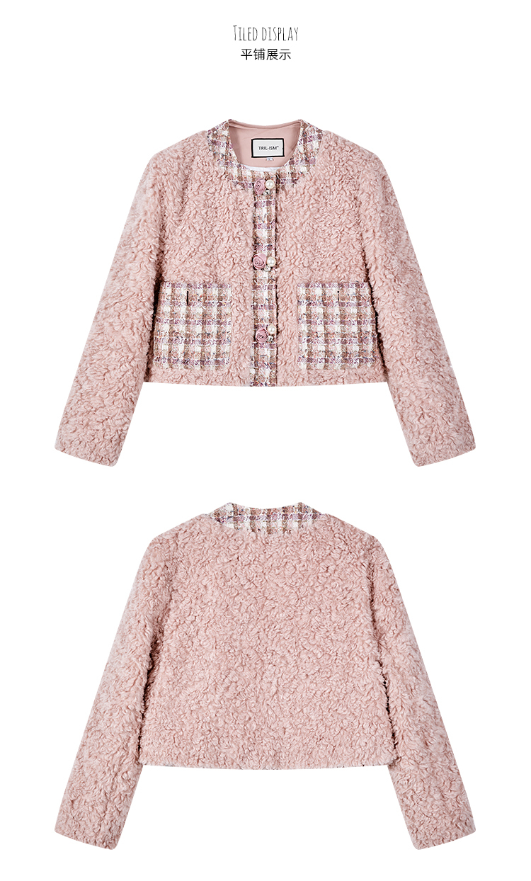 *o-ha-you*【FLKM10636】2023年冬季復古法式小香風格子毛呢拼接粉紅仿羊捲毛草外套