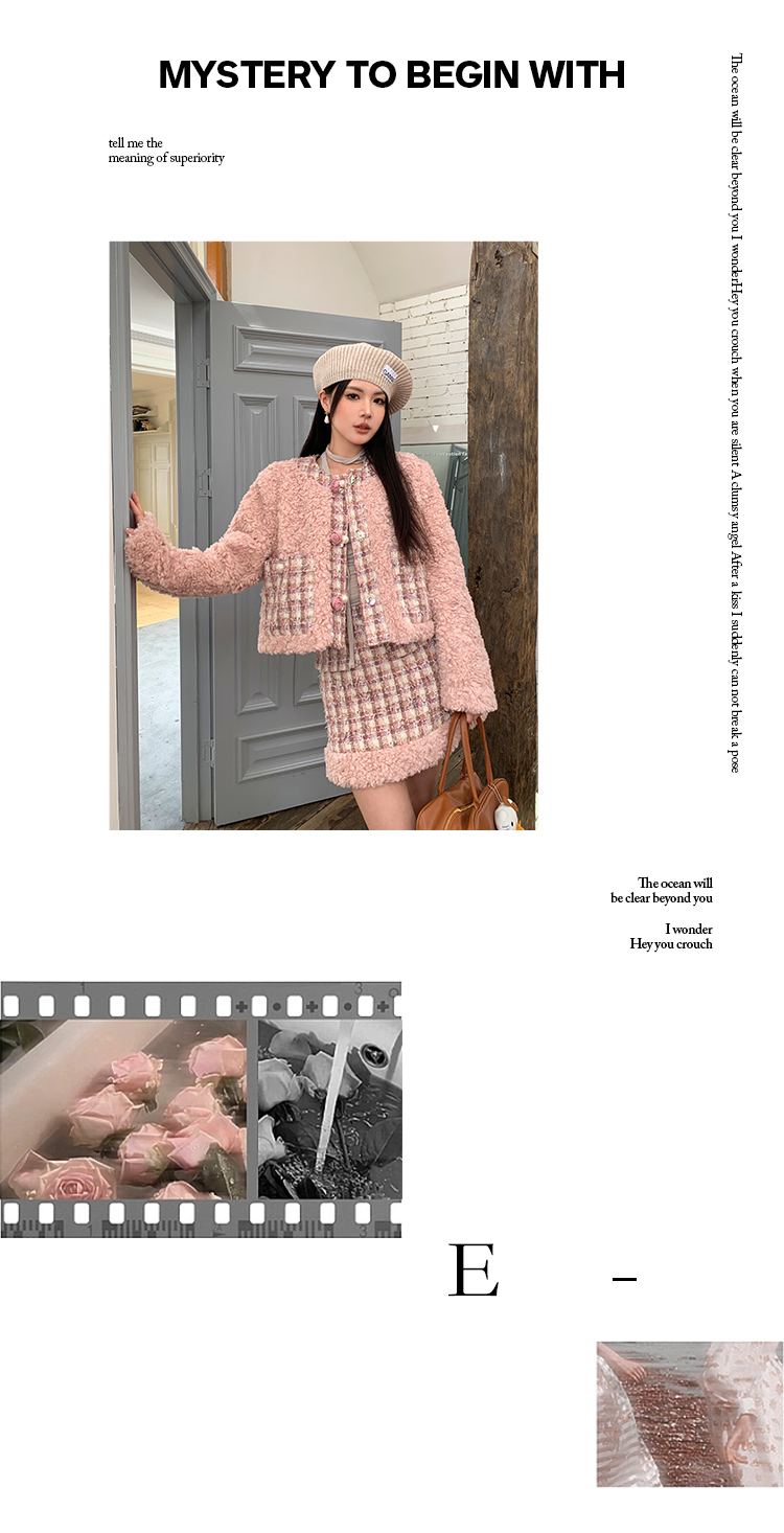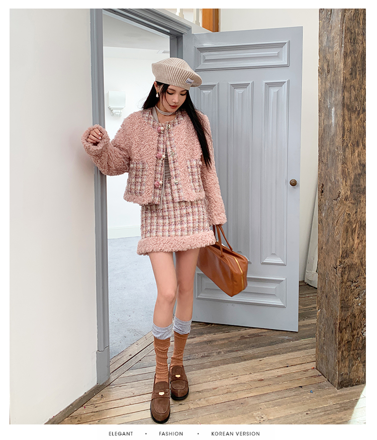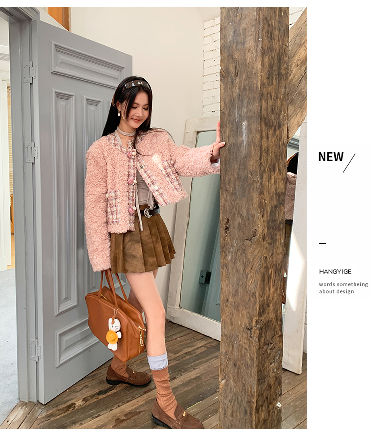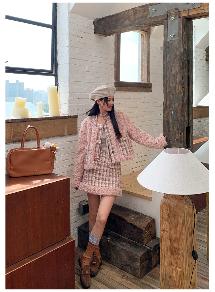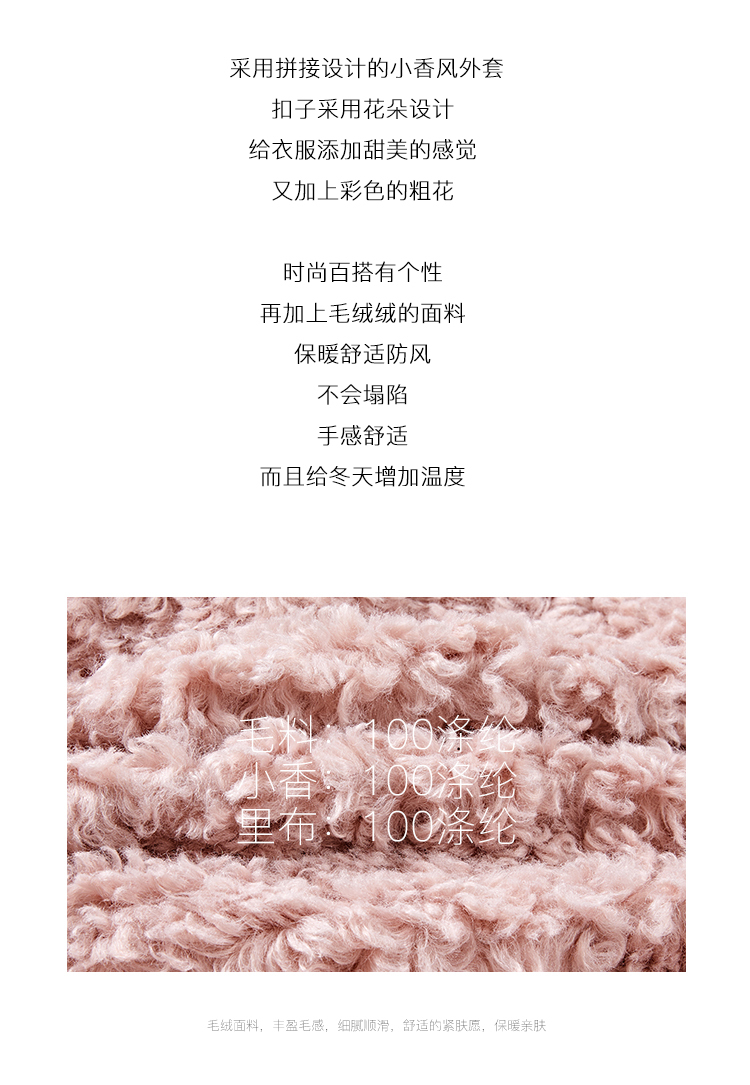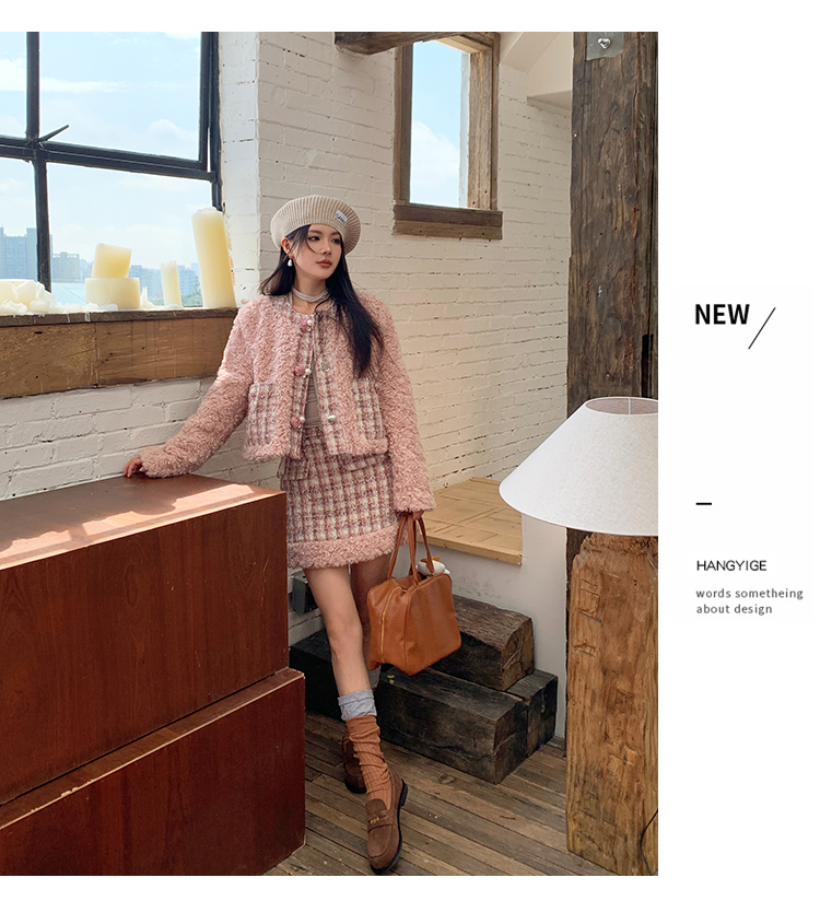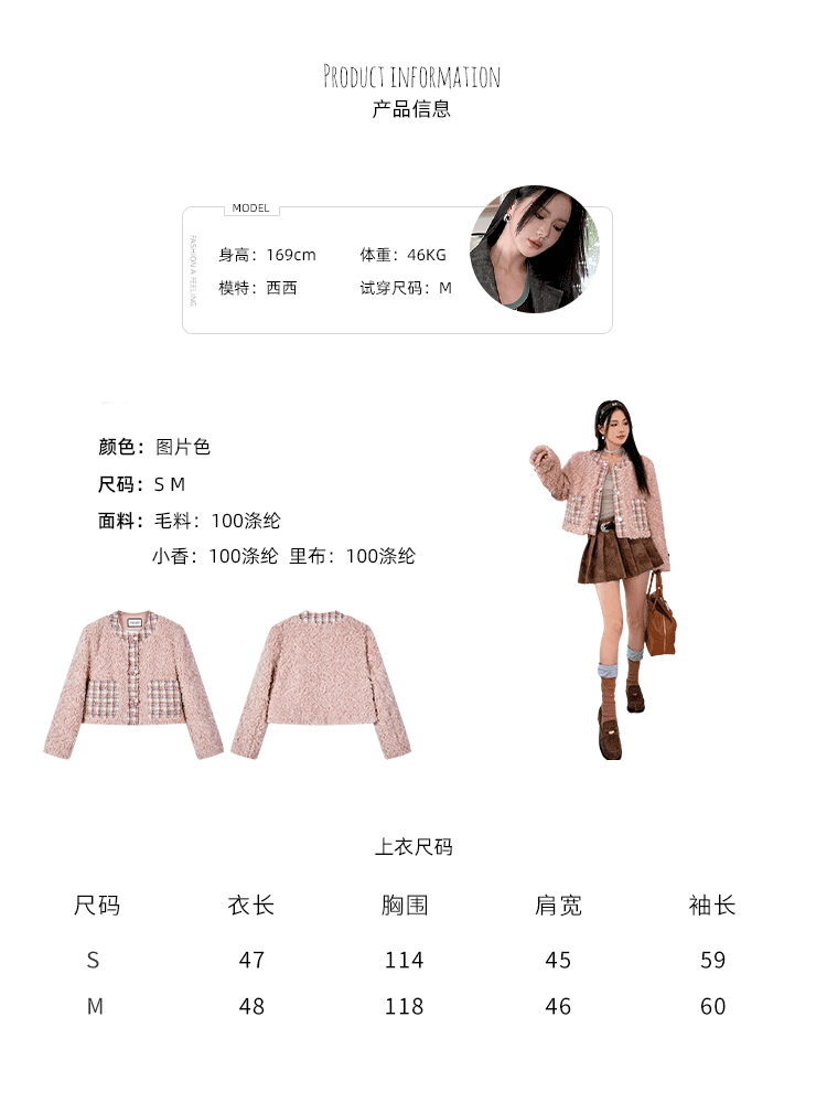 *o-ha-you*【FLKM10636】2023年冬季復古法式小香風格子毛呢拼接粉紅仿羊捲毛草外套
