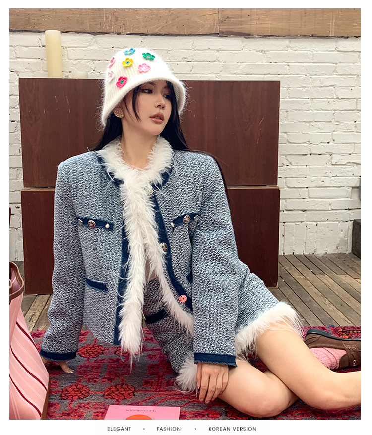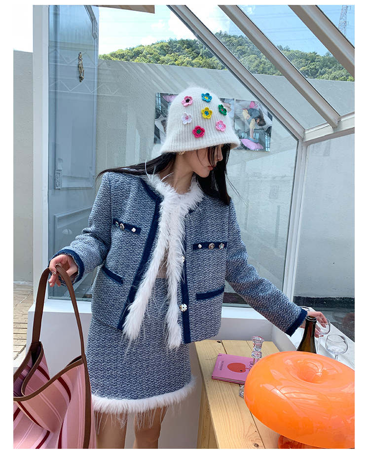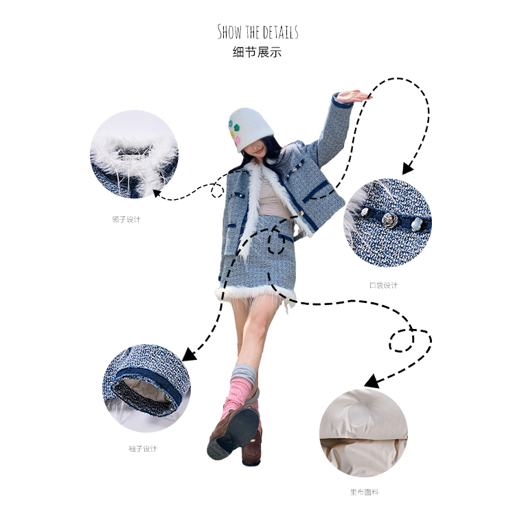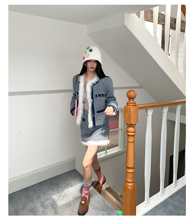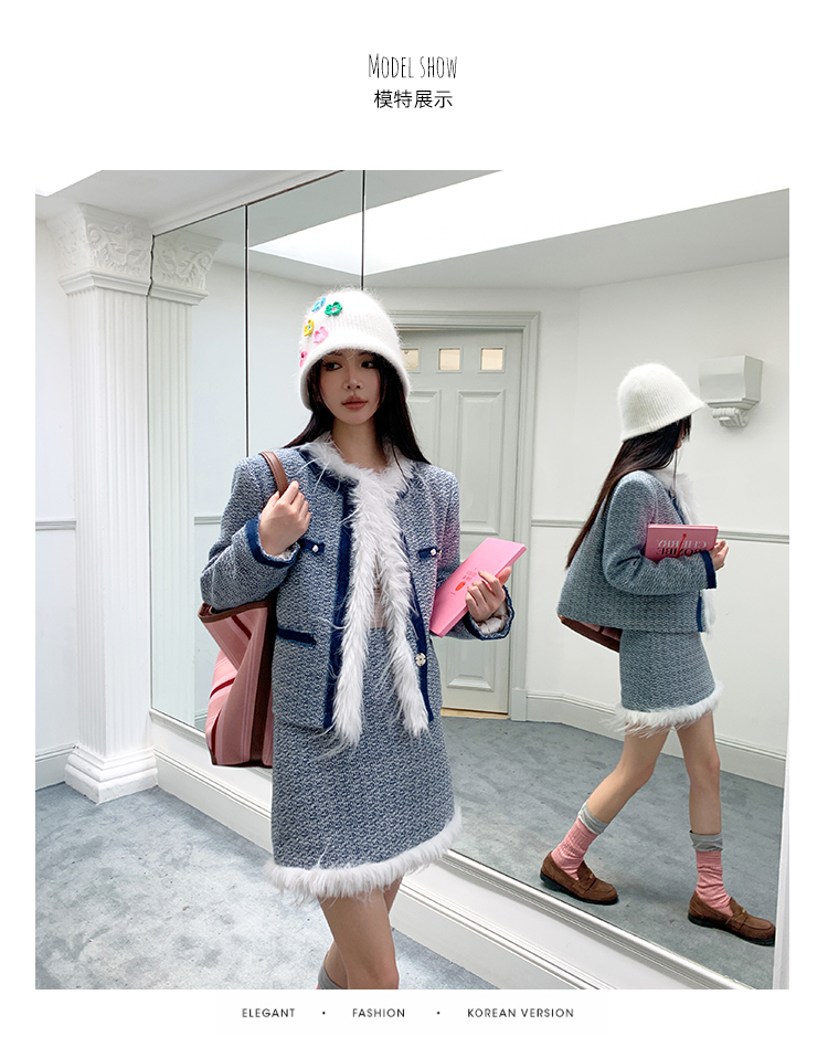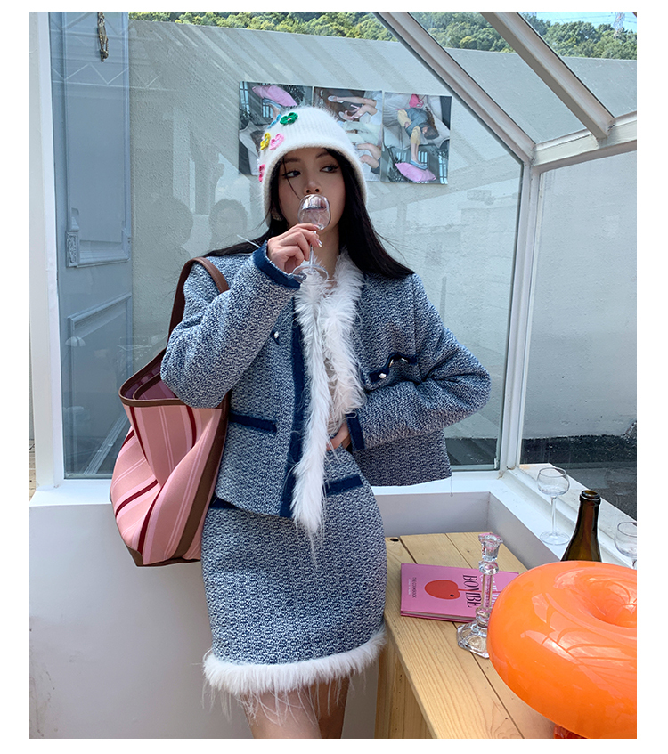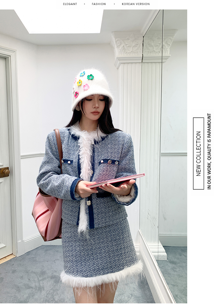 *o-ha-you*【FLKM10637】復古法師冬毛領小香粗花呢羽絨外套高腰半身裙套裝