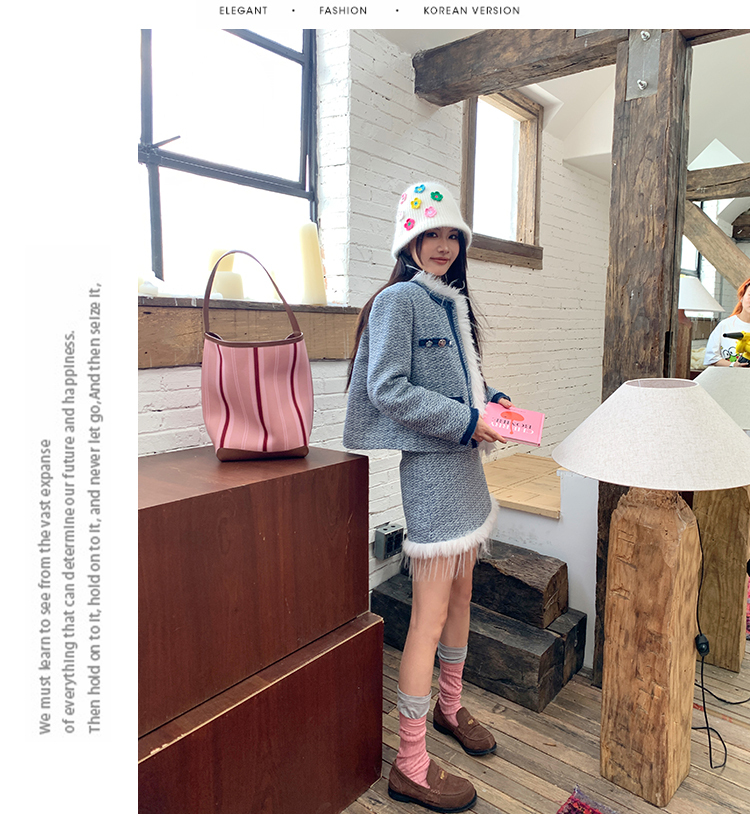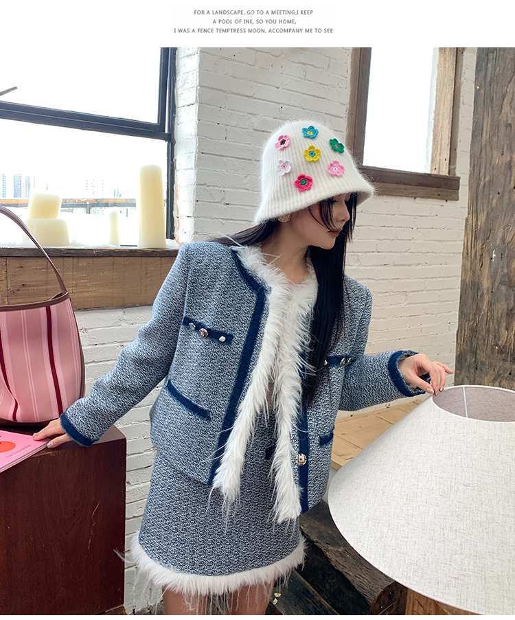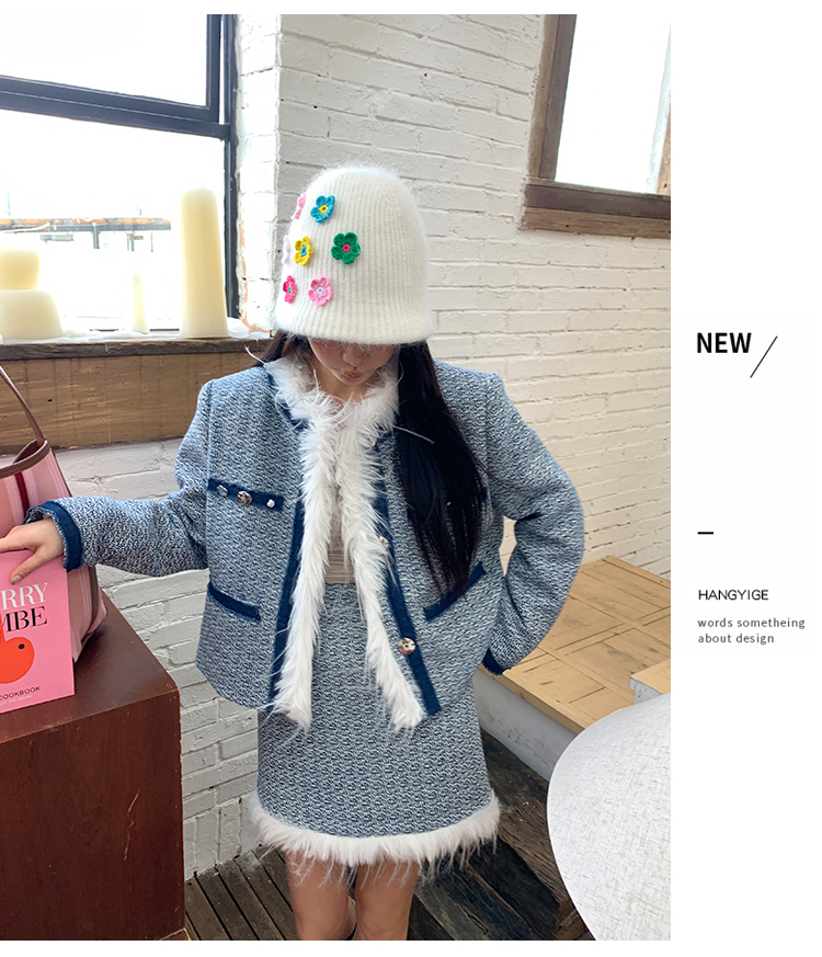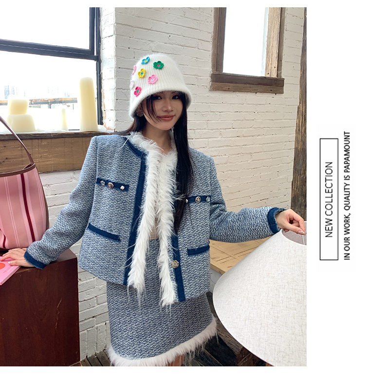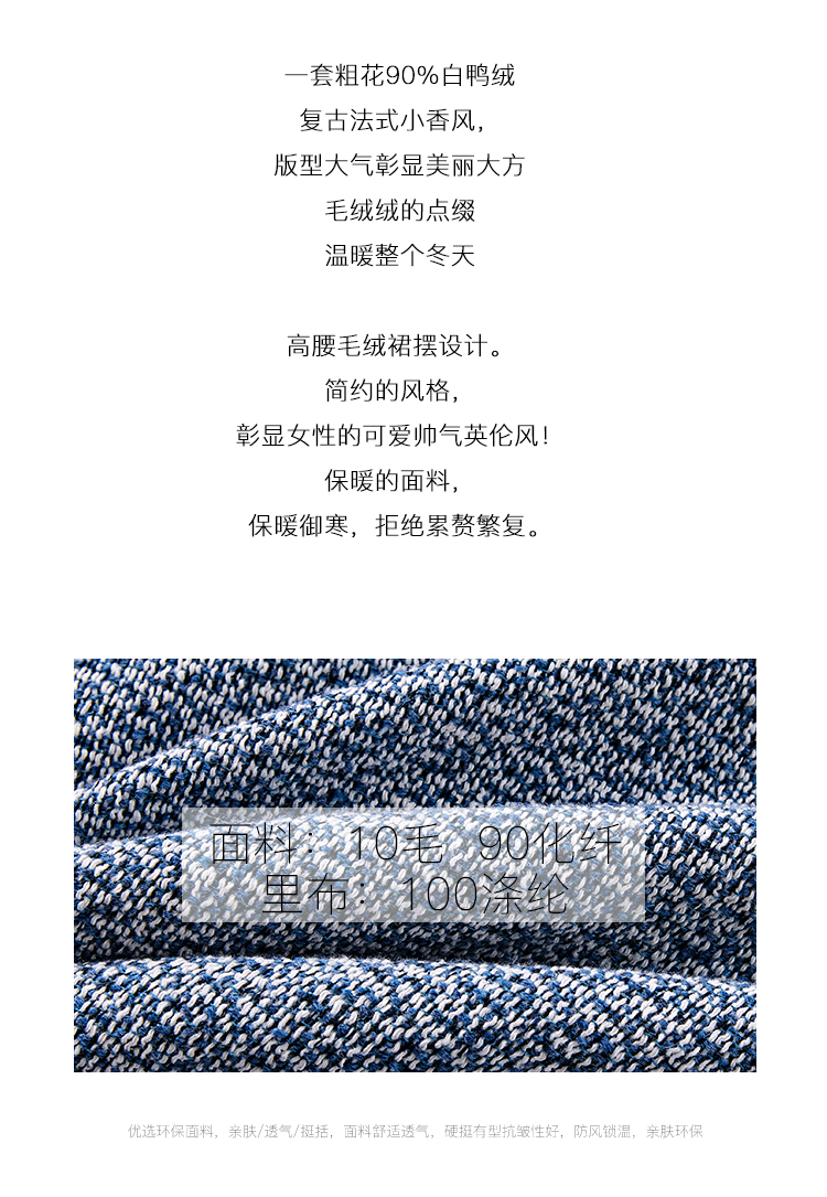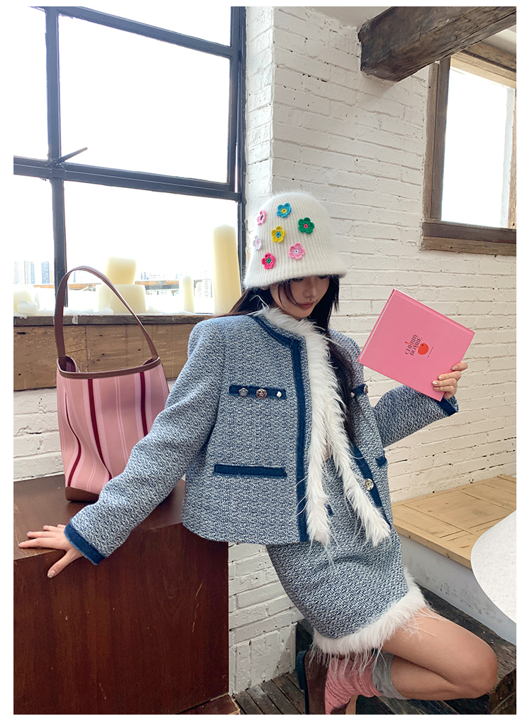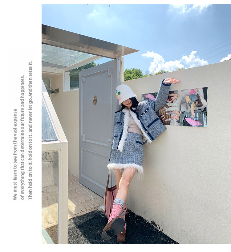 *o-ha-you*【FLKM10637】復古法師冬毛領小香粗花呢羽絨外套高腰半身裙套裝