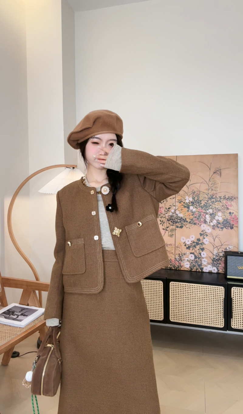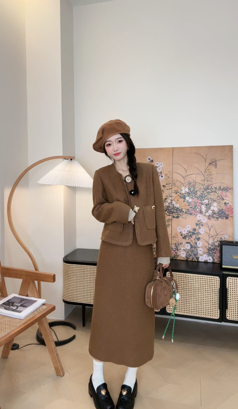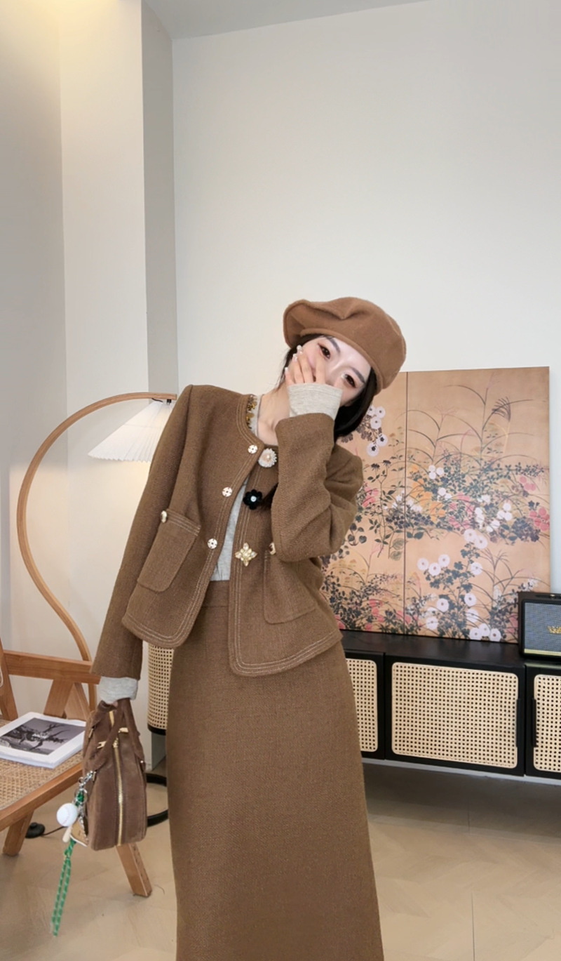 *o-ha-you*【FLKN0080】夢境交錯套裝復古咖色顯白小眾設計感半身裙兩件套秋季新款