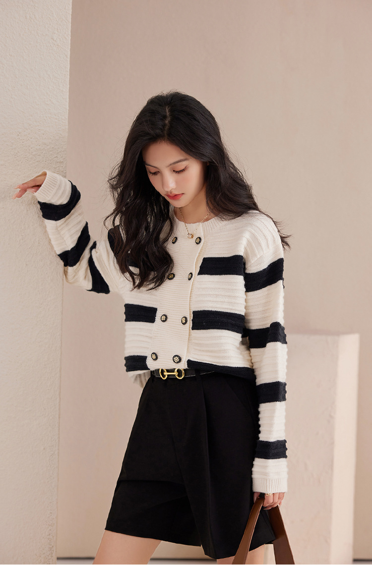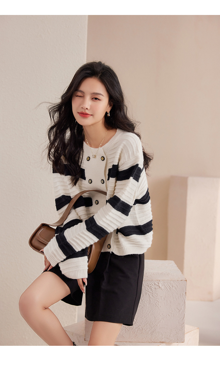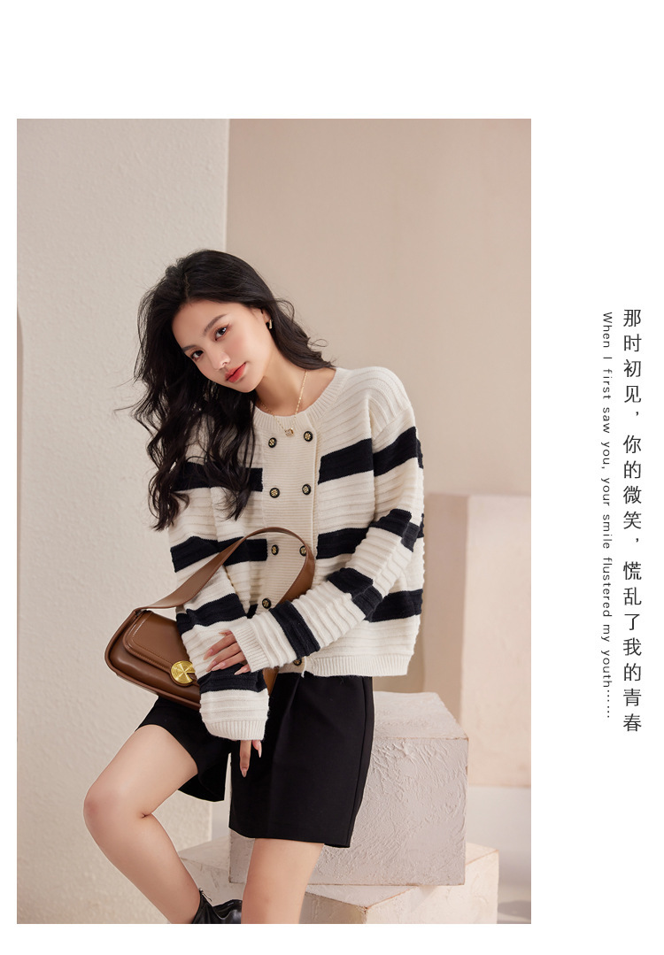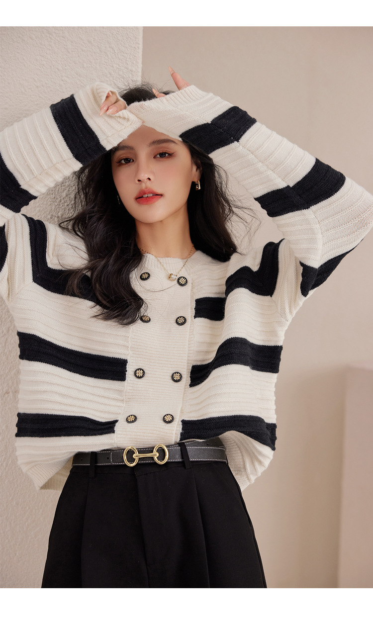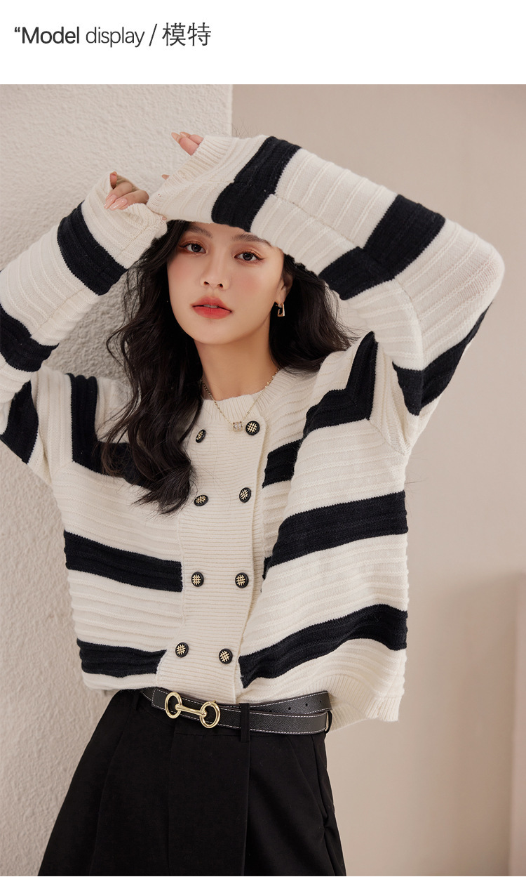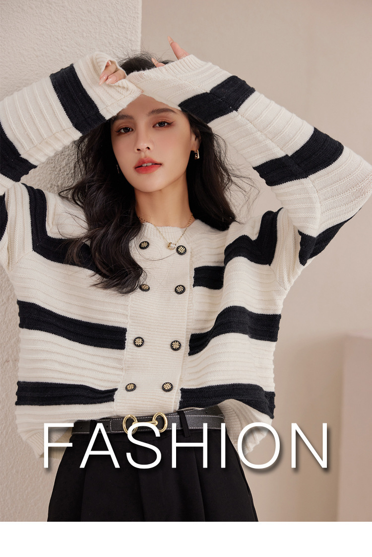 *o-ha-you*【FLKO30105】秋法式名媛小香風撞色條紋溜肩針織開襟衫優雅上衣外穿外套