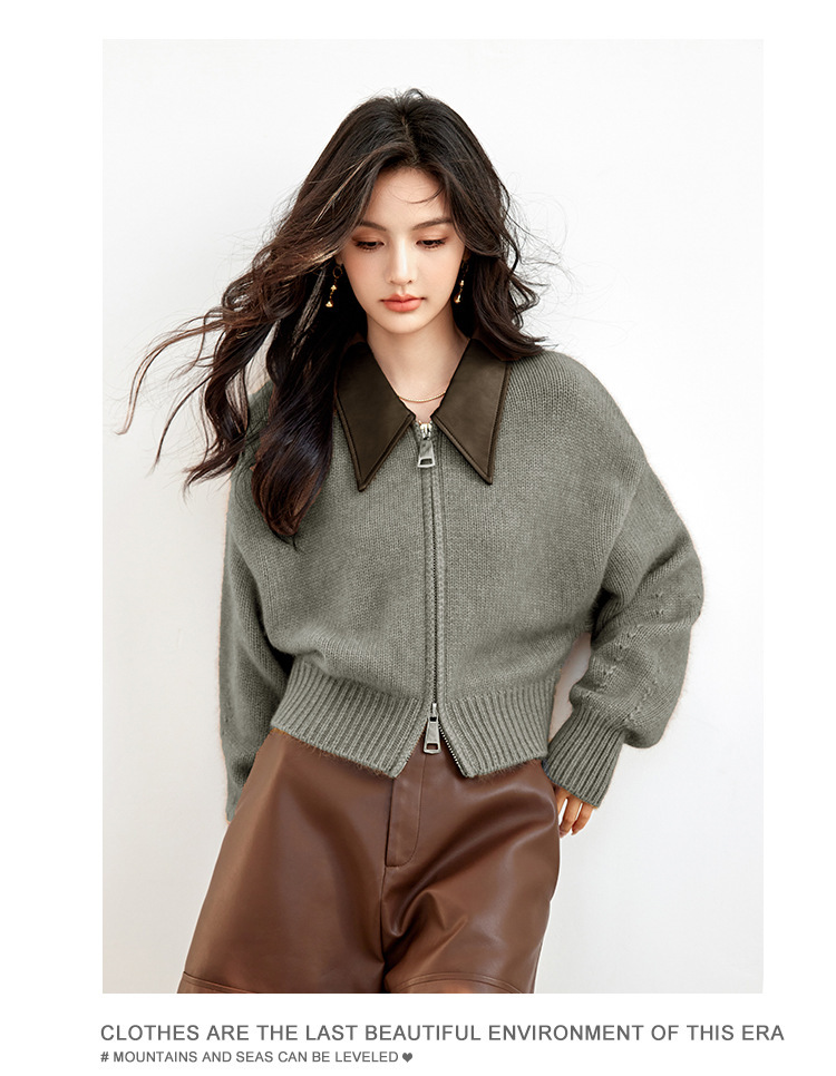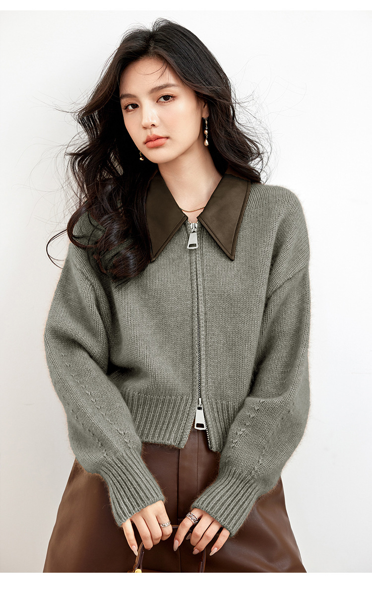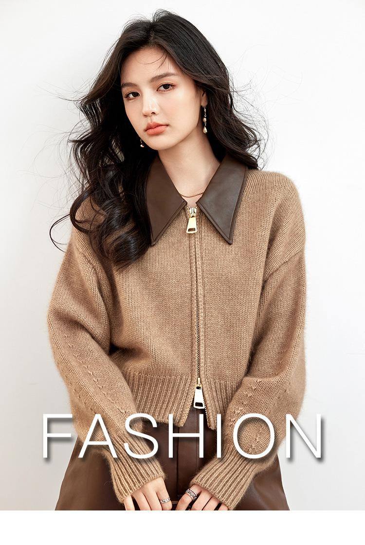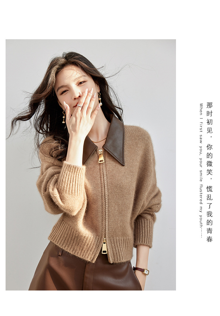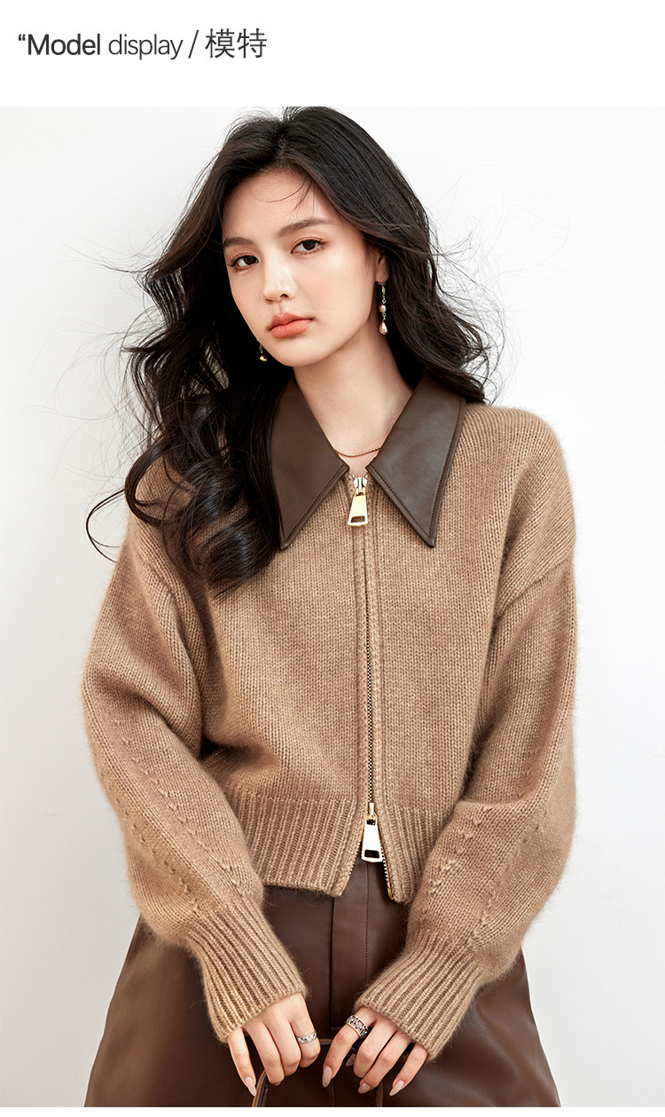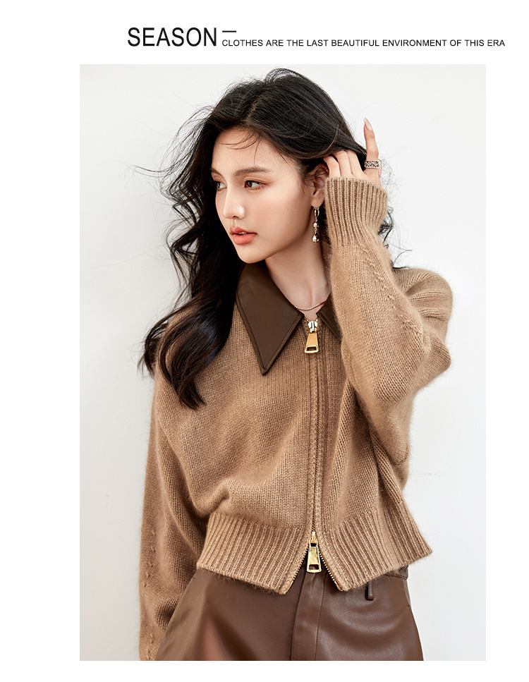 *o-ha-you*【FLKO30130】復古小眾設計感雙拉鍊針織外套秋卡其秋拼皮短版毛衣開襟衫-2色