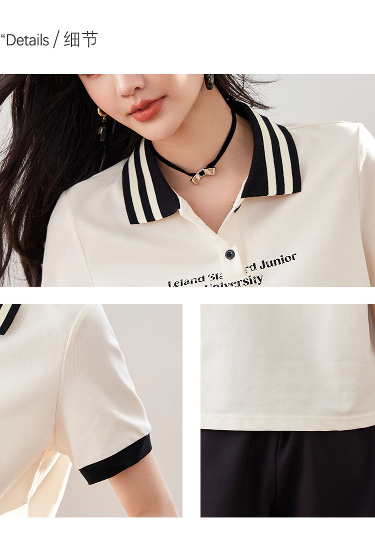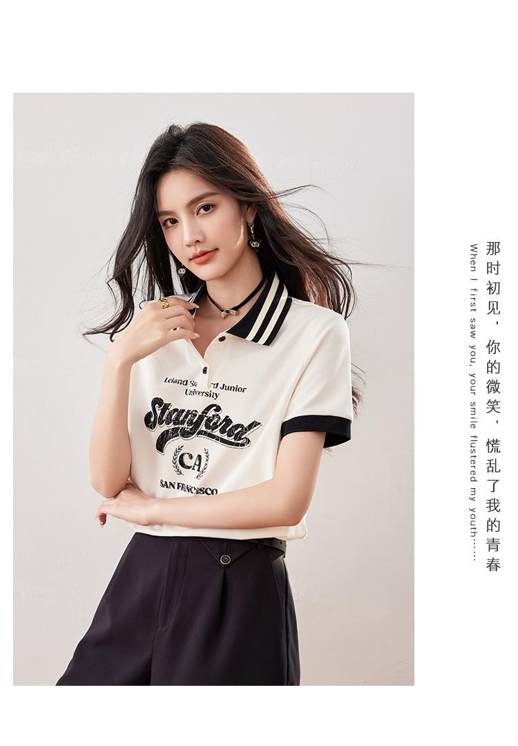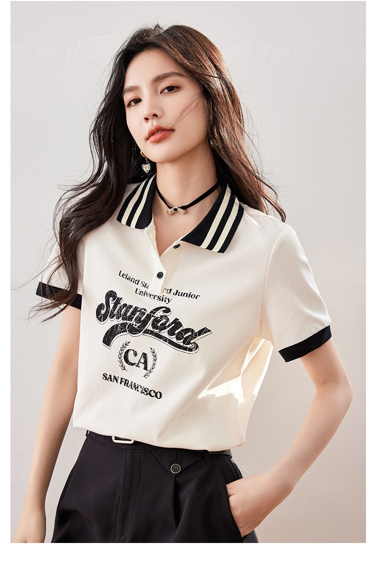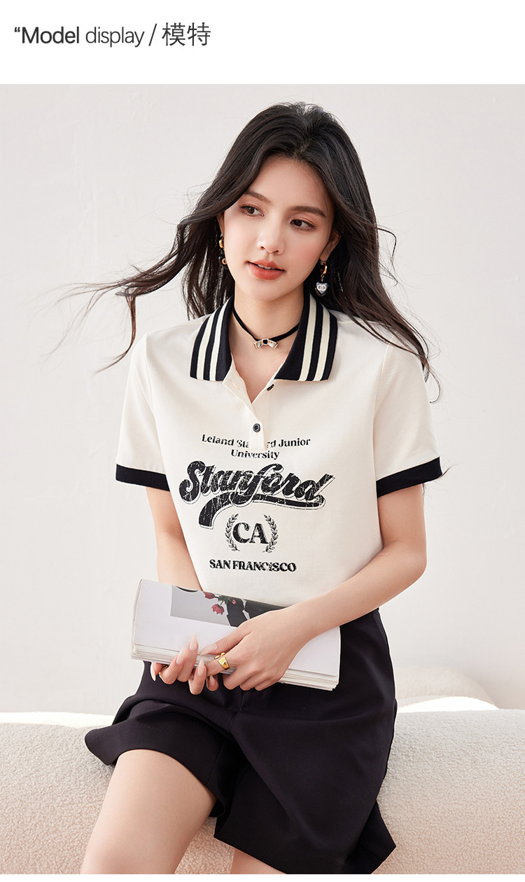 *o-ha-you*【FLKO30335】夏字母修身小個子棉質復古米白條紋POLO領T恤印花短袖襯衣