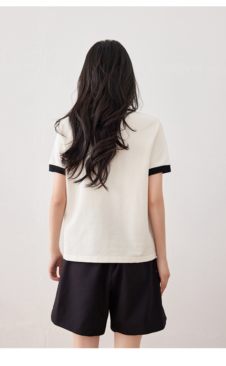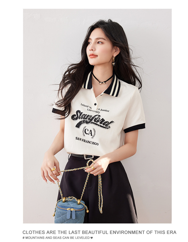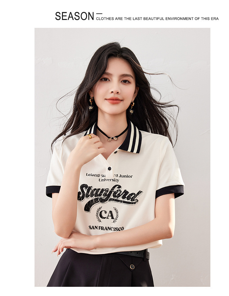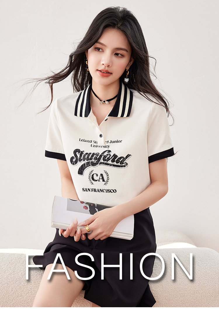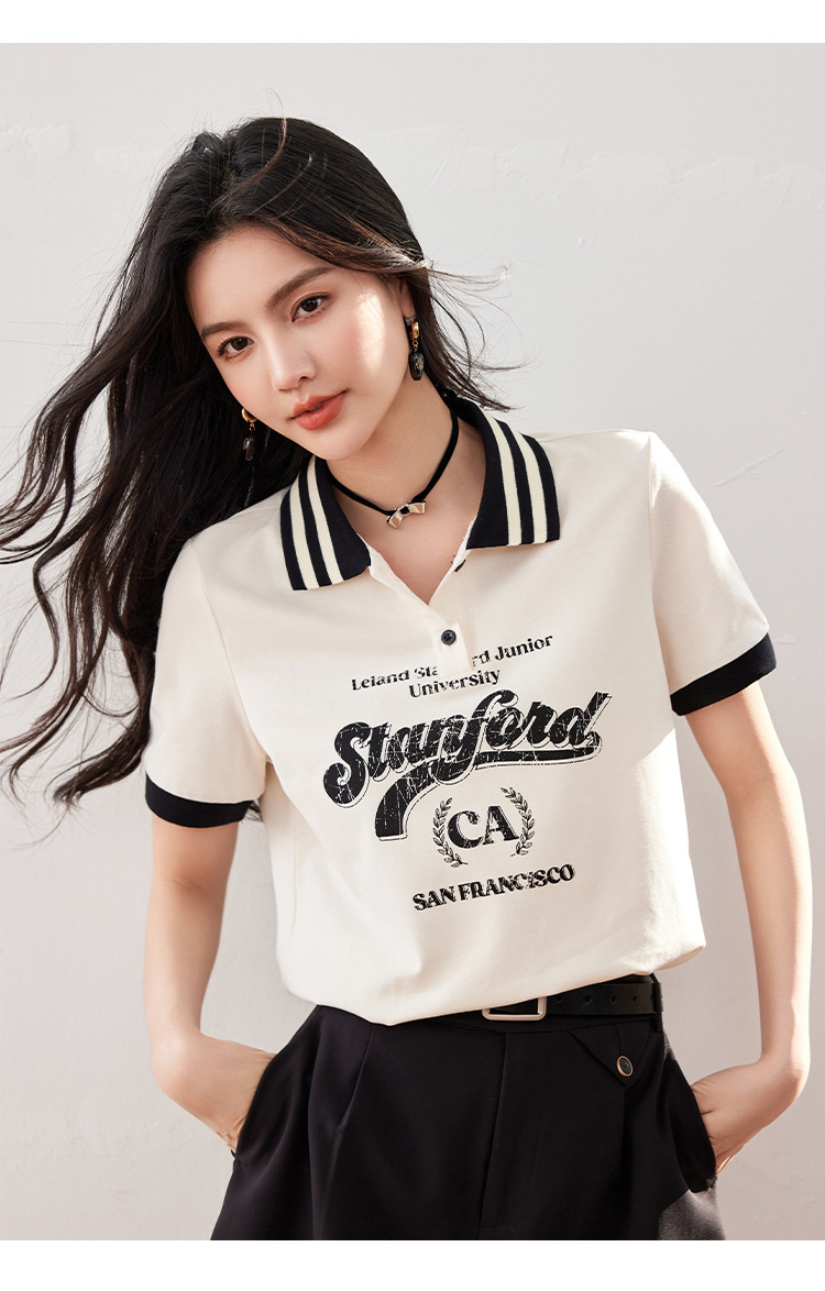*o-ha-you*【FLKO30335】夏字母修身小個子棉質復古米白條紋POLO領T恤印花短袖襯衣
