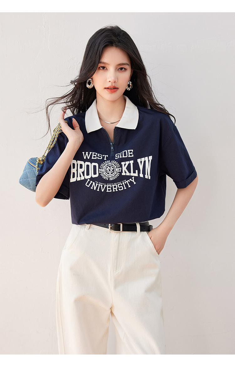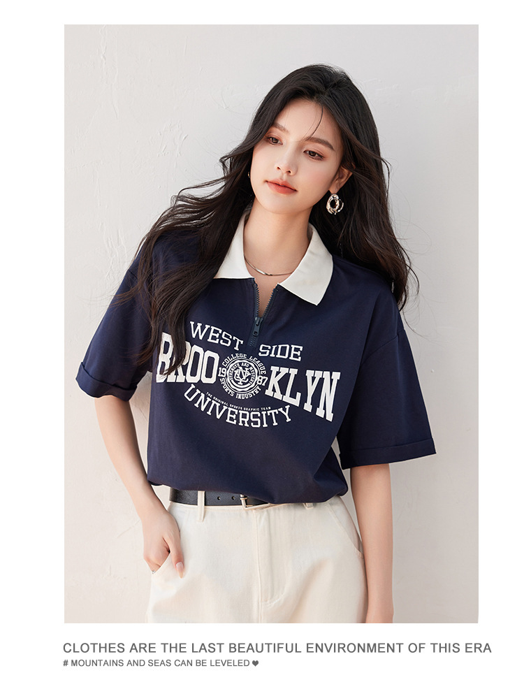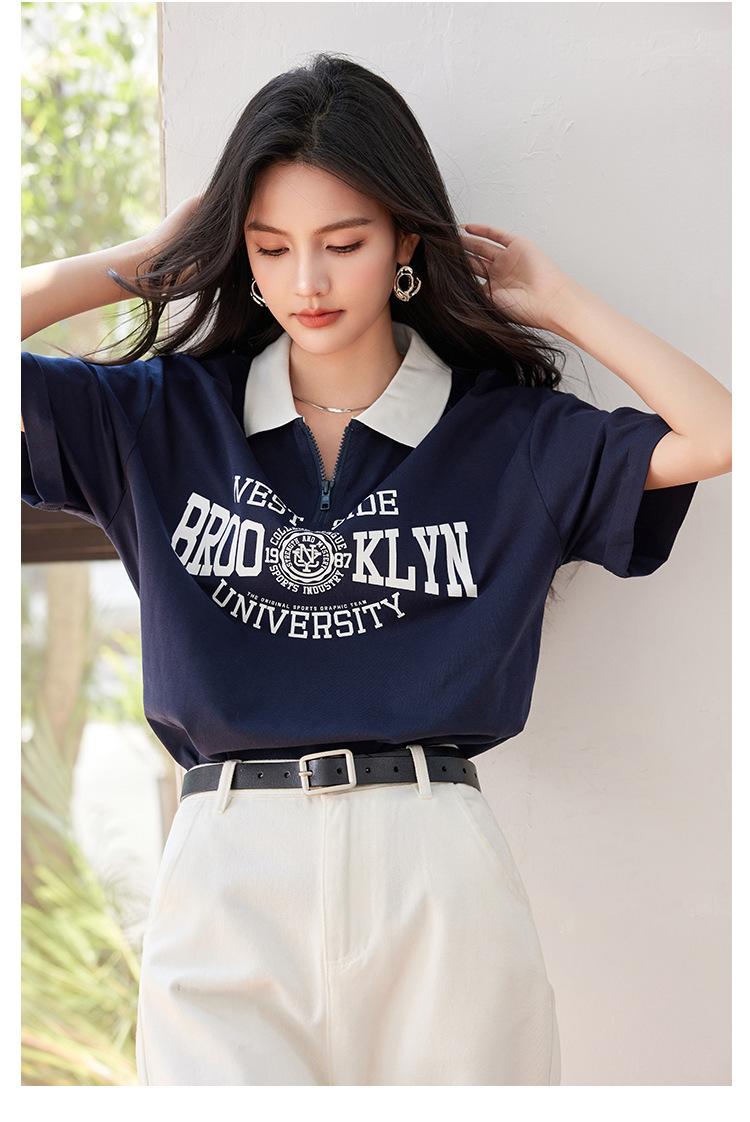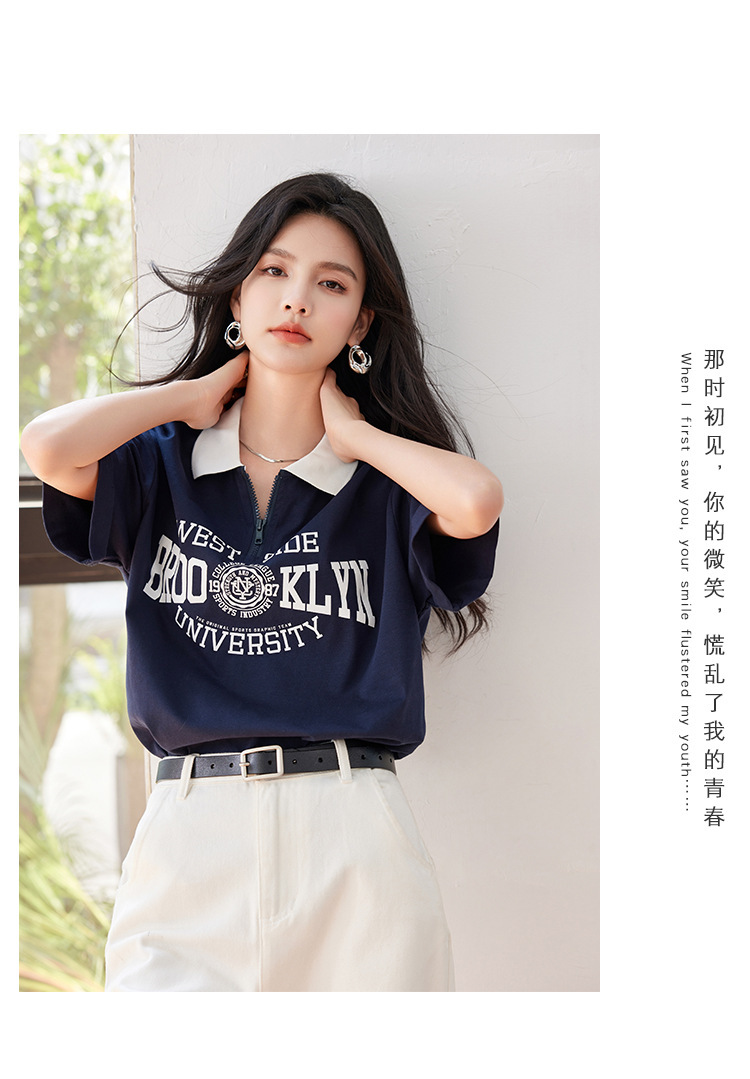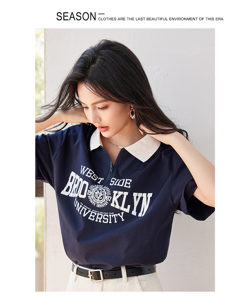*o-ha-you*【FLKO30336】英文字母美式復古翻領T恤短袖藏青設計感拉鍊polo衫上衣
