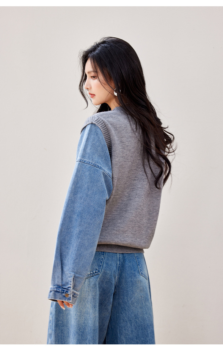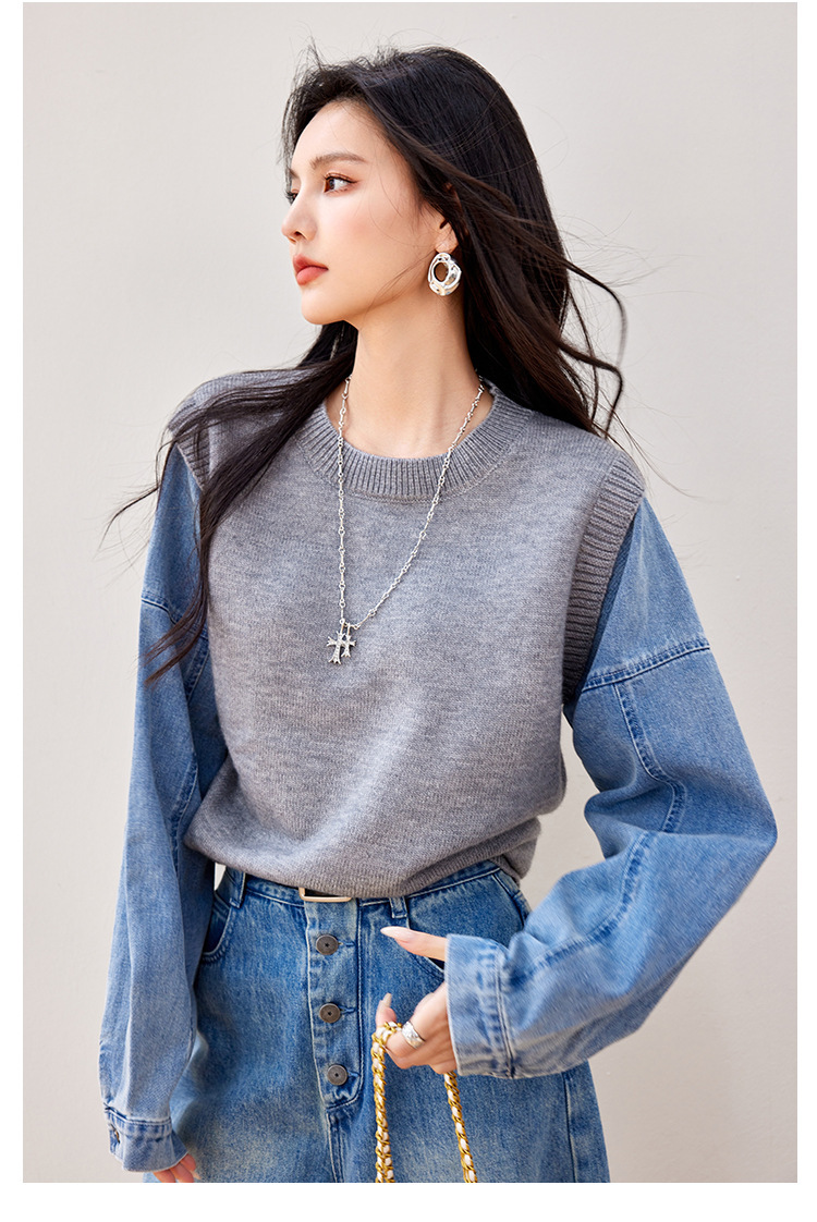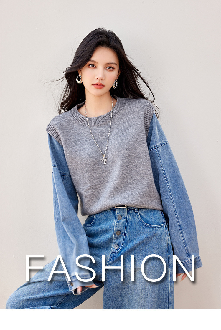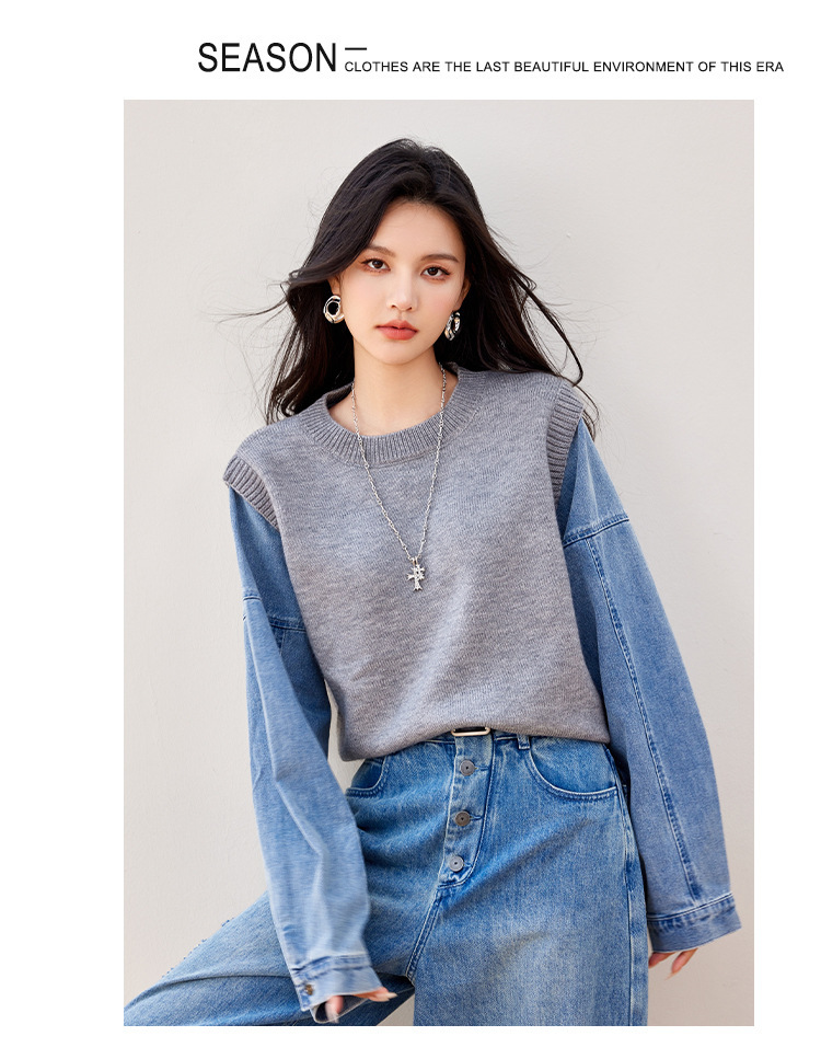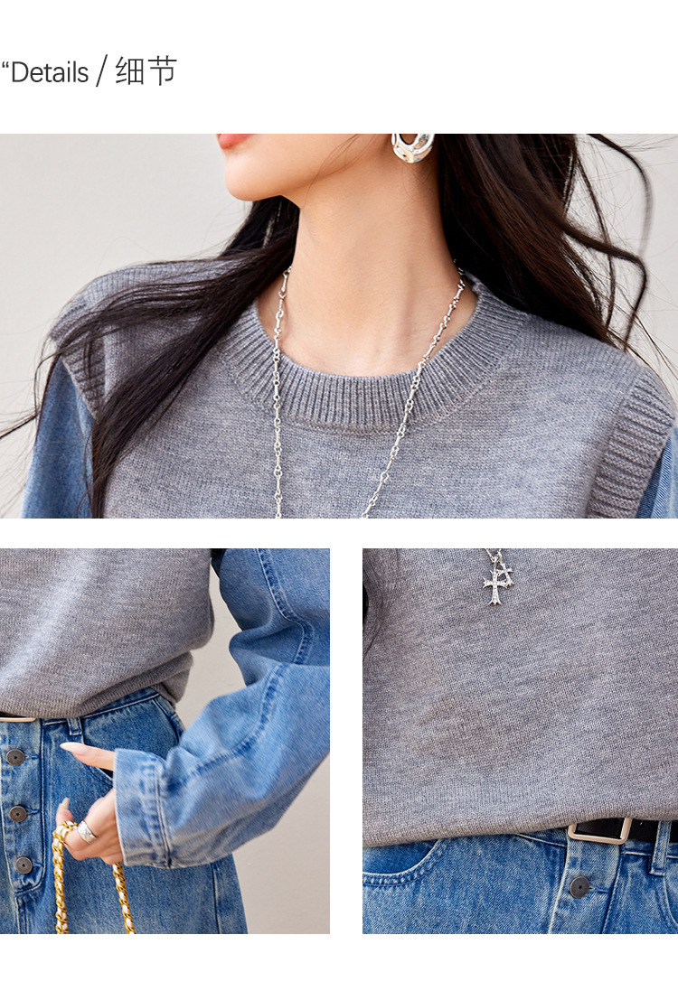 *o-ha-you*【FLKO30386】秋季快時尚牛仔拼接假兩件針織衫氣質套頭圓領上衣