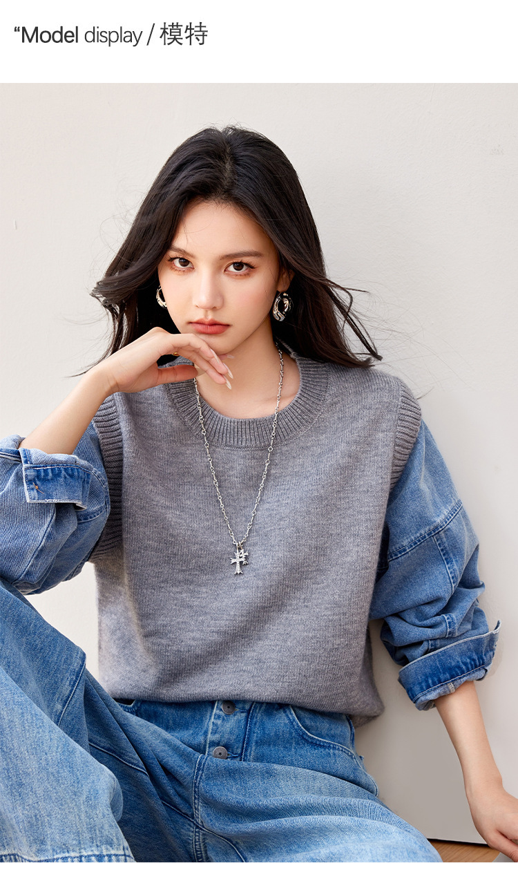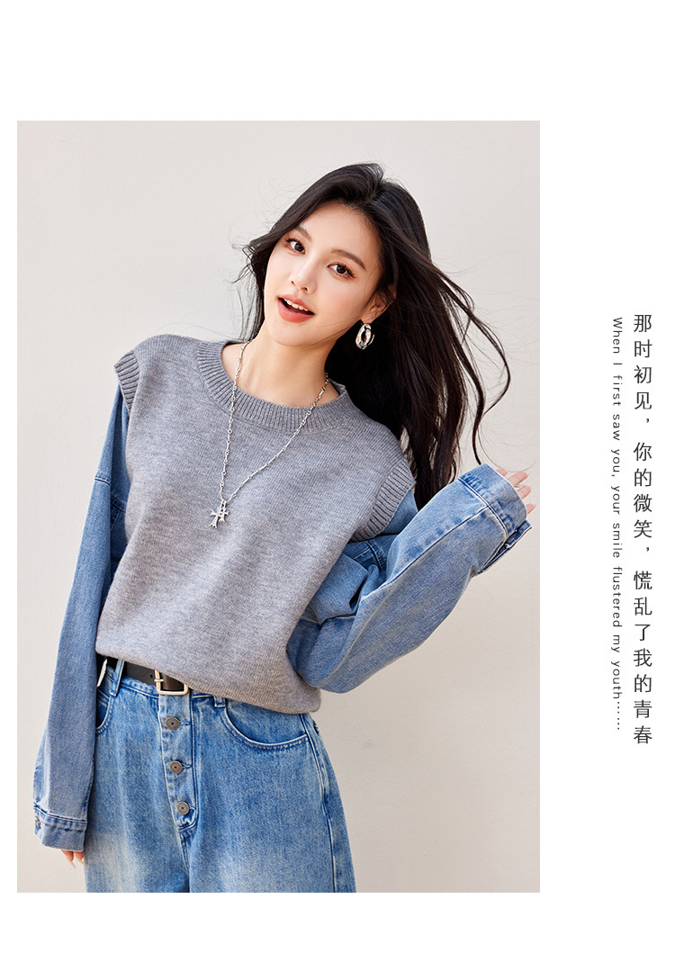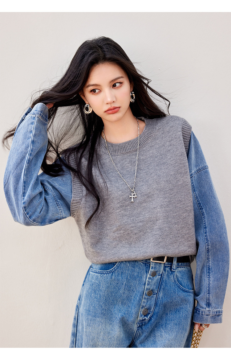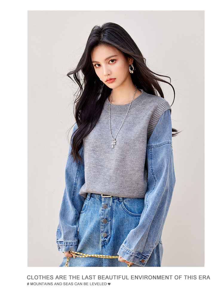 *o-ha-you*【FLKO30386】秋季快時尚牛仔拼接假兩件針織衫氣質套頭圓領上衣