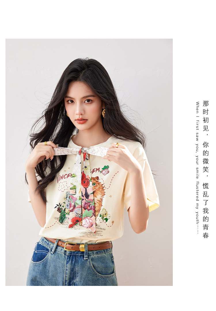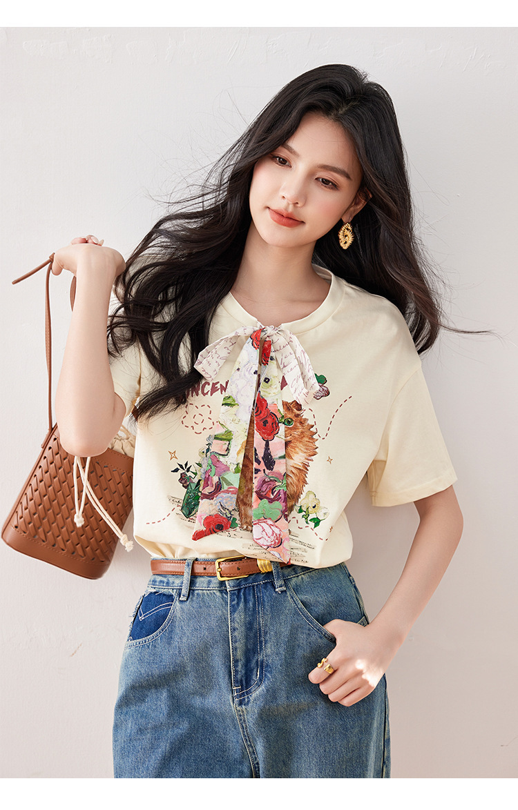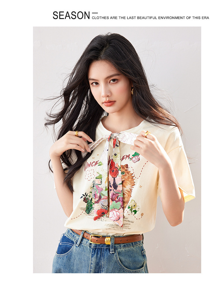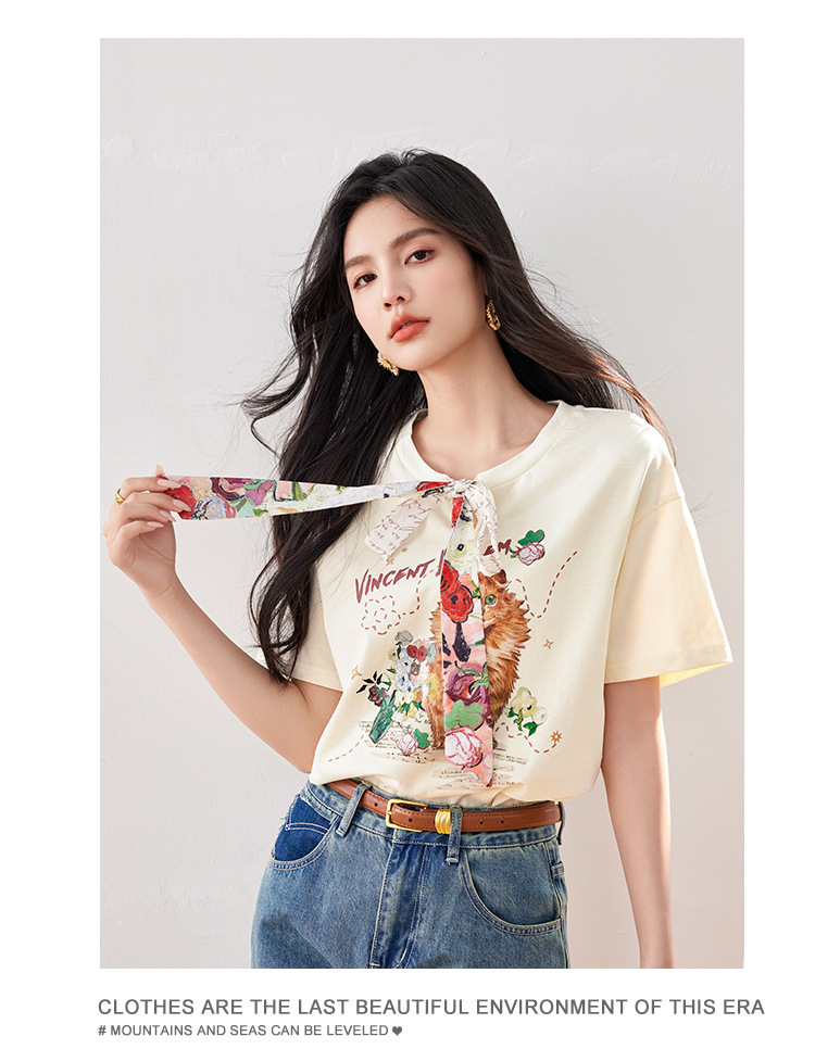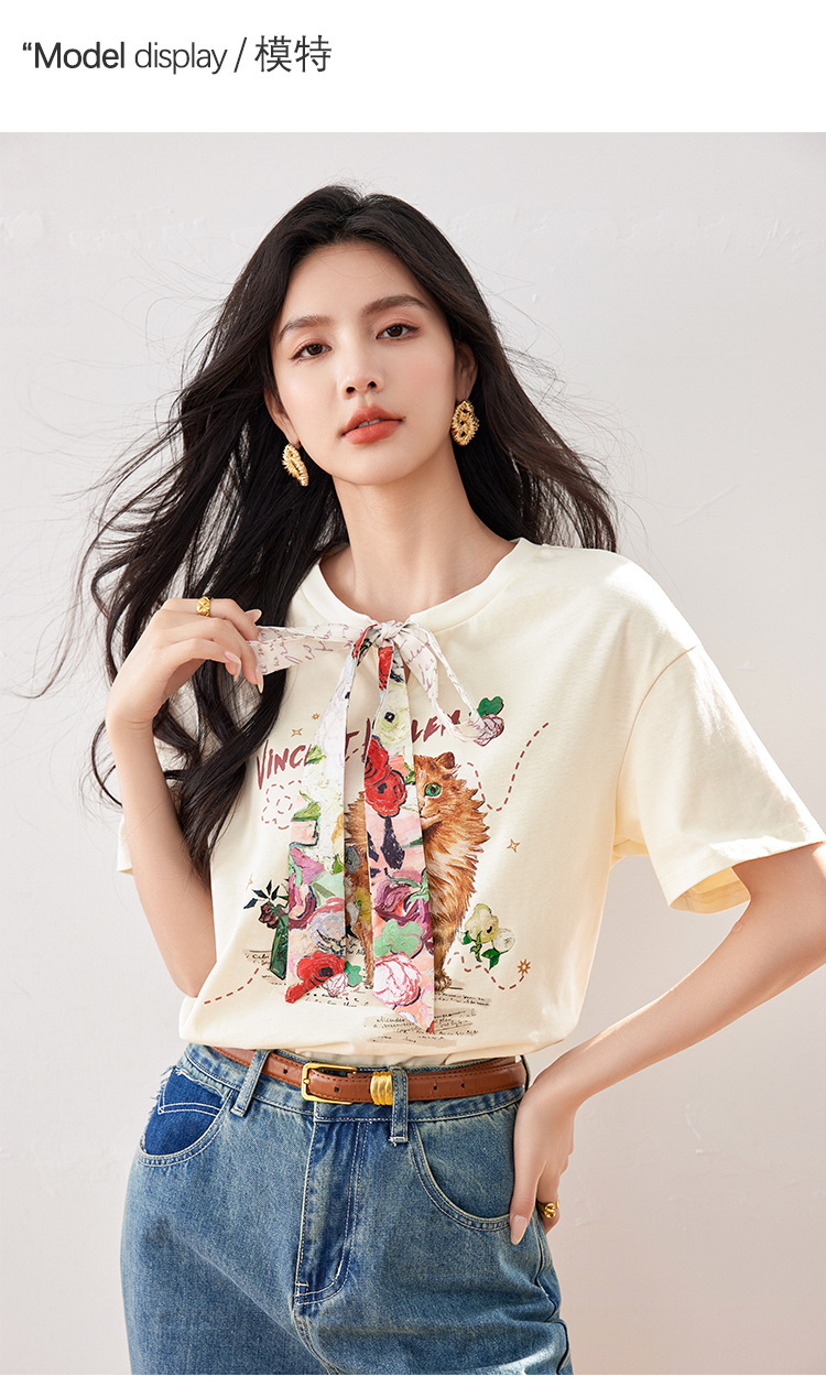 *o-ha-you*【FLKO50122】圓領緞帶時尚亮色貓咪印花設計感短袖T恤2024夏裝短上衣