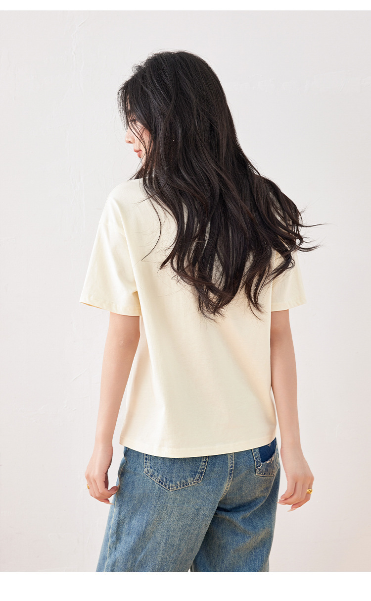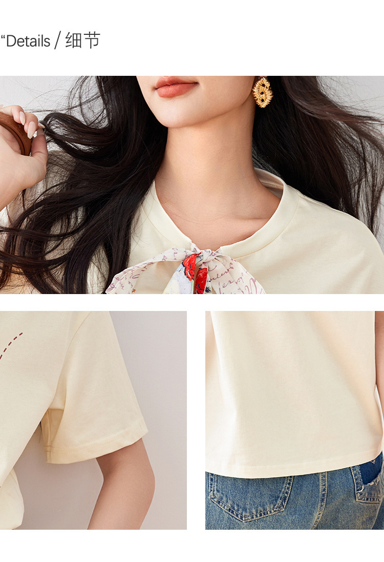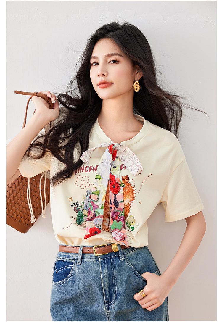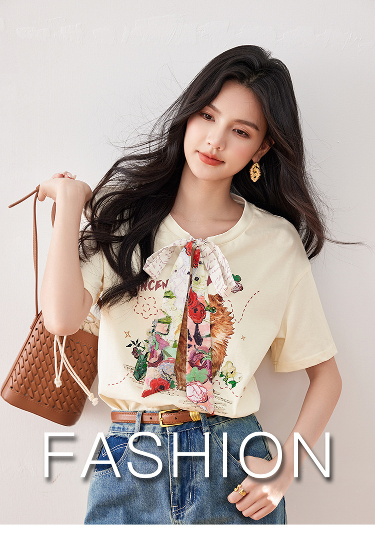 *o-ha-you*【FLKO50122】圓領緞帶時尚亮色貓咪印花設計感短袖T恤2024夏裝短上衣