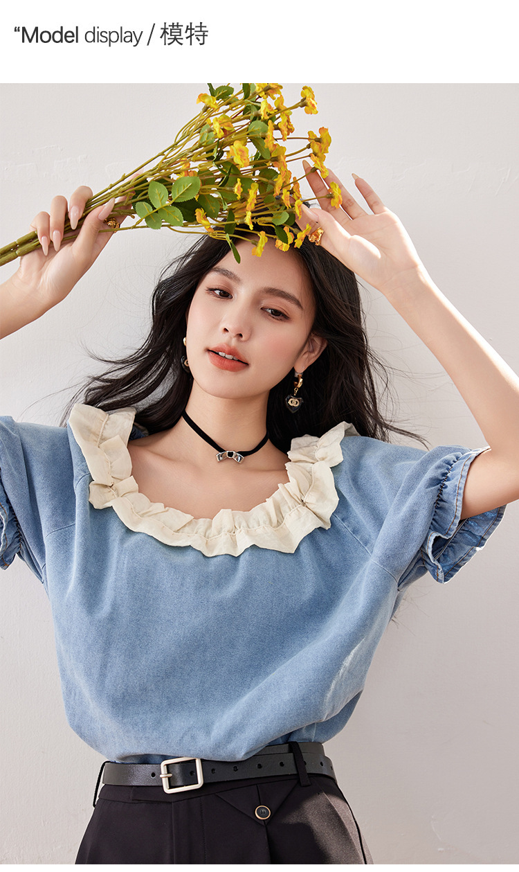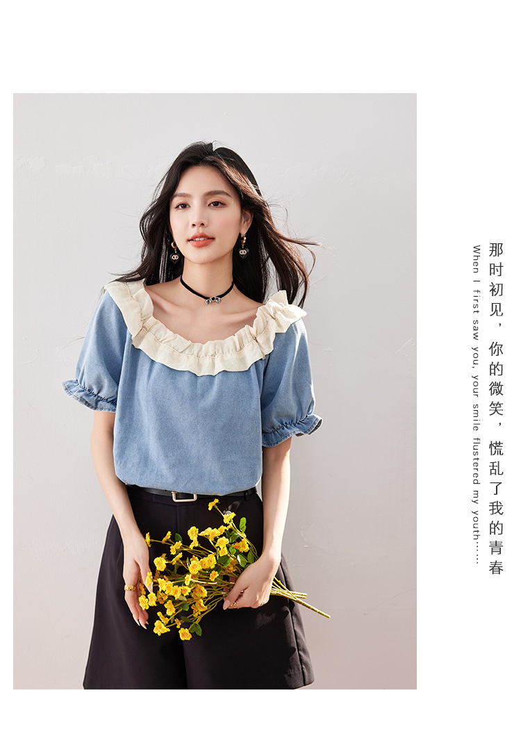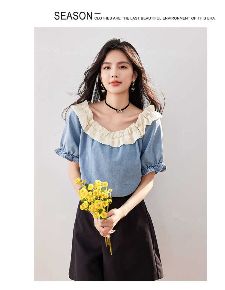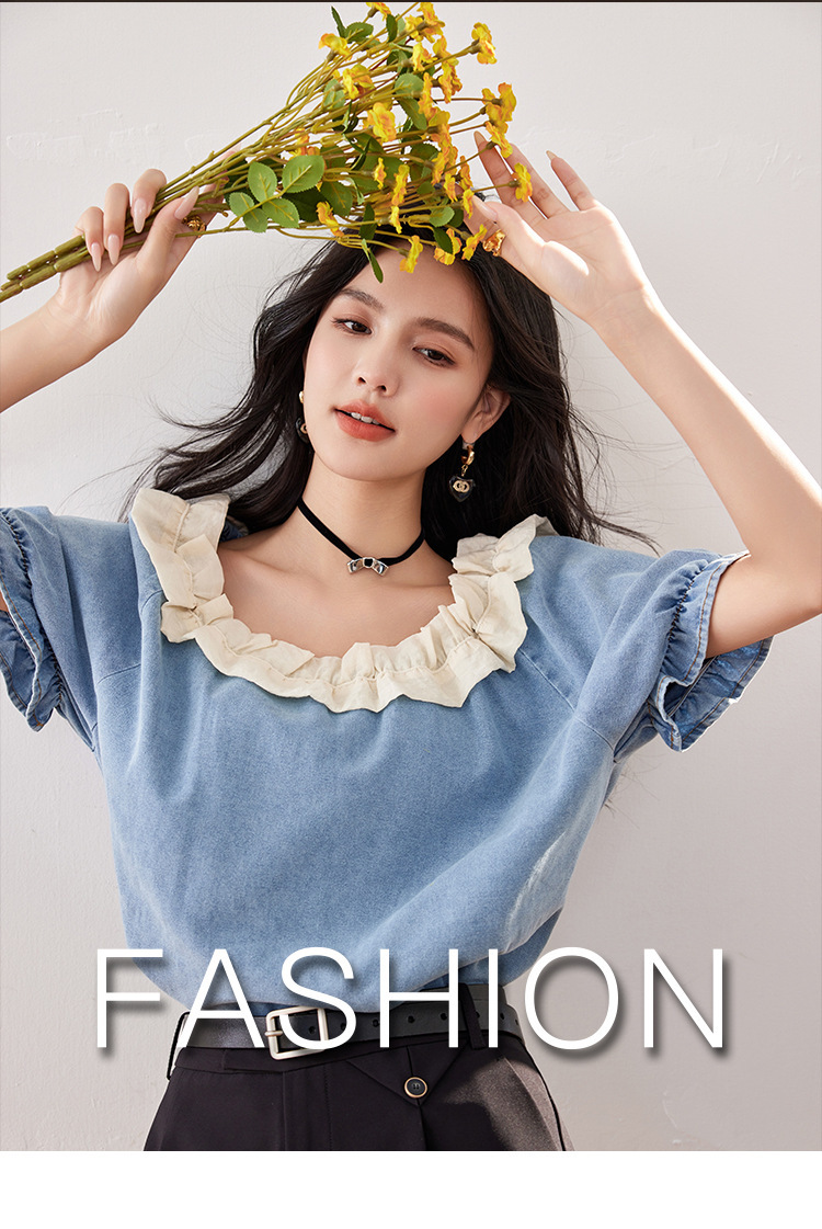 *o-ha-you*【FLKO50126】2024夏牛仔襯衫圓領優雅公主法式小眾寬鬆荷葉邊圓領上衣