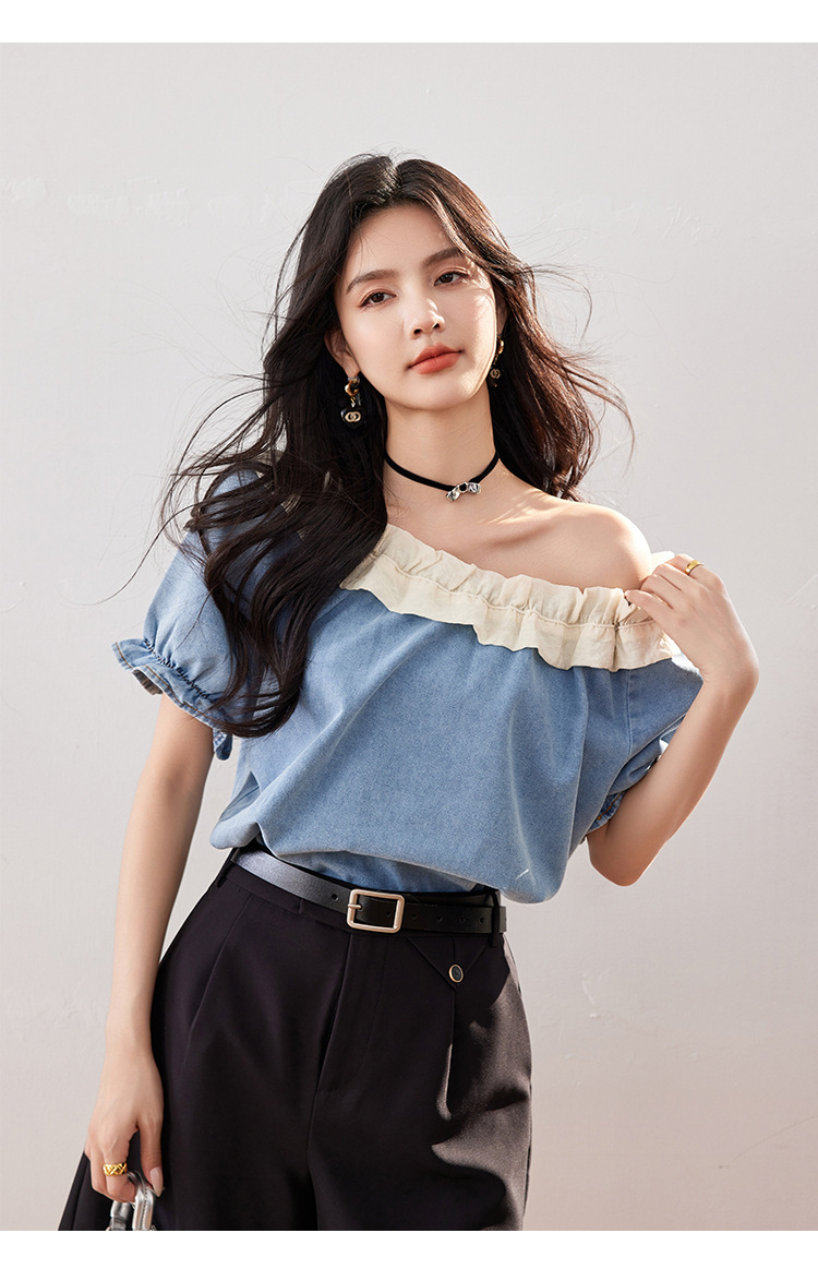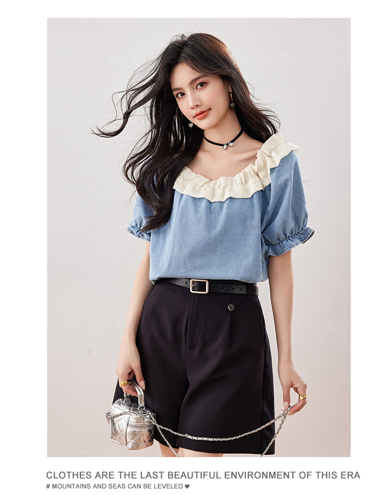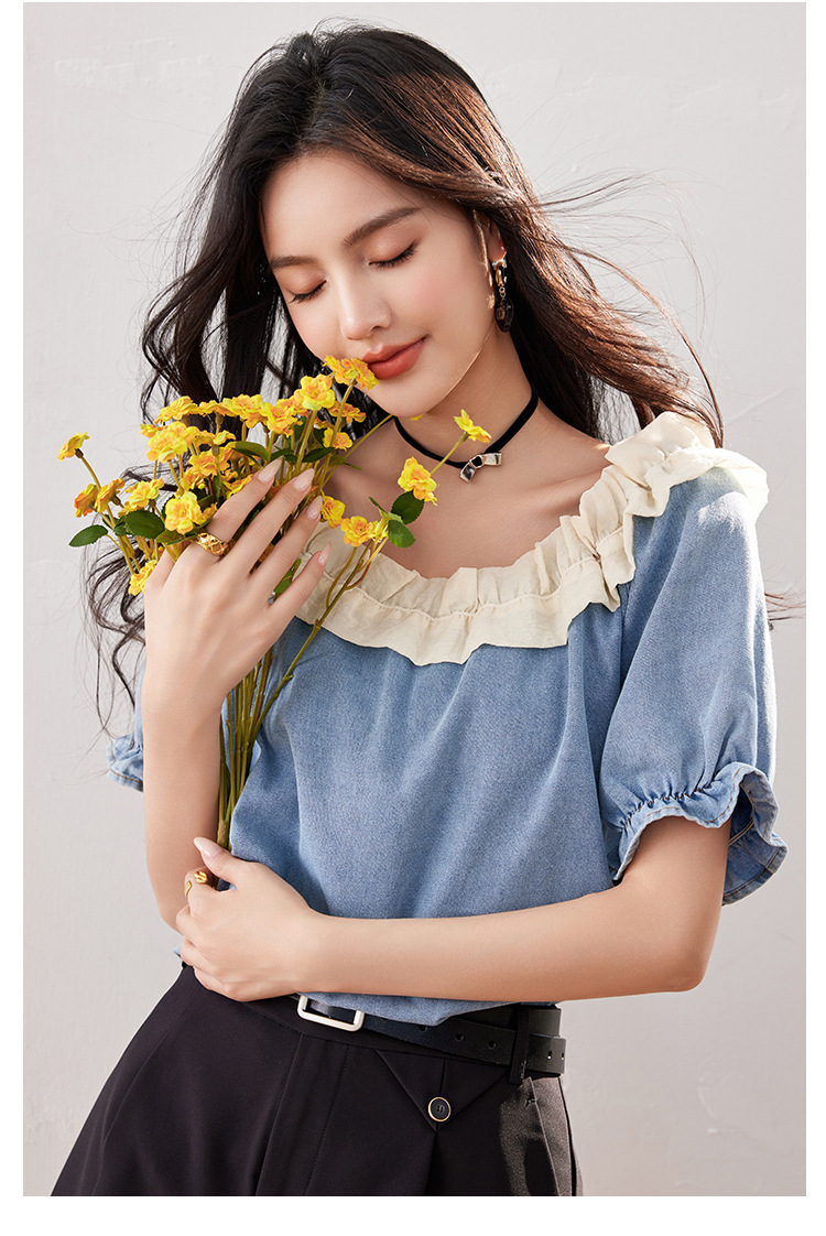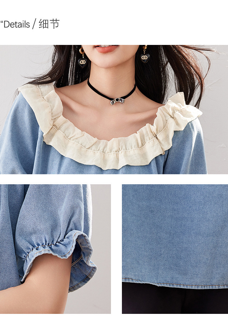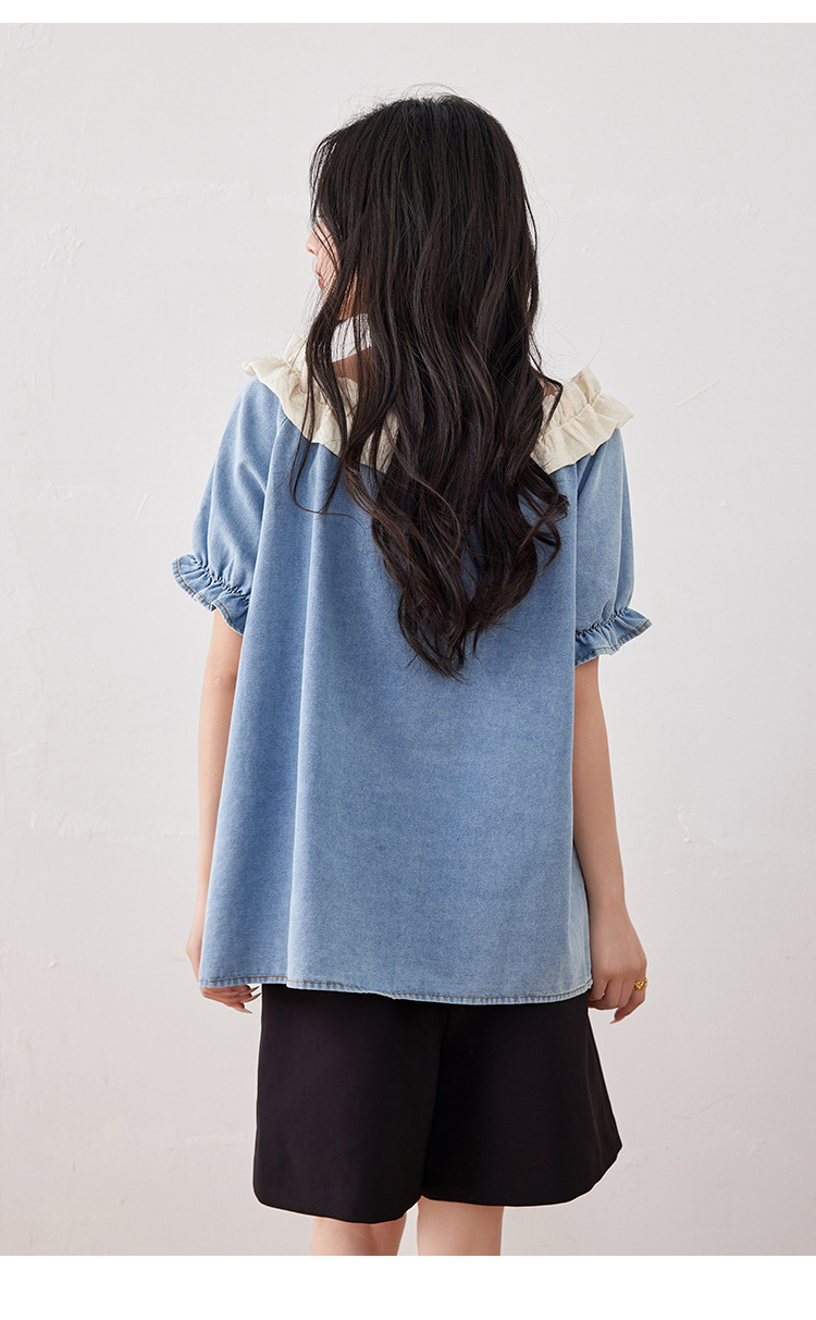 *o-ha-you*【FLKO50126】2024夏牛仔襯衫圓領優雅公主法式小眾寬鬆荷葉邊圓領上衣