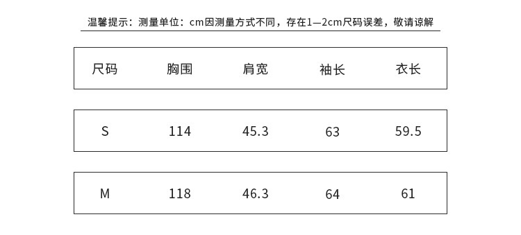 衣長/肩寬/袖長為平量,其他為一圈(單位:公分)