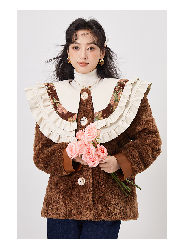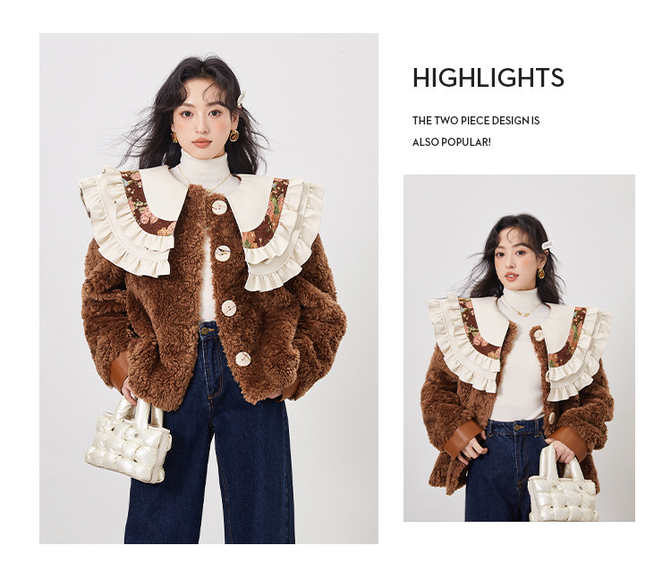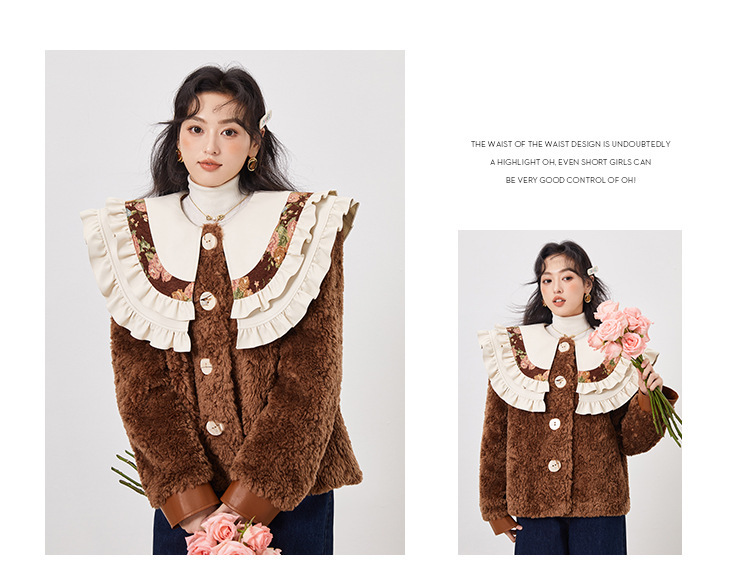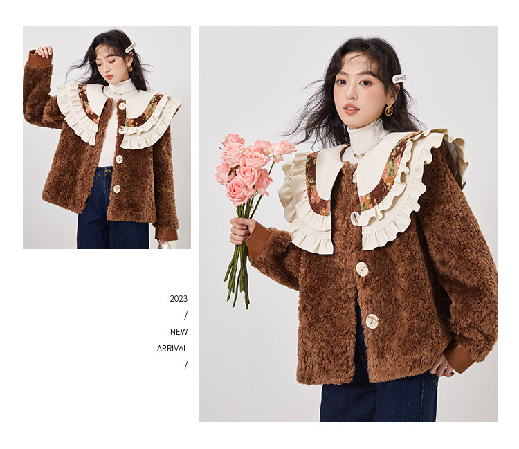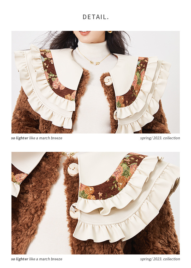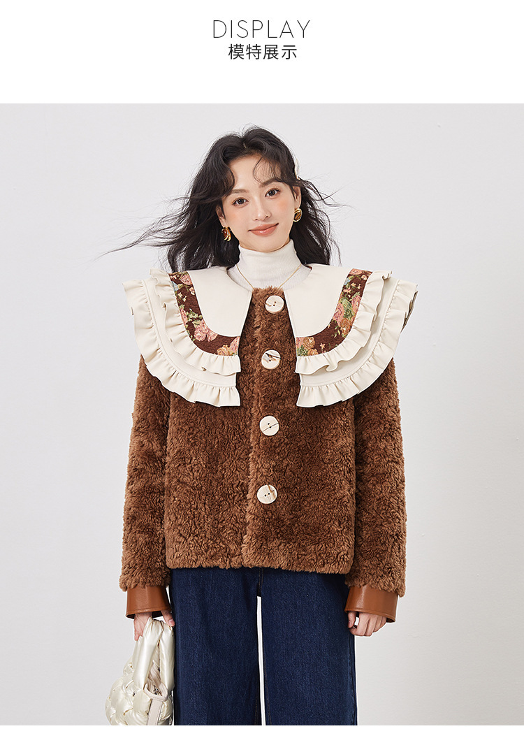 *o-ha-you*【FLKS10089】2023冬復古法式荷葉邊仿羊羔毛皮草美拉德咖皮毛一體外套