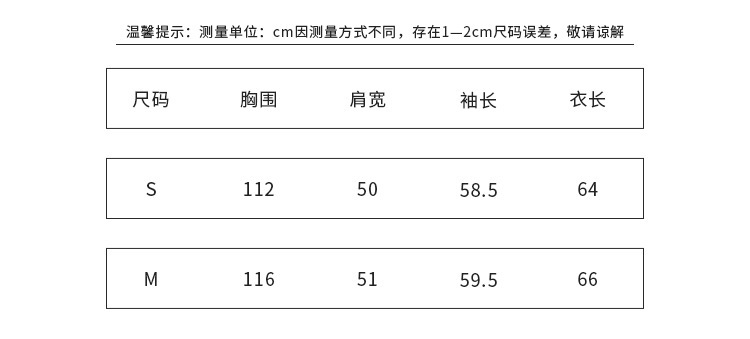衣長/肩寬/袖長為平量,其他為一圈(單位:公分)