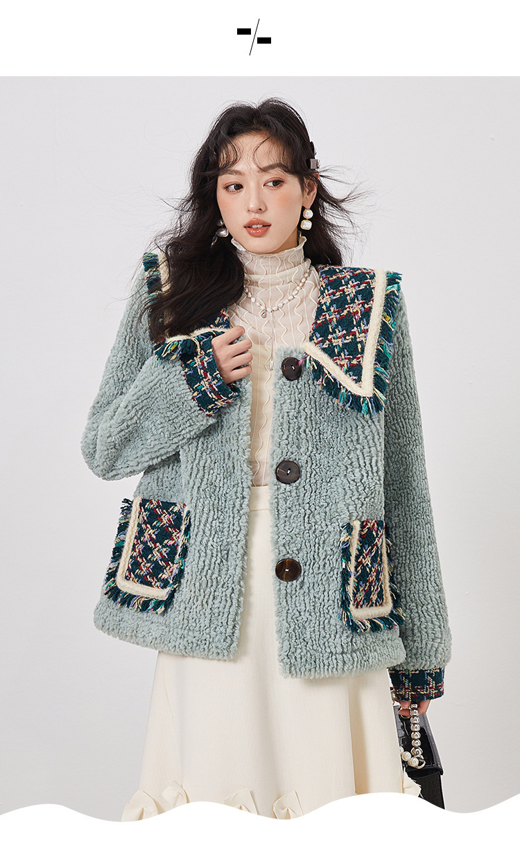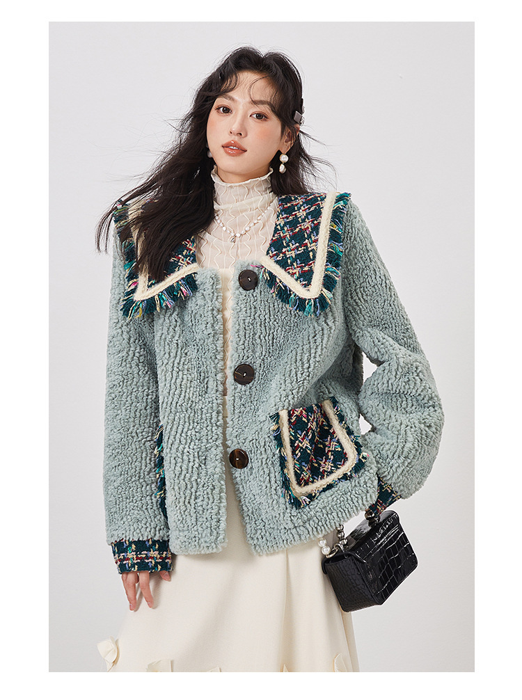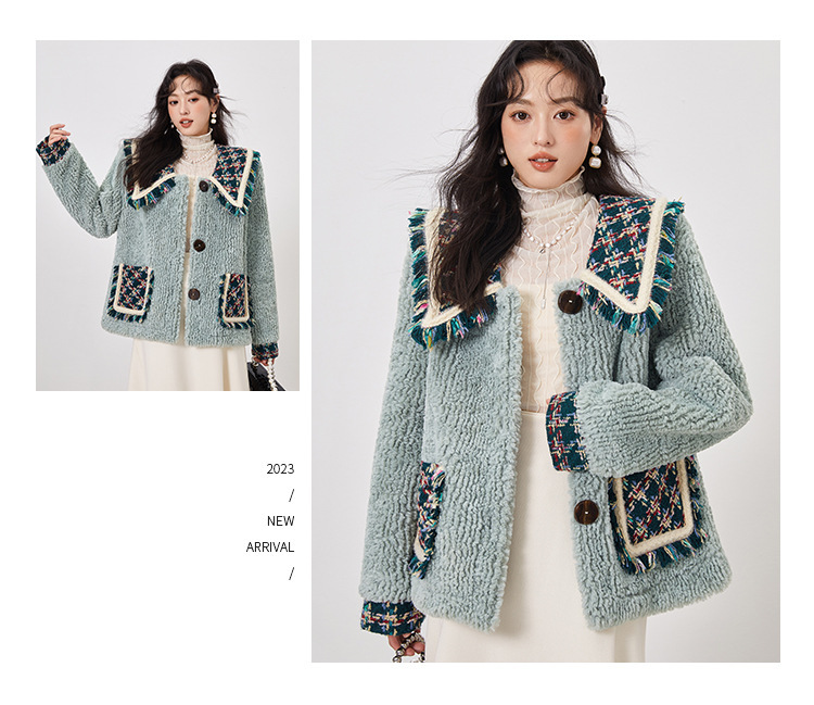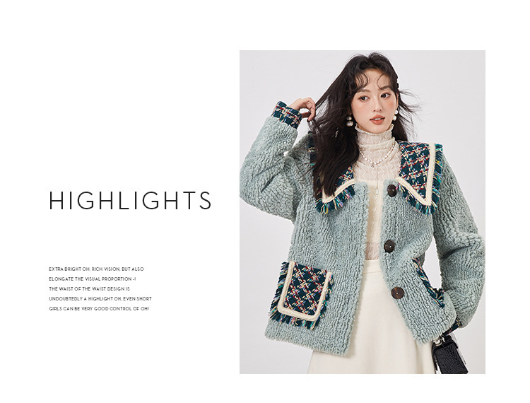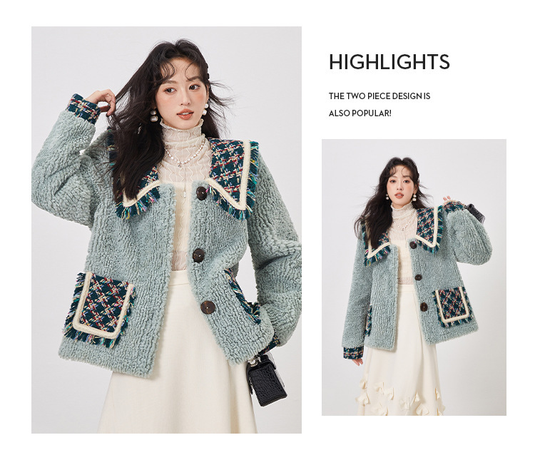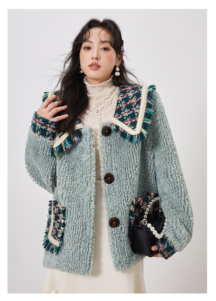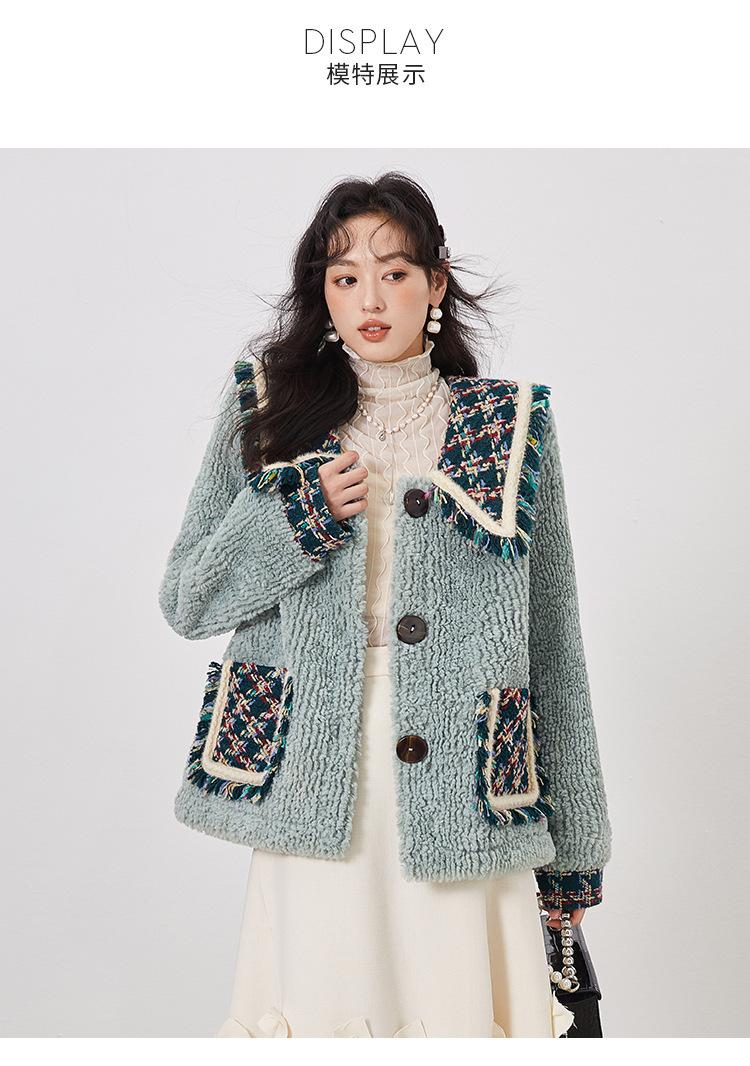 *o-ha-you*【FLKS10093】2023冬季復古法式豆綠色流蘇邊仿羊捲毛皮毛一體外套皮草