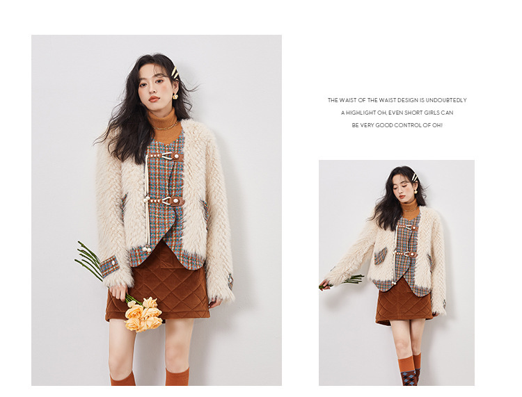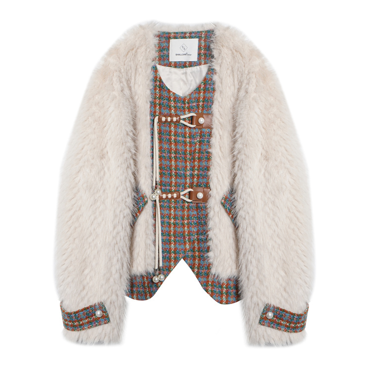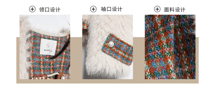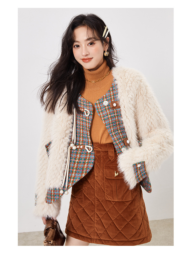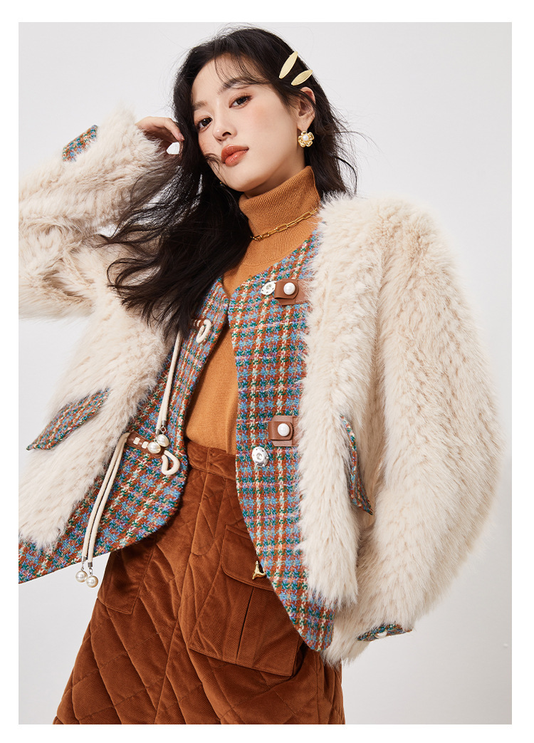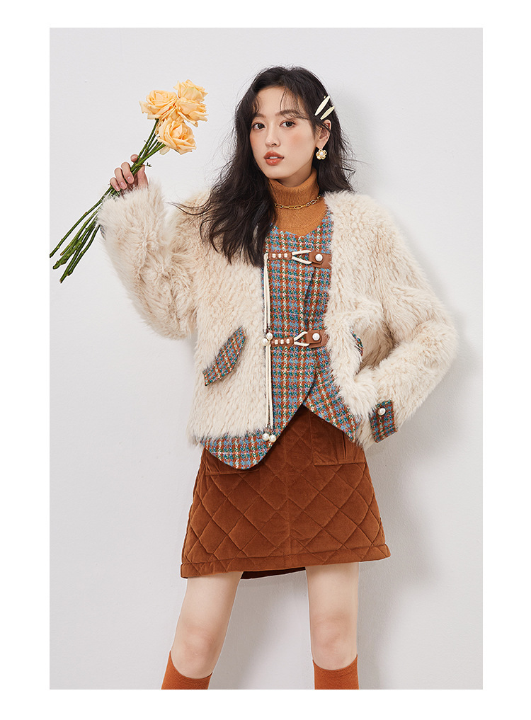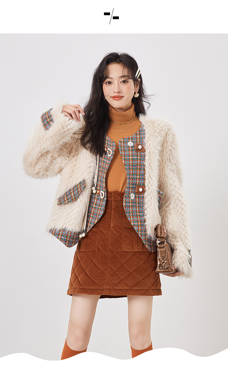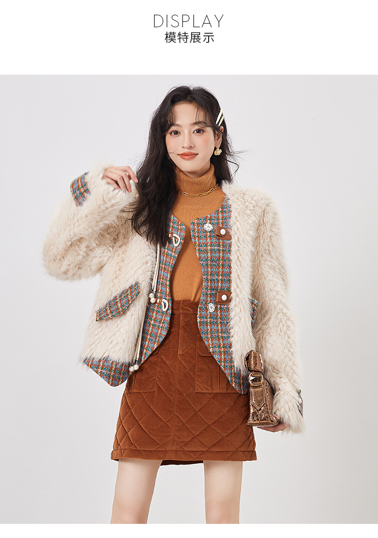 *o-ha-you*【FLKS10096】冬季復古法式粗花呢圓領毛絨外套拼接撞色環保毛絨絨皮草