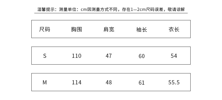衣長/肩寬/袖長為平量,其他為一圈(單位:公分)