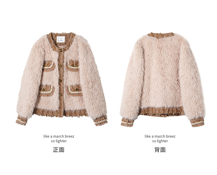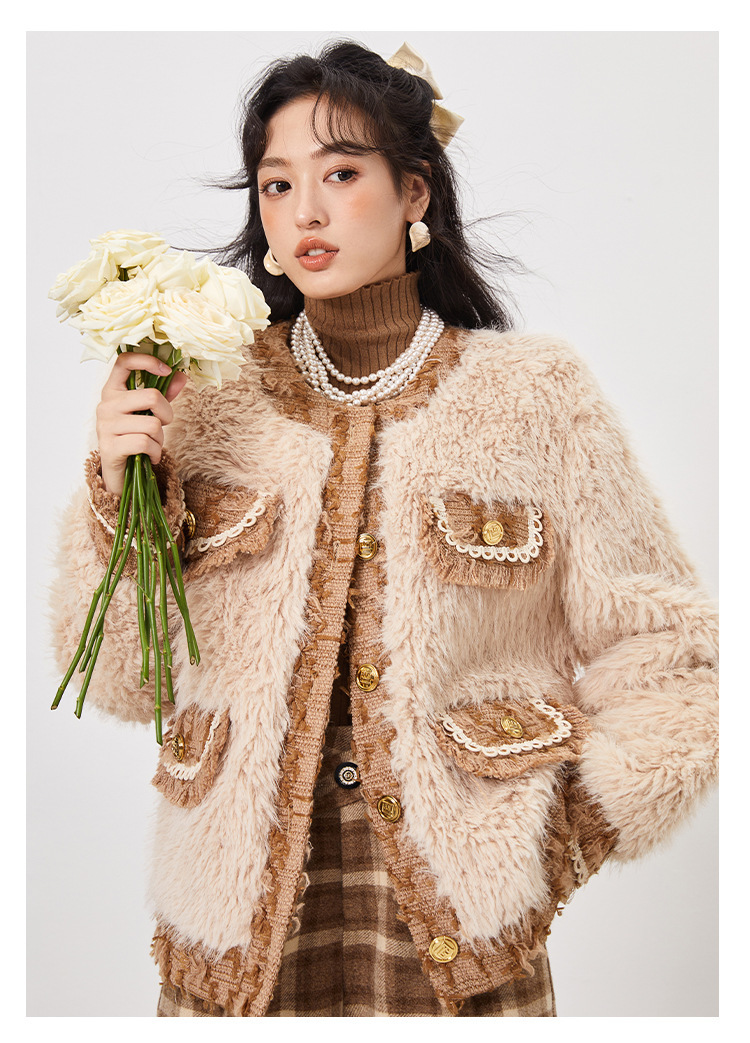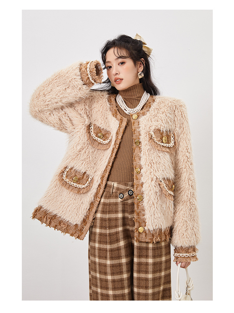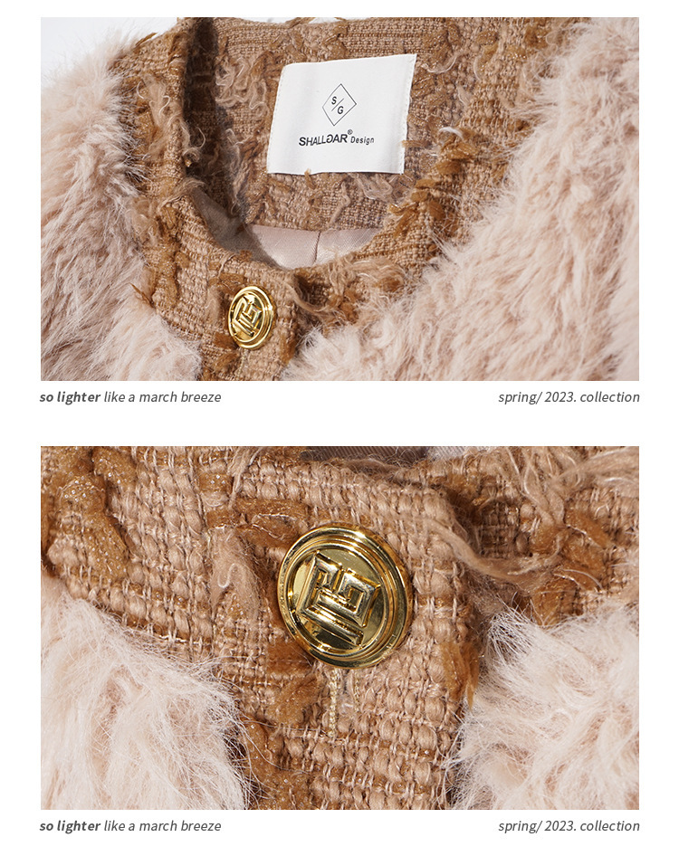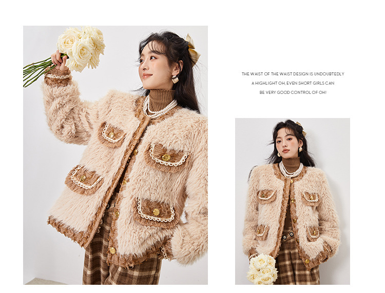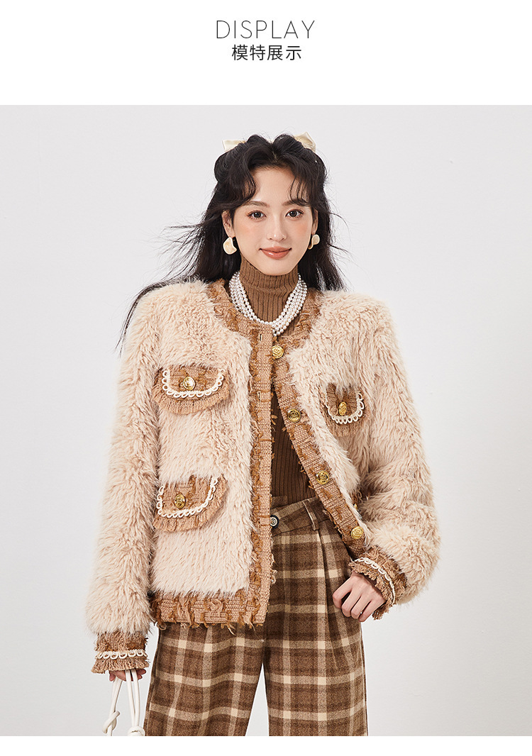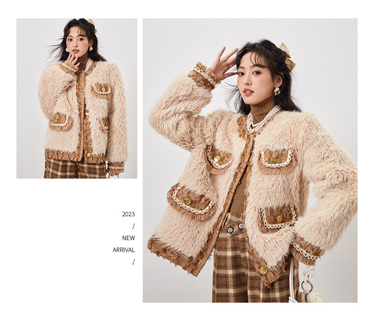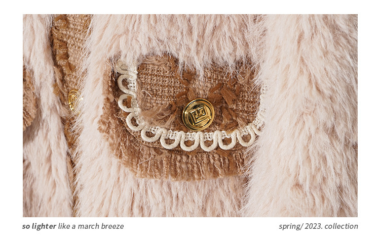 *o-ha-you*【FLKS10116】2023冬季復古法式小香風蕾絲淺駝色環保皮草毛絨保暖外套