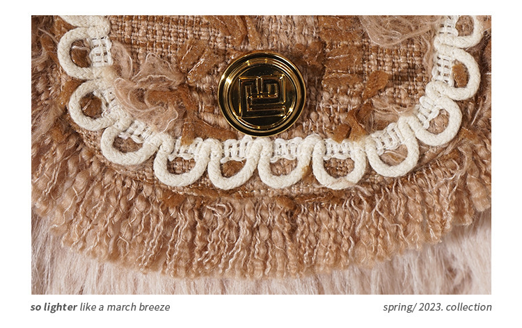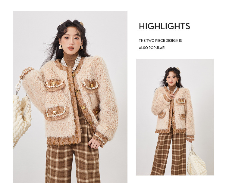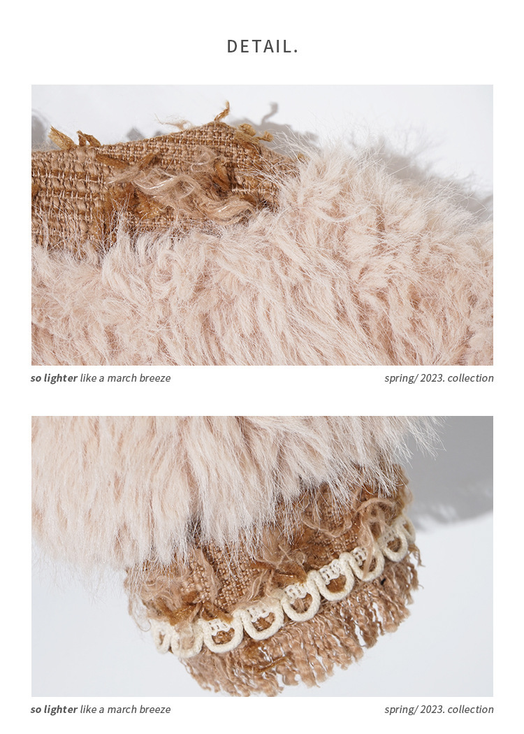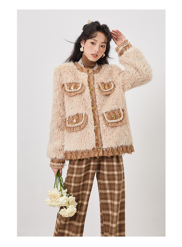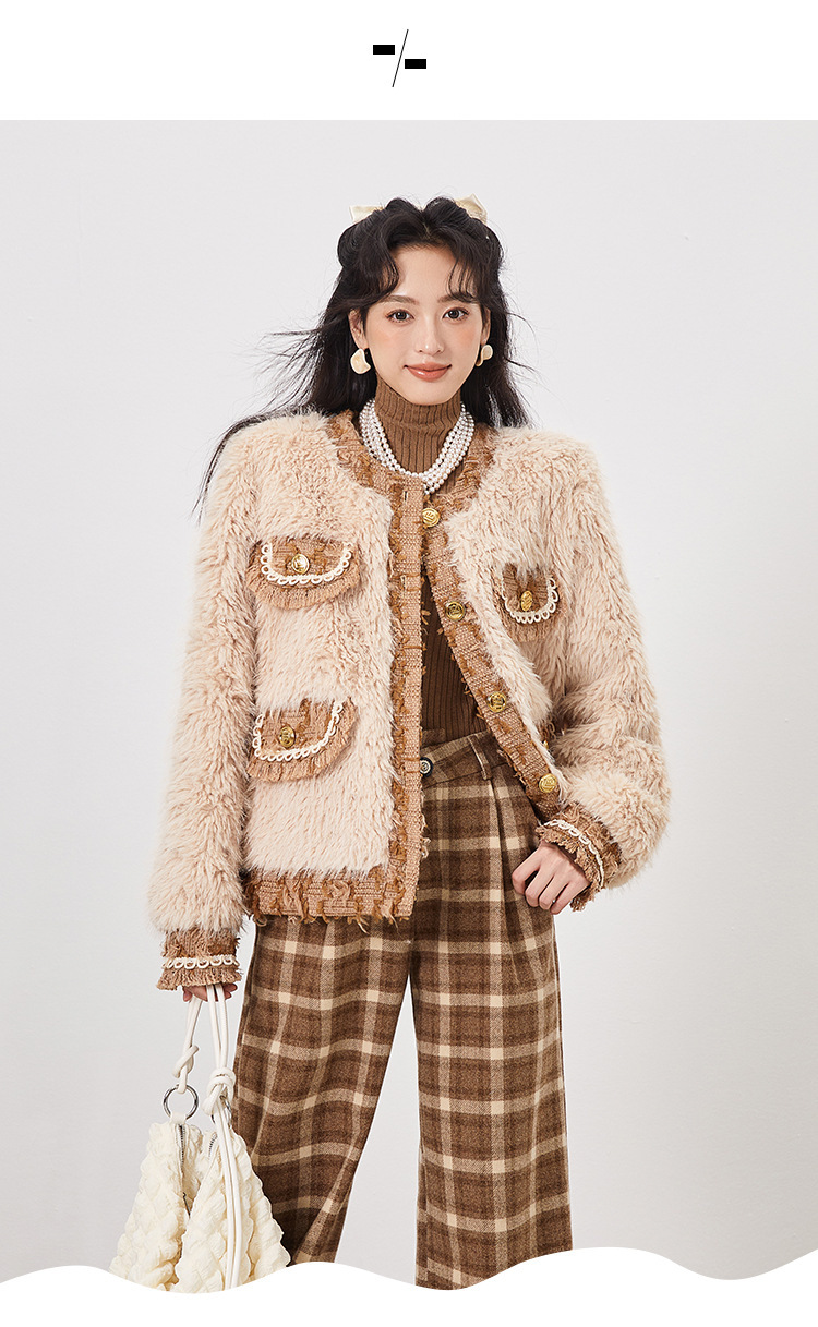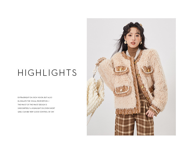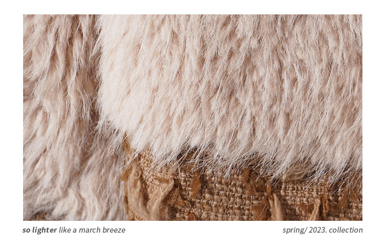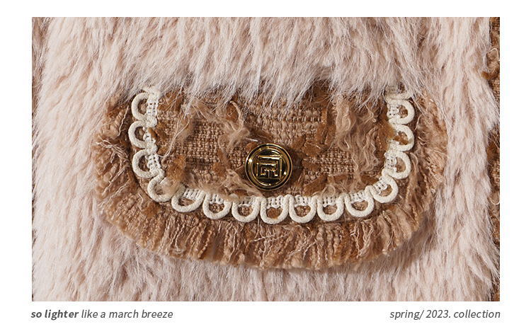 *o-ha-you*【FLKS10116】2023冬季復古法式小香風蕾絲淺駝色環保皮草毛絨保暖外套