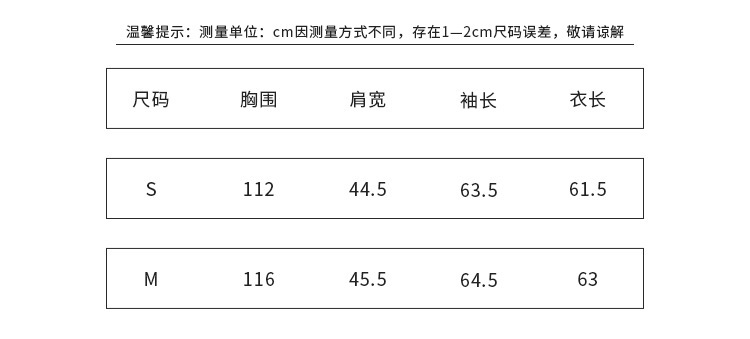 衣長/肩寬/袖長為平量,其他為一圈(單位:公分)