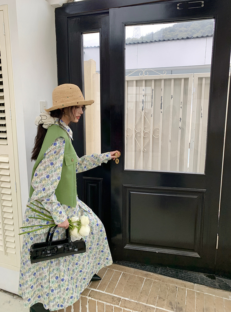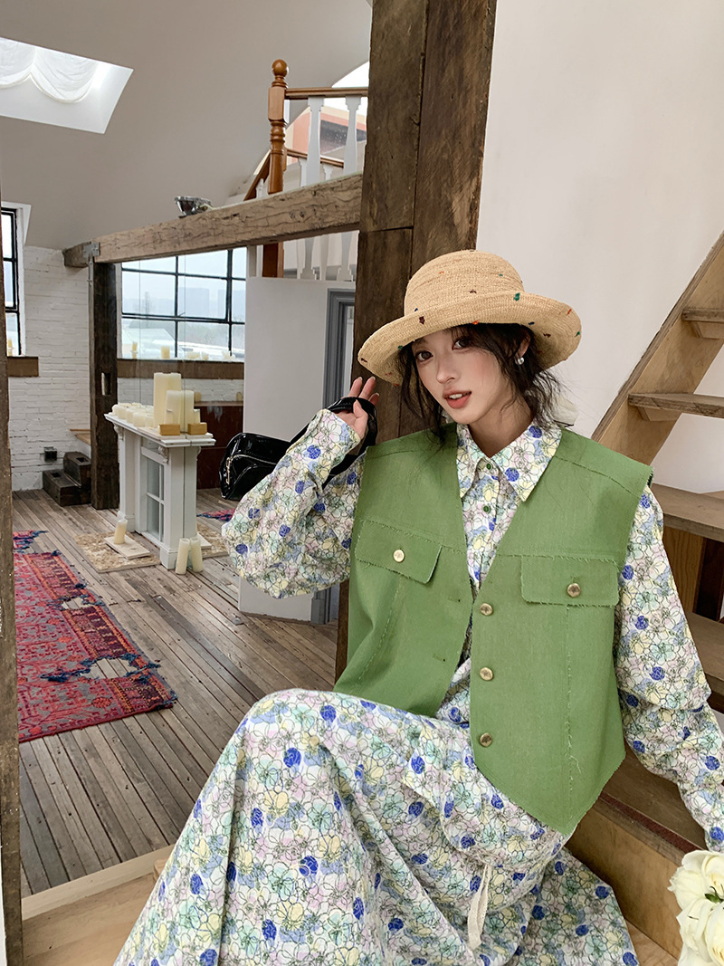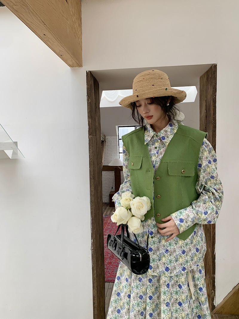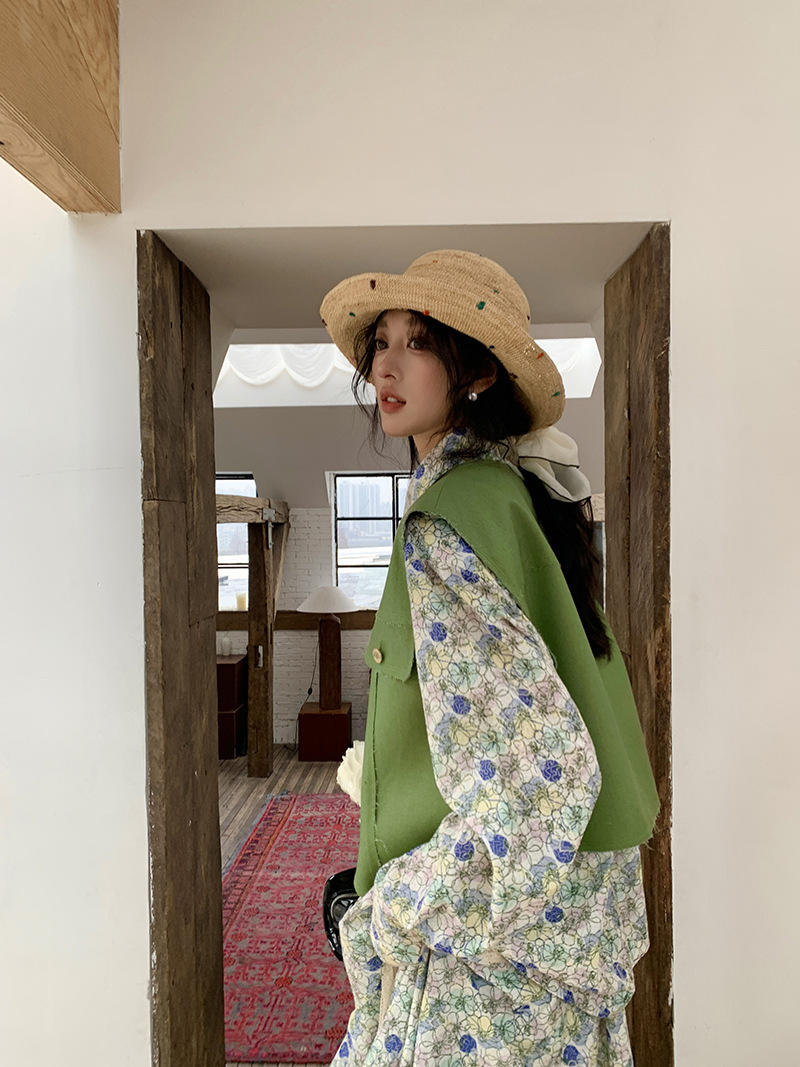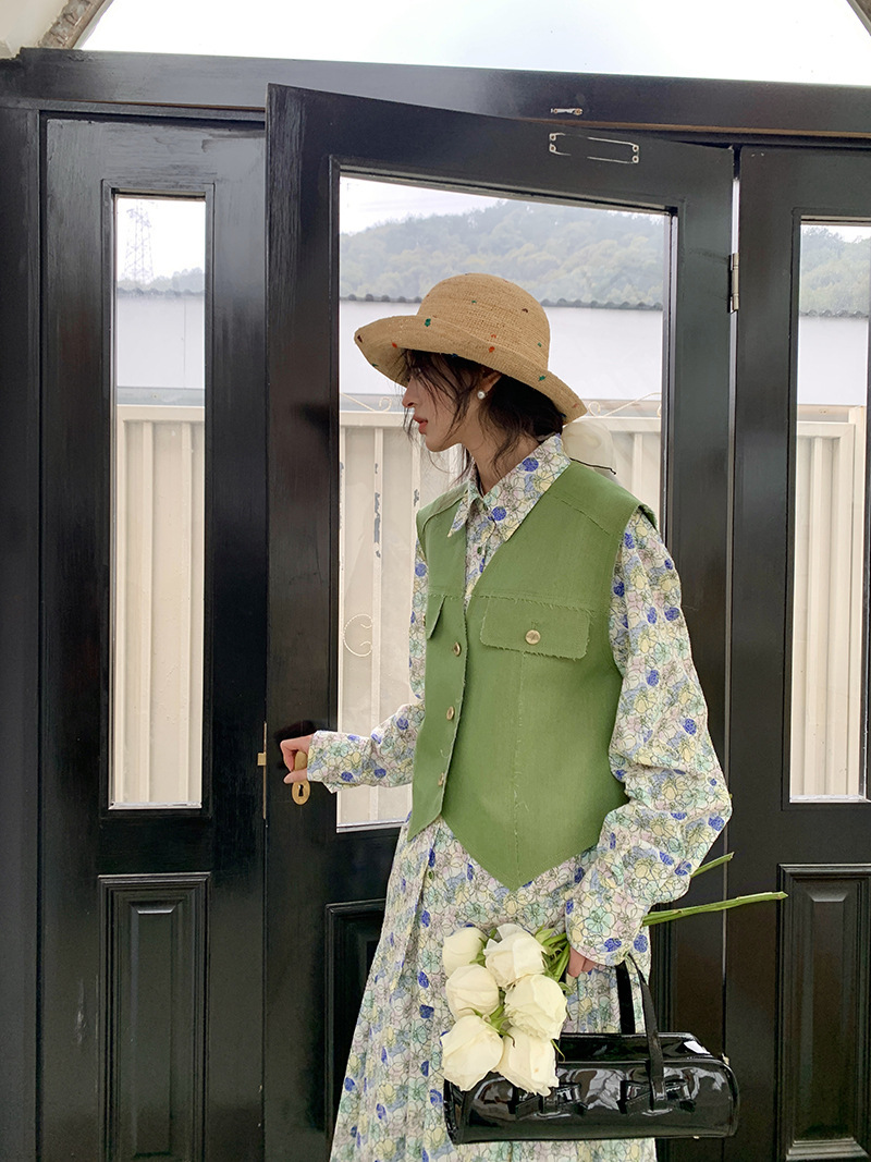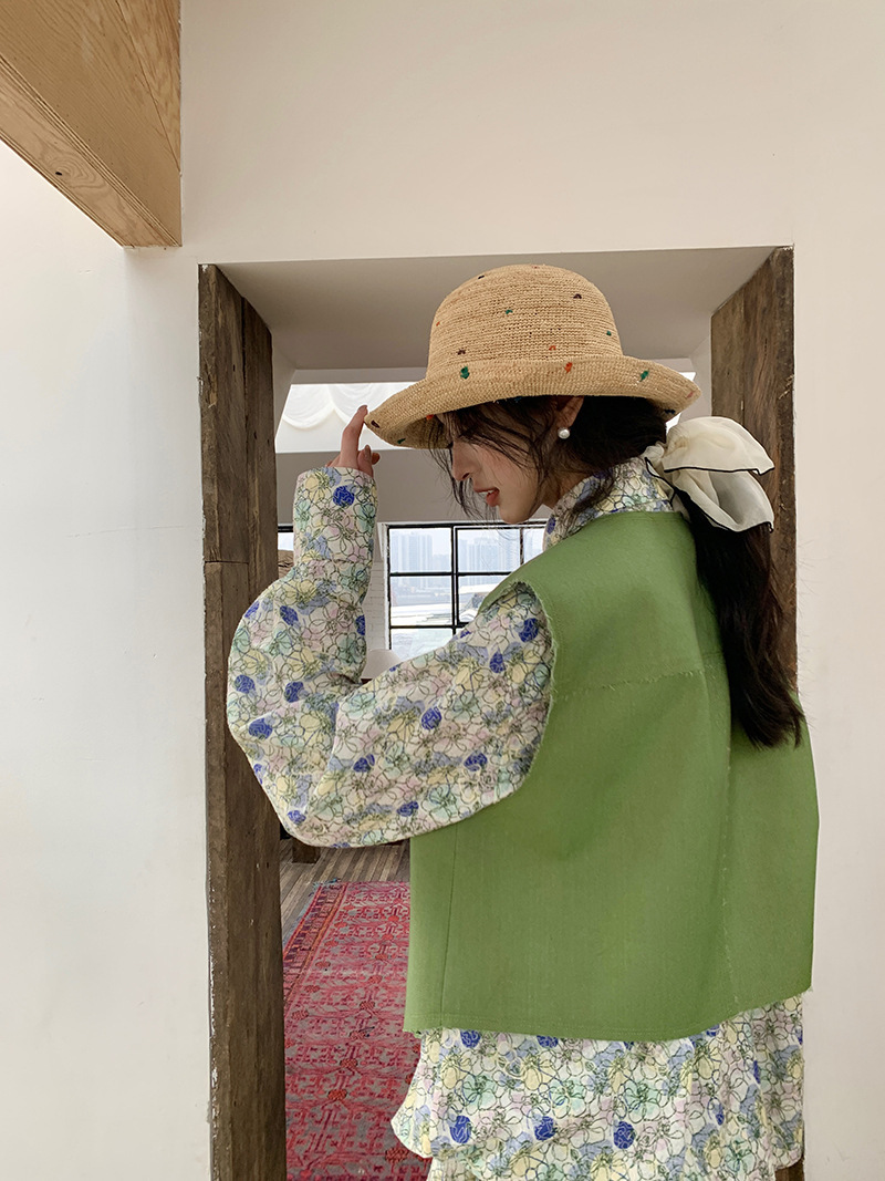 *o-ha-you*【FLKS10128】復古法式田園風草綠色馬甲寬鬆輪廓切割毛邊無袖外套馬夾
