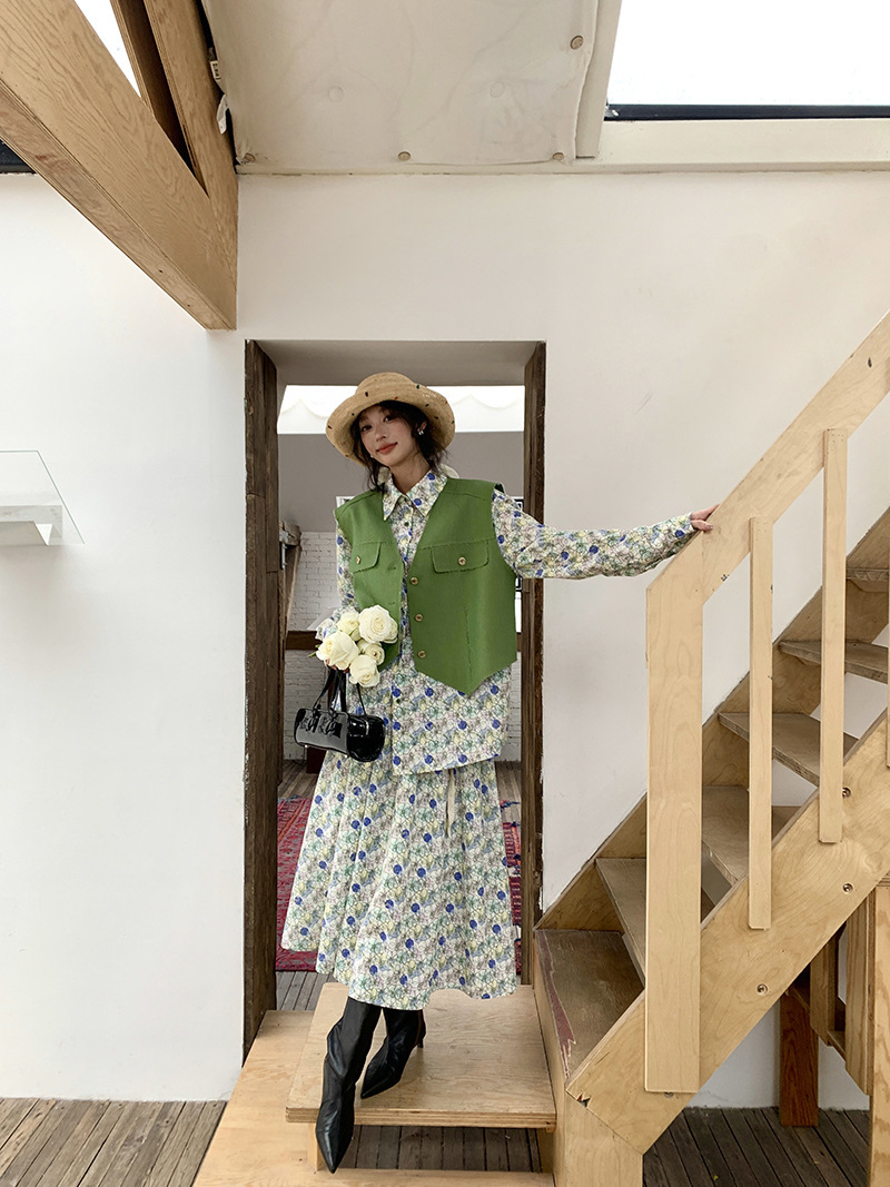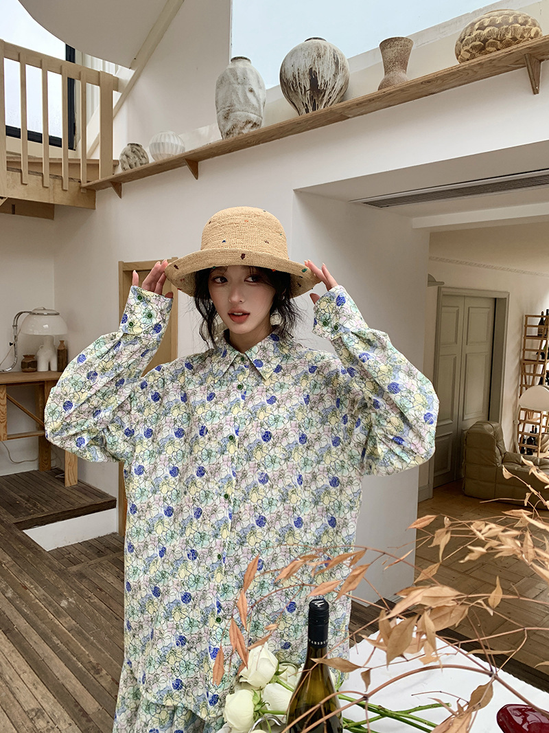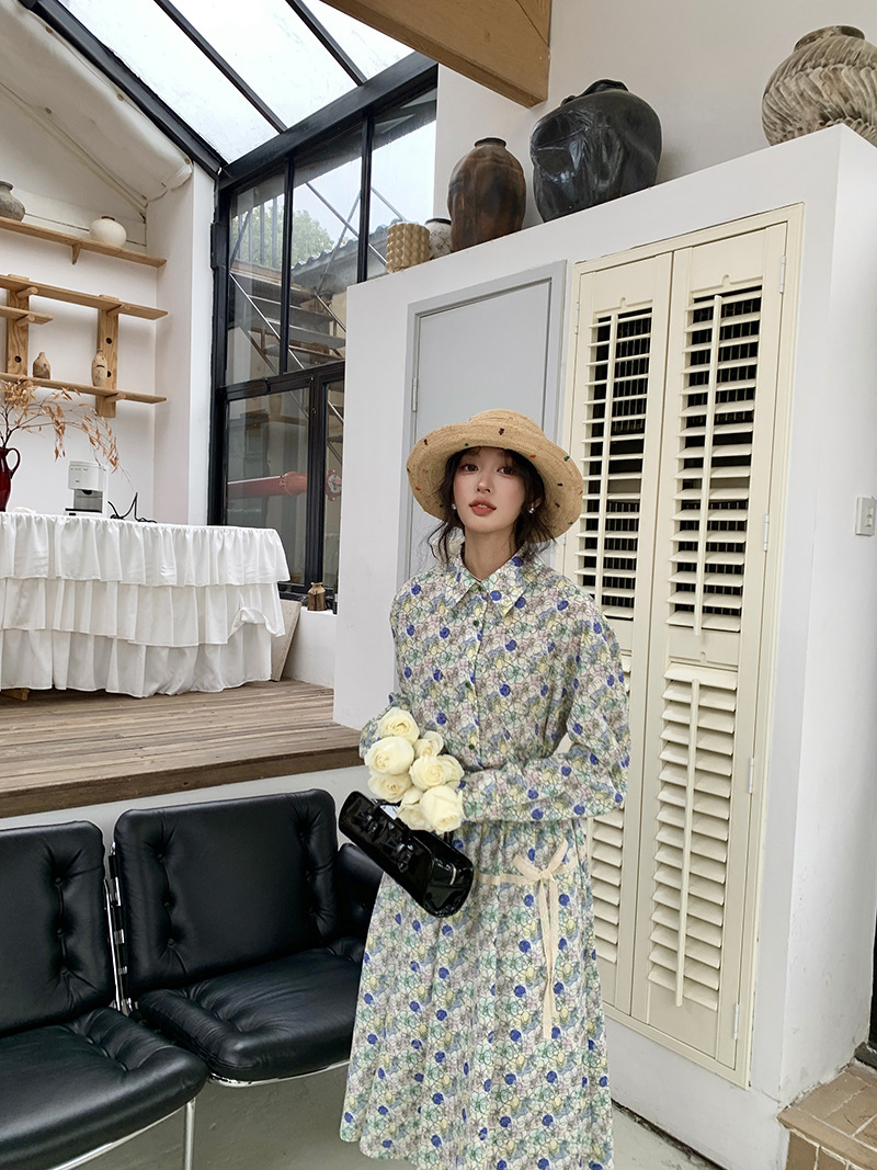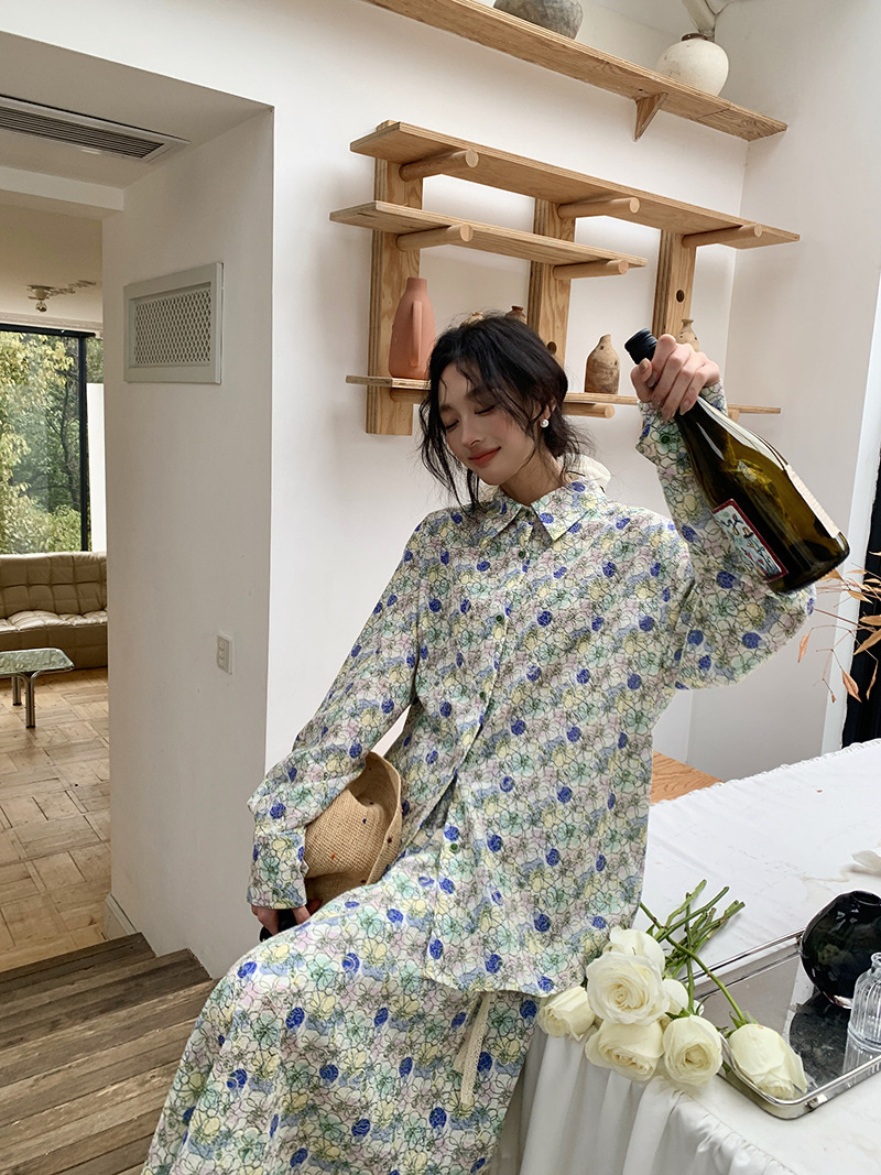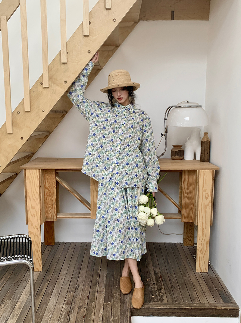 *o-ha-you*【FLKS10129】復古法式田園碎花刺繡長袖襯衫高腰蕾絲大擺長裙套裝